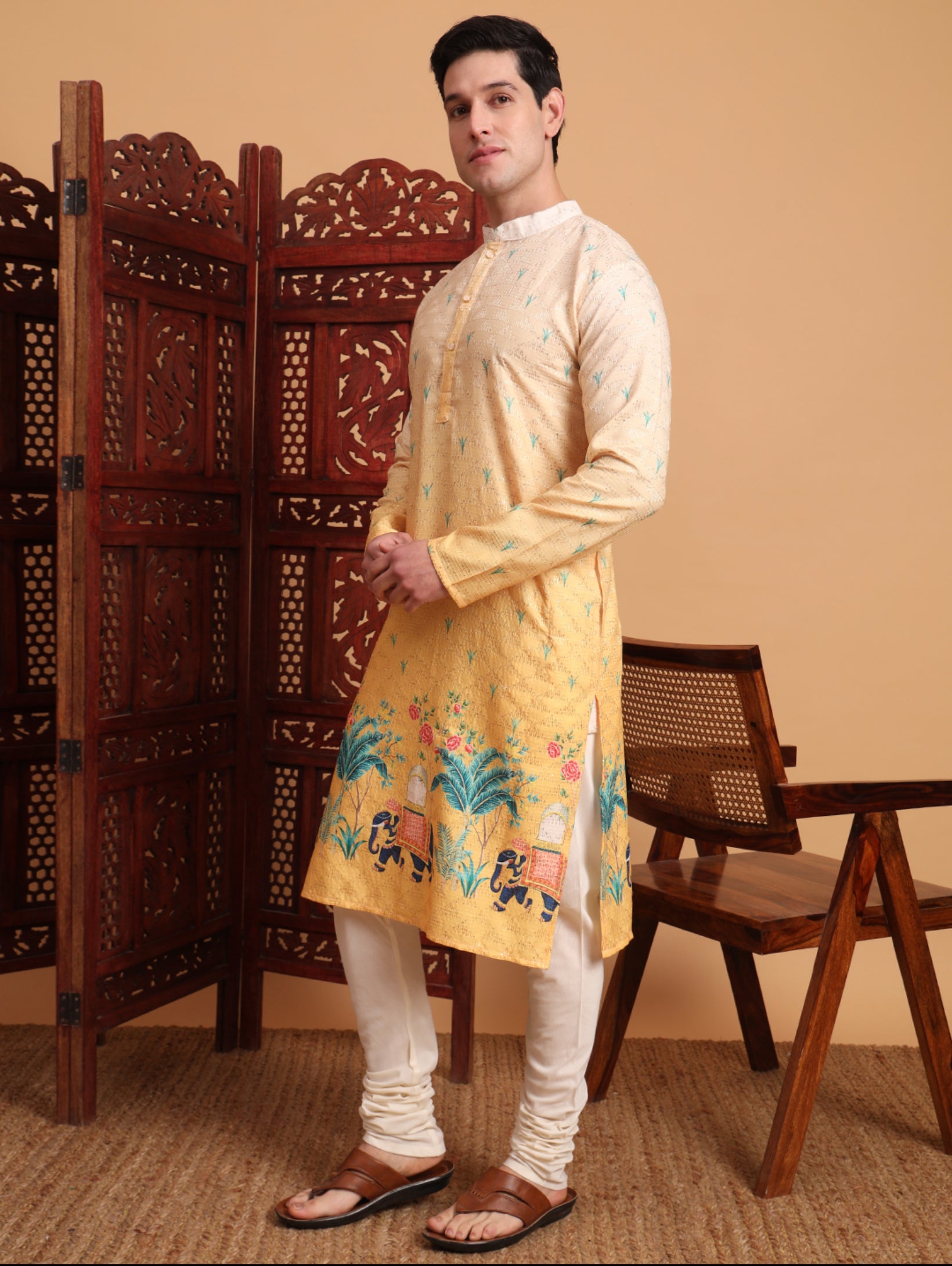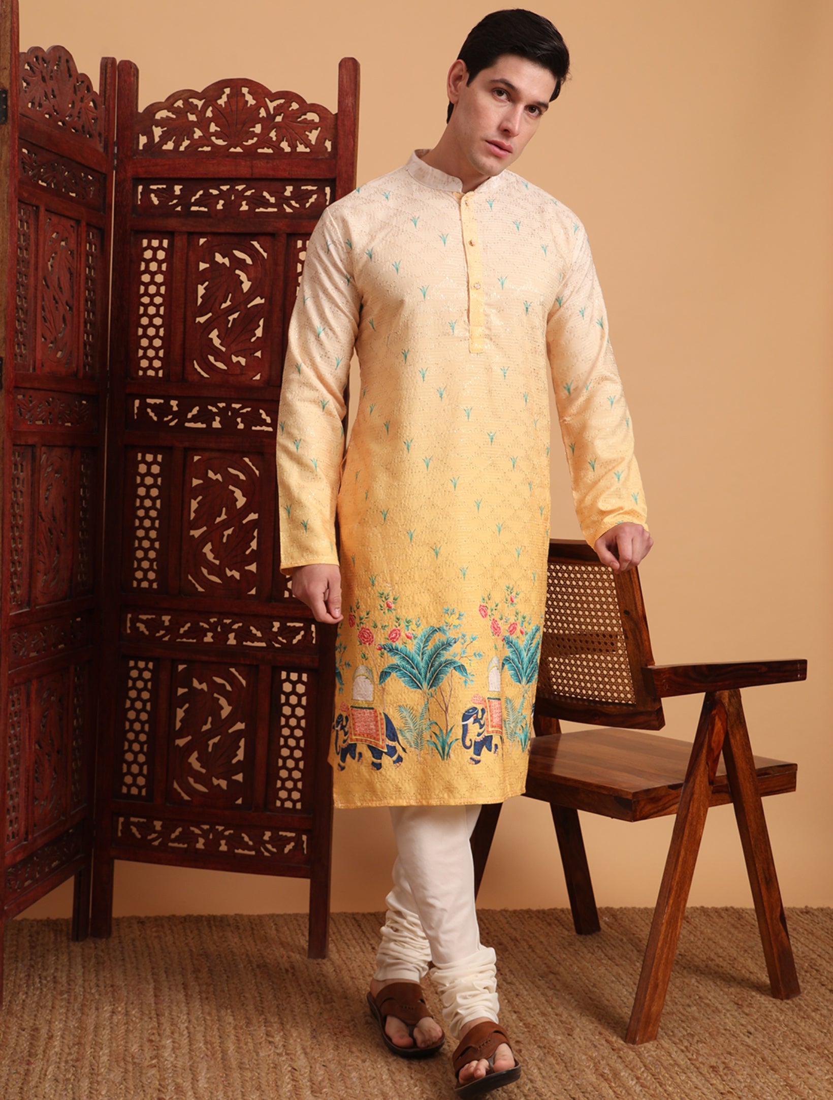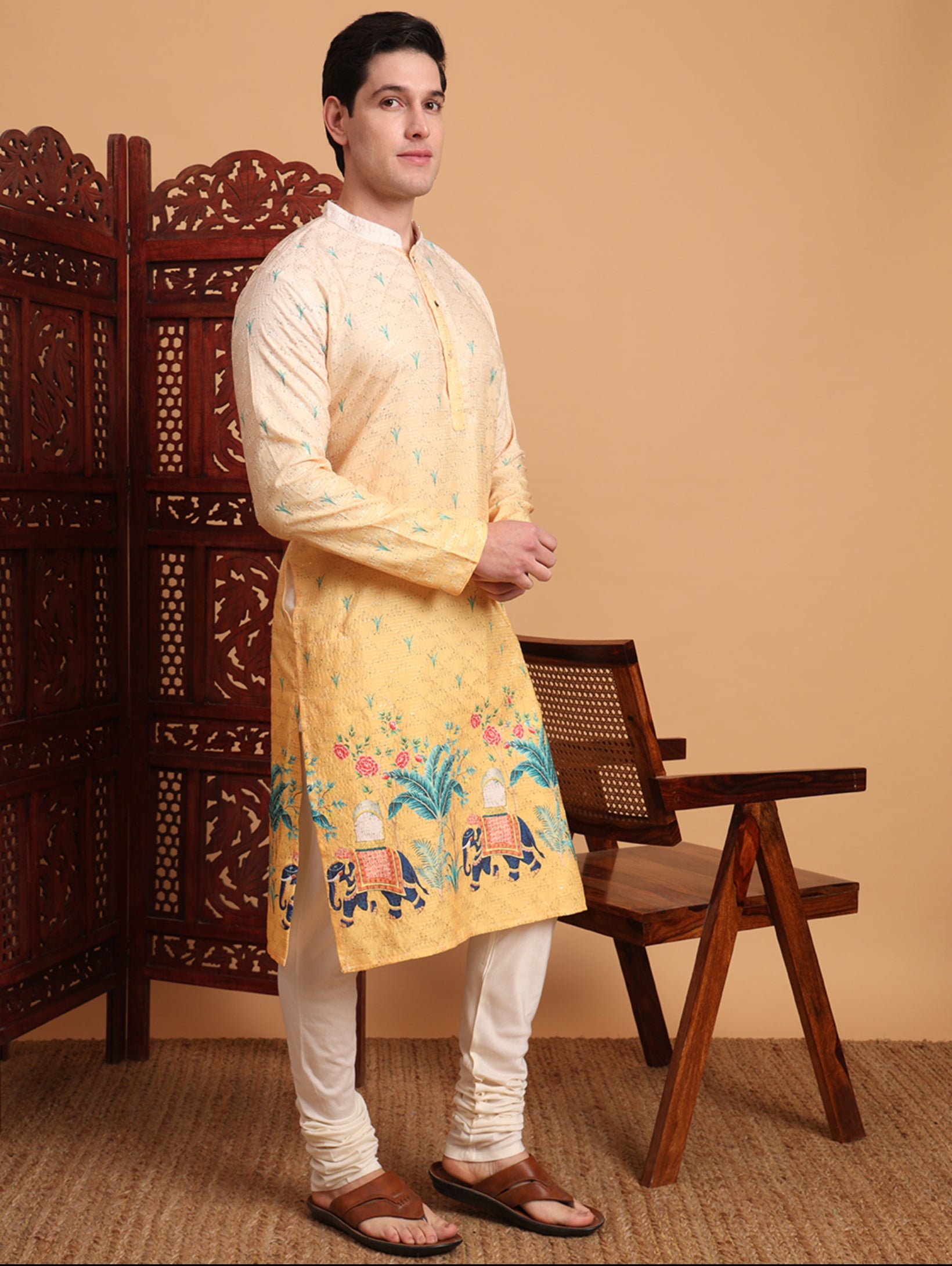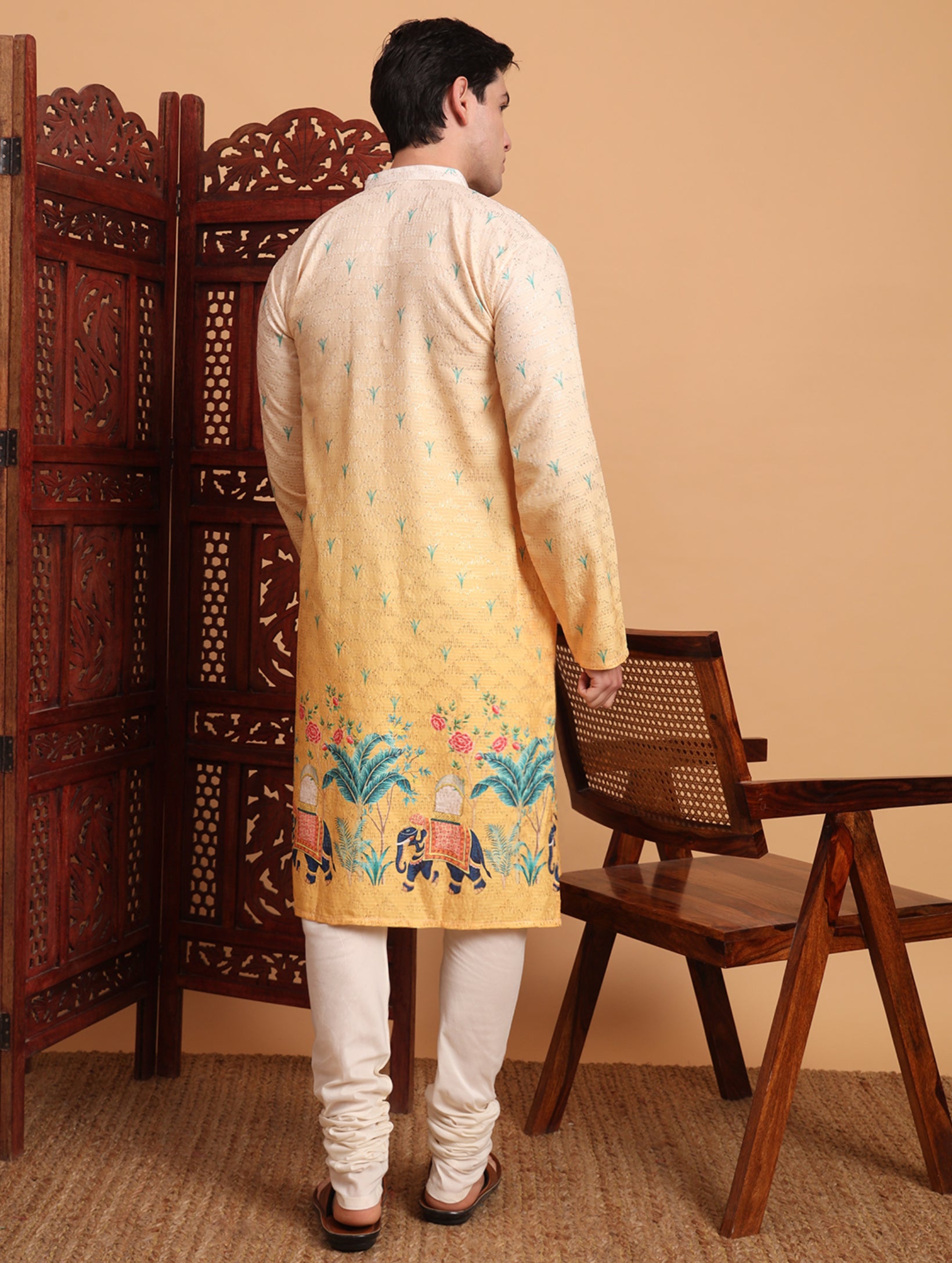 Kurta festif Homme beige et jaune clair en coton avec imprimé et broderies