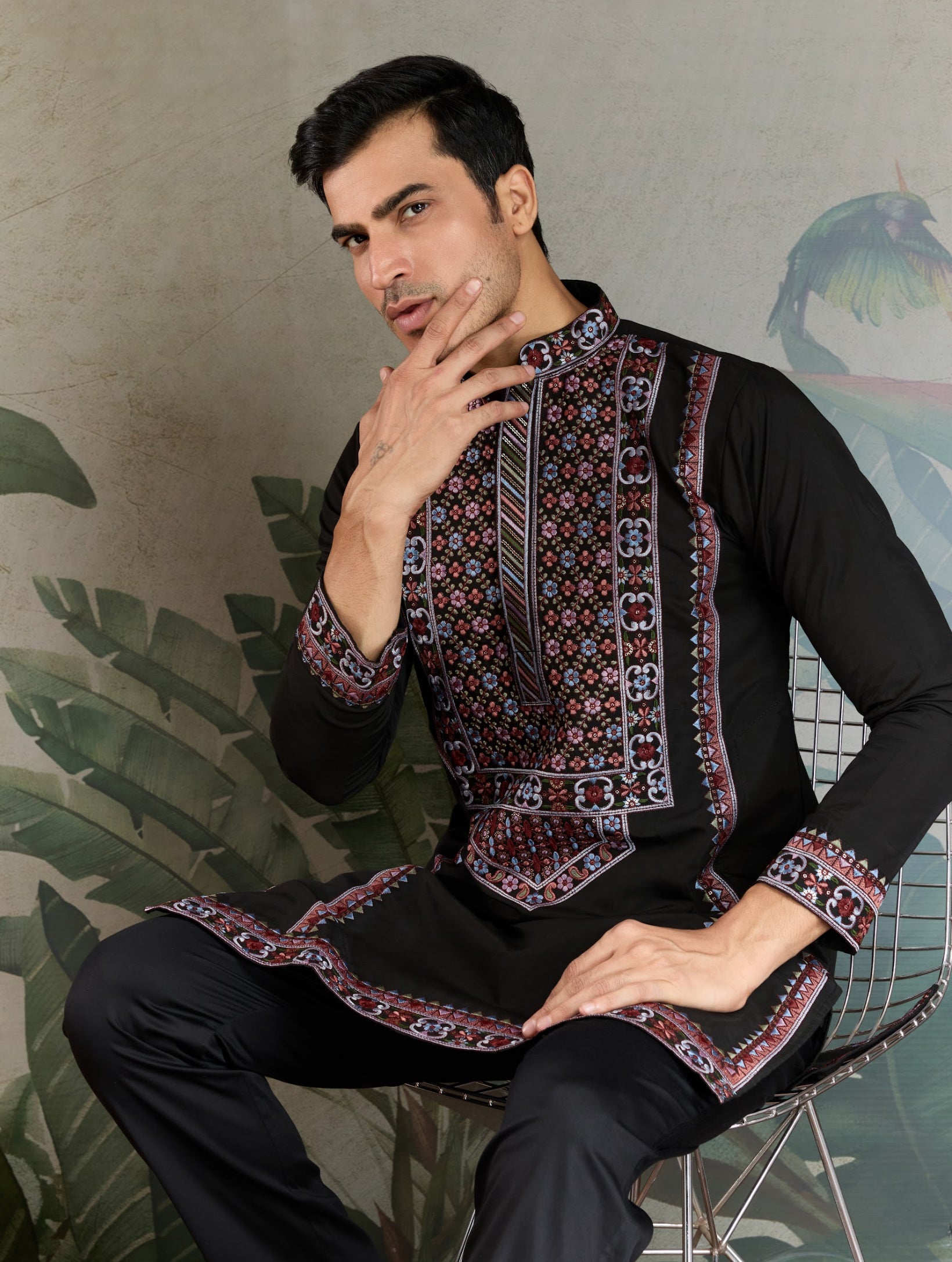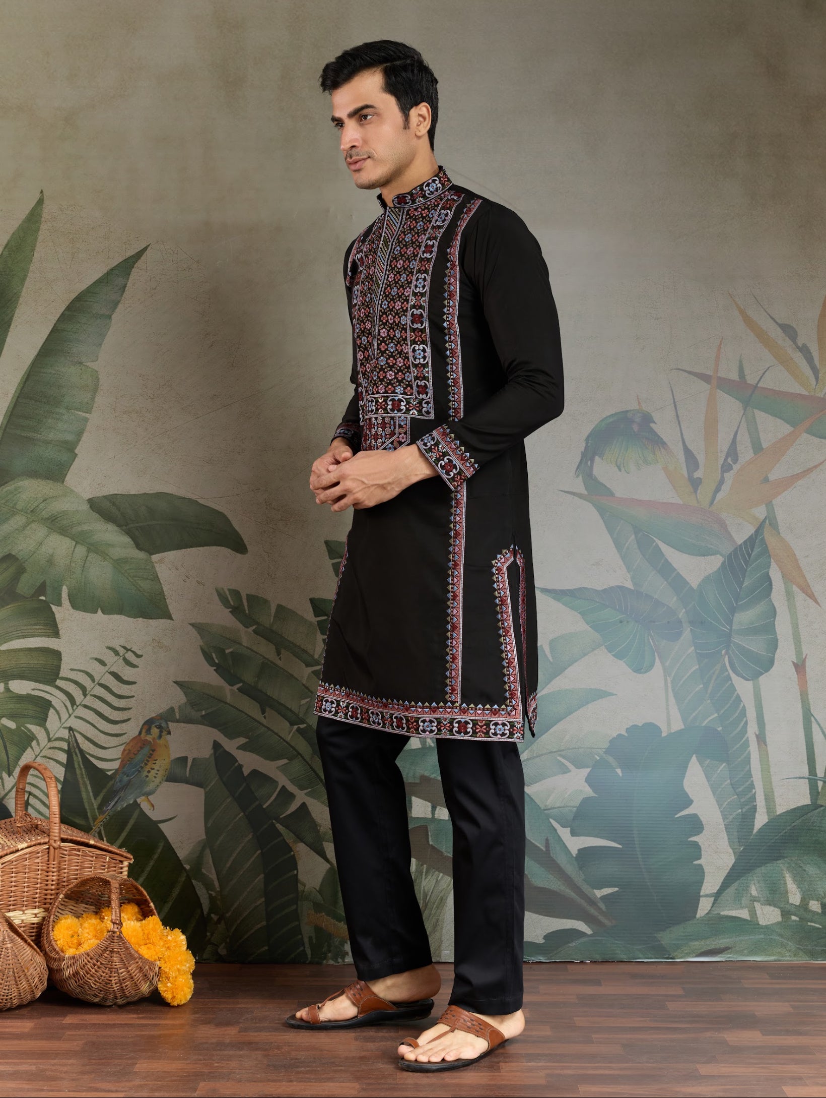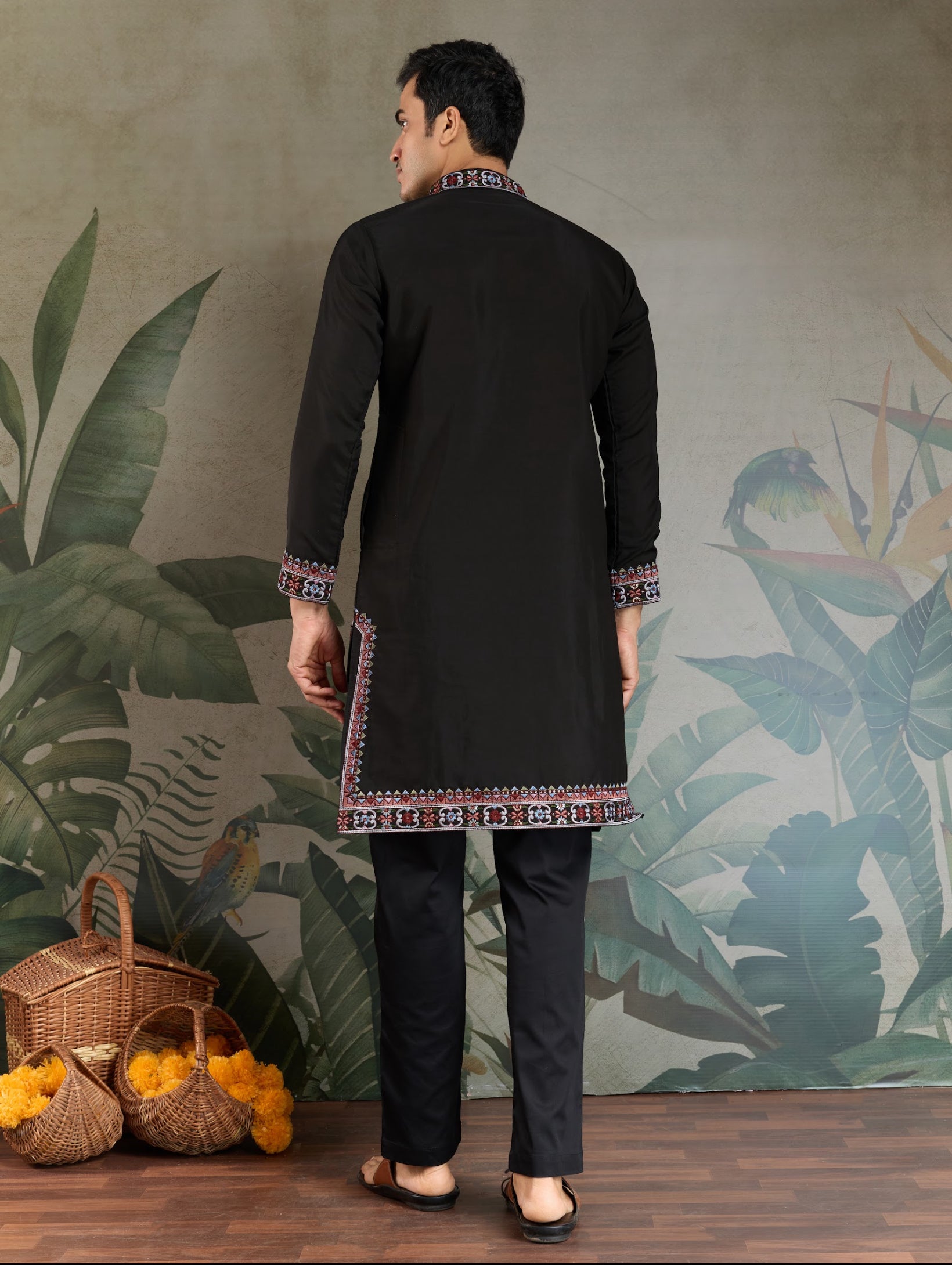 Kurta festif Homme noir en soie viscose avec broderies
