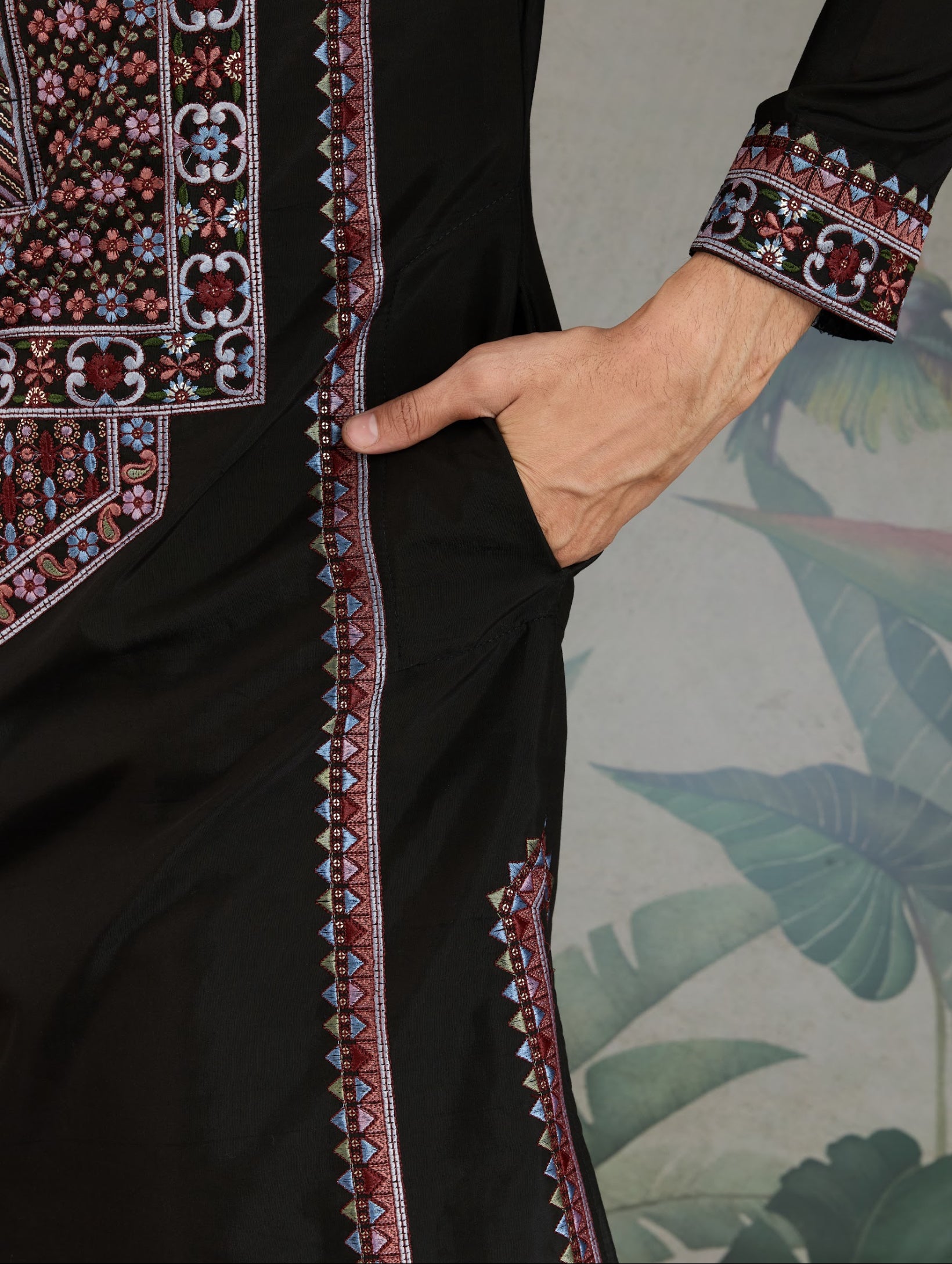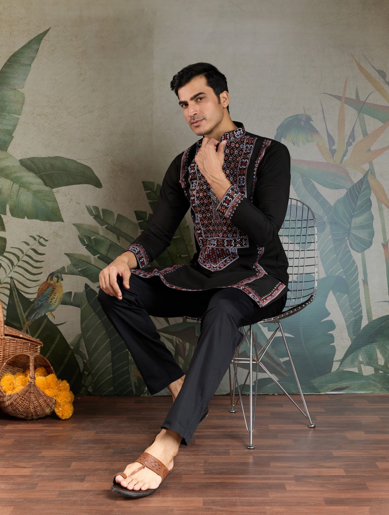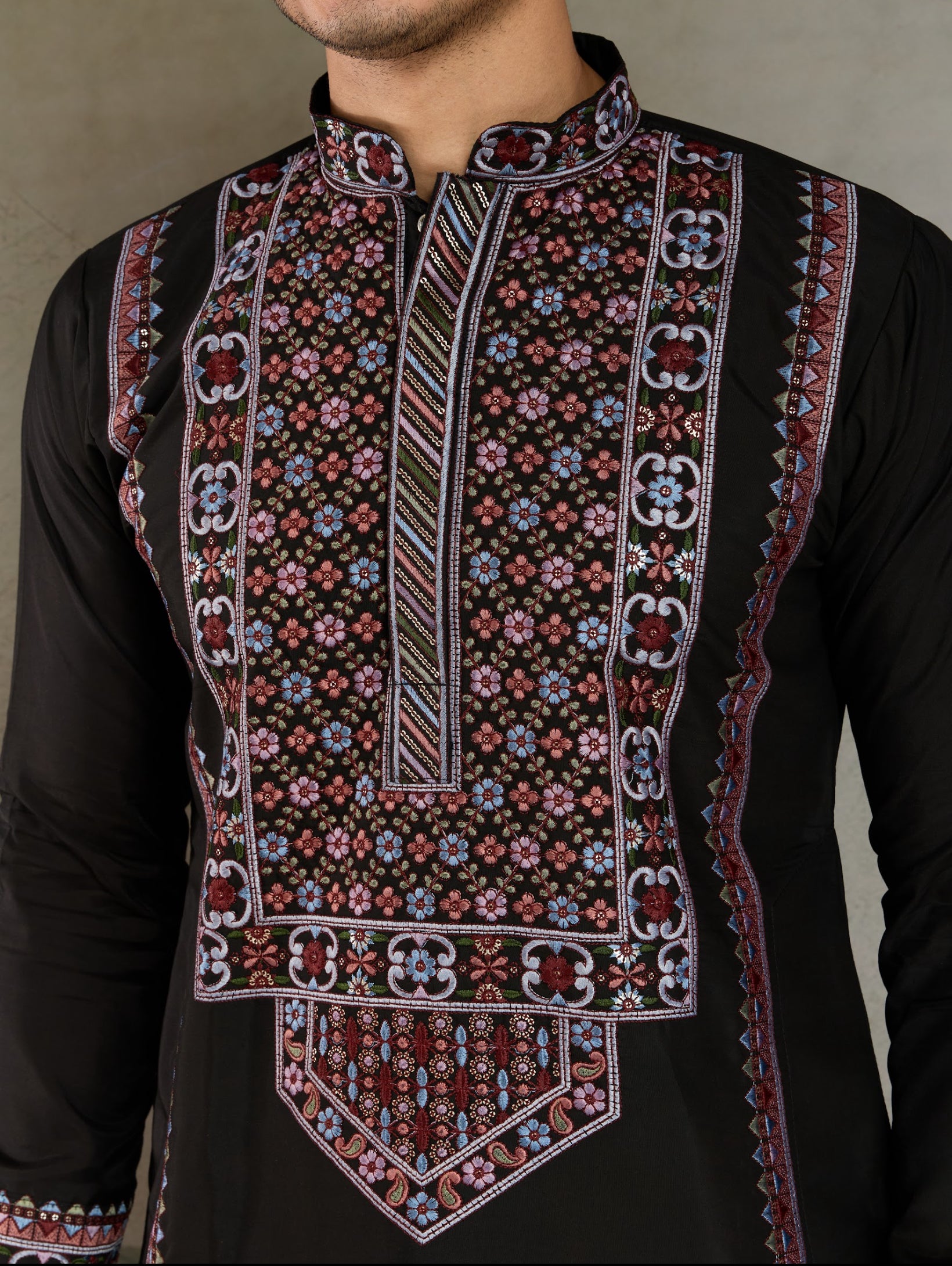 Kurta festif Homme noir en soie viscose avec broderies