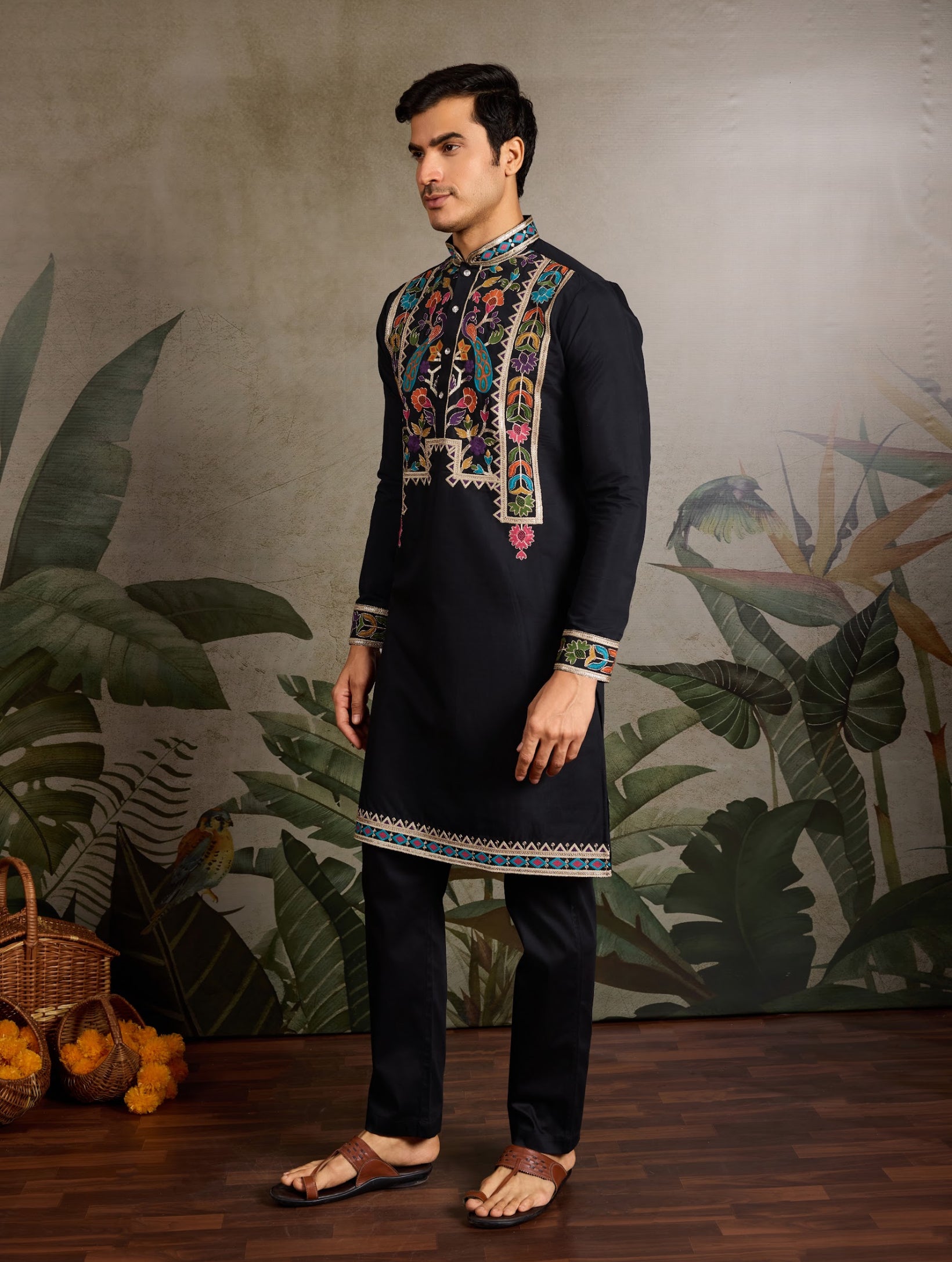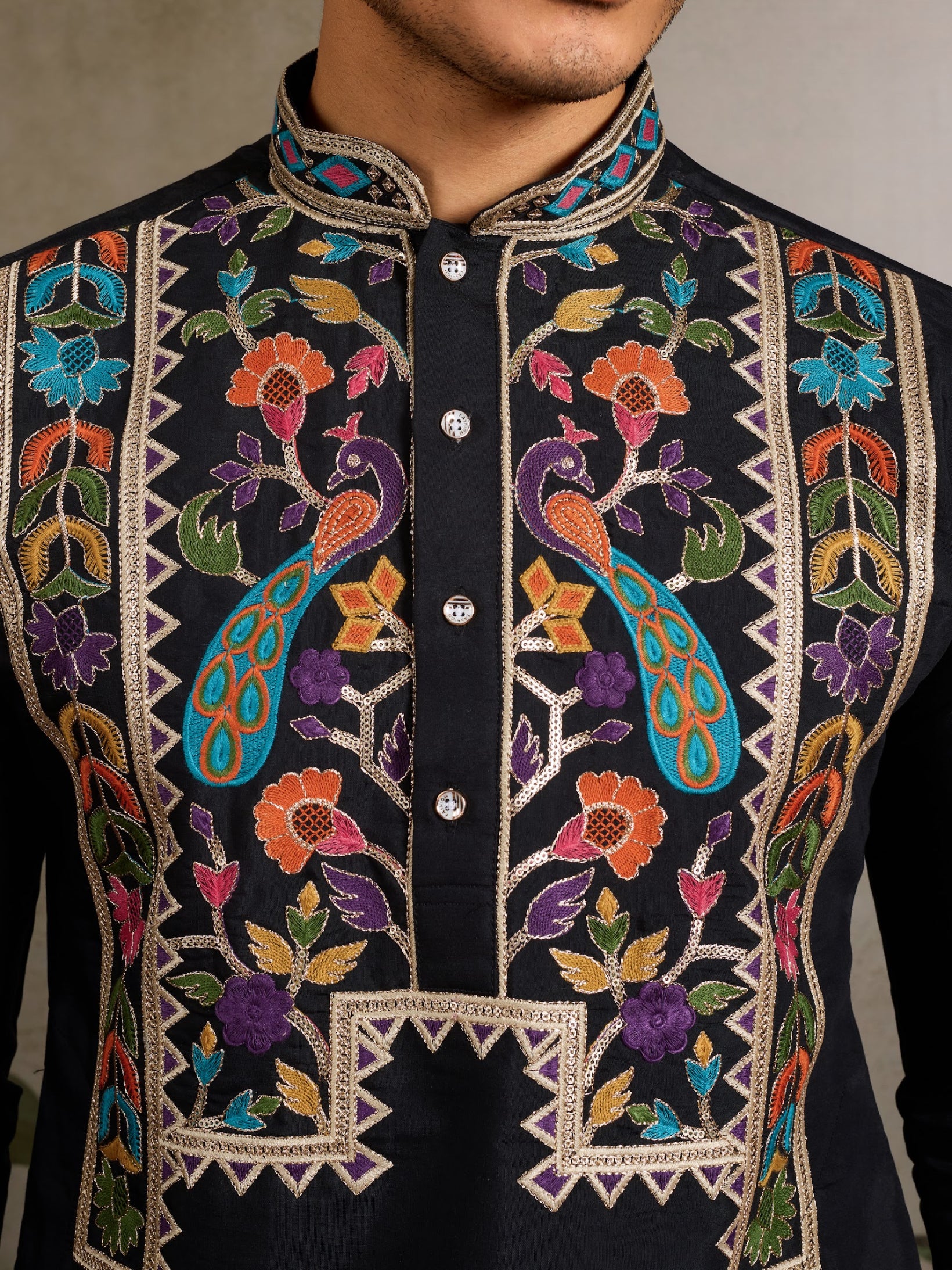 Kurta Homme noir multicolore en soie viscose avec broderies et sequins