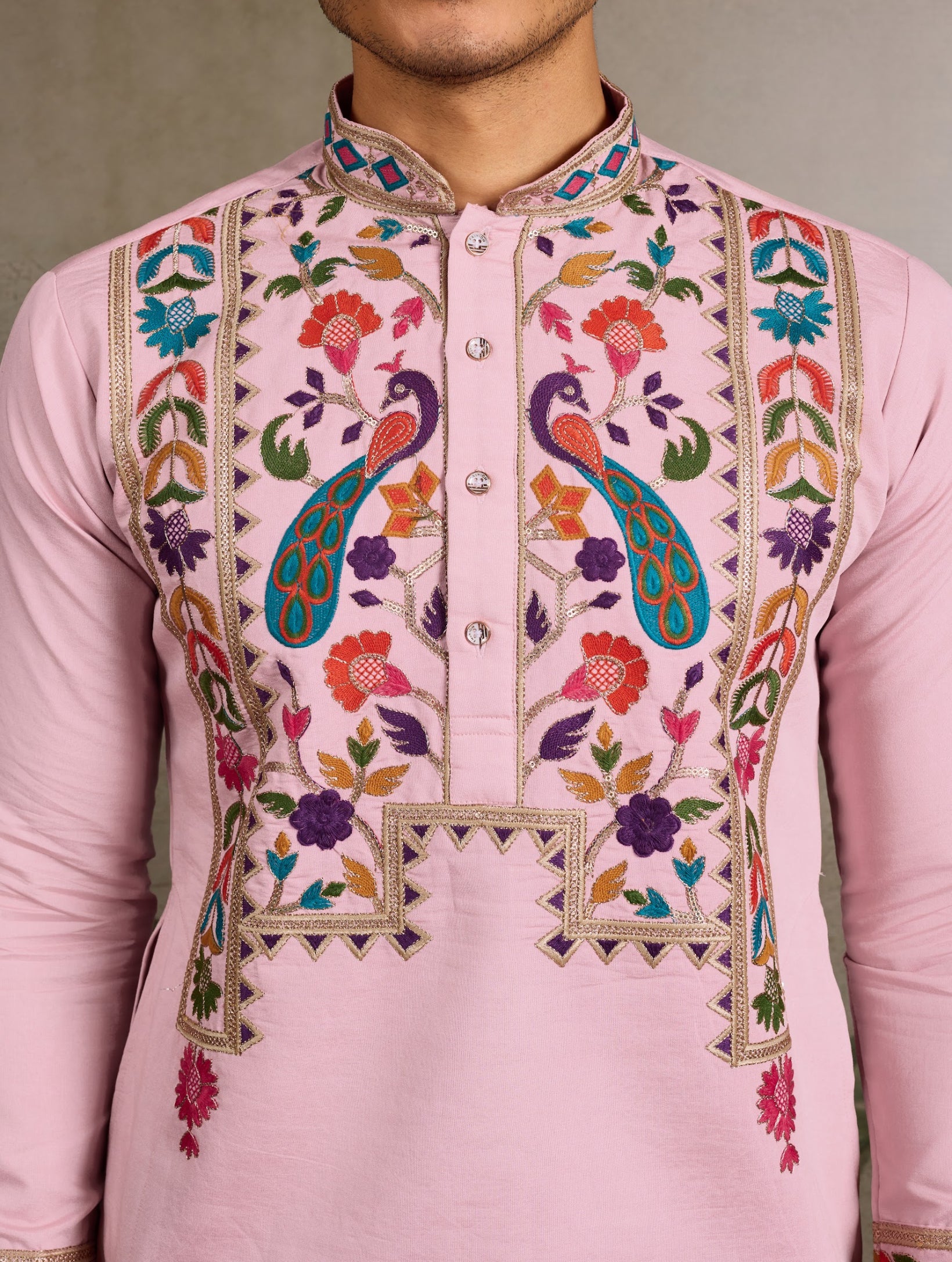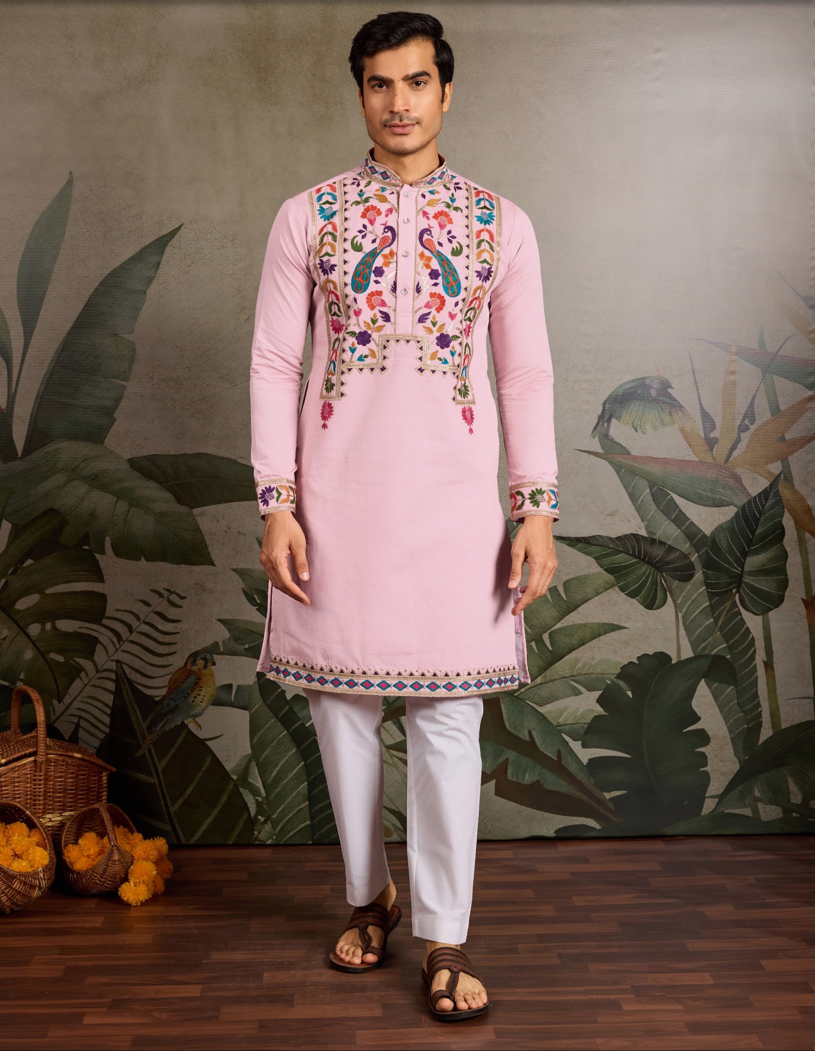 Kurta Homme rose clair en soie viscose avec broderies et sequins