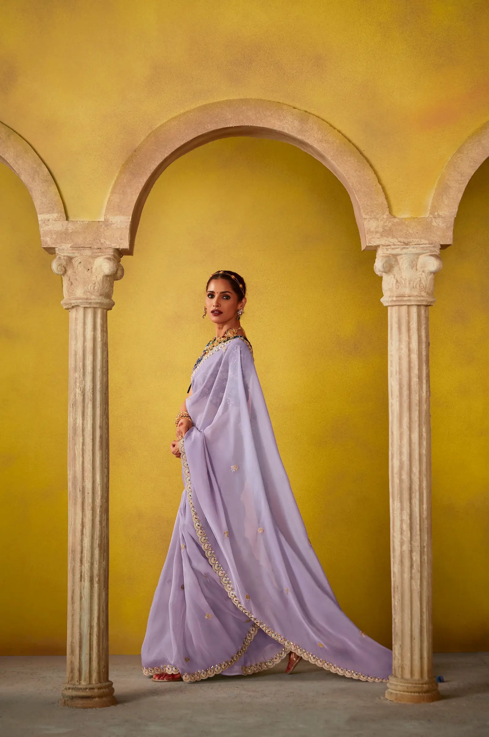 Sari en tissu soie de verre violet lavande et blouse bleue multicolore avec imprimé digital, broderie en sequins et en fil