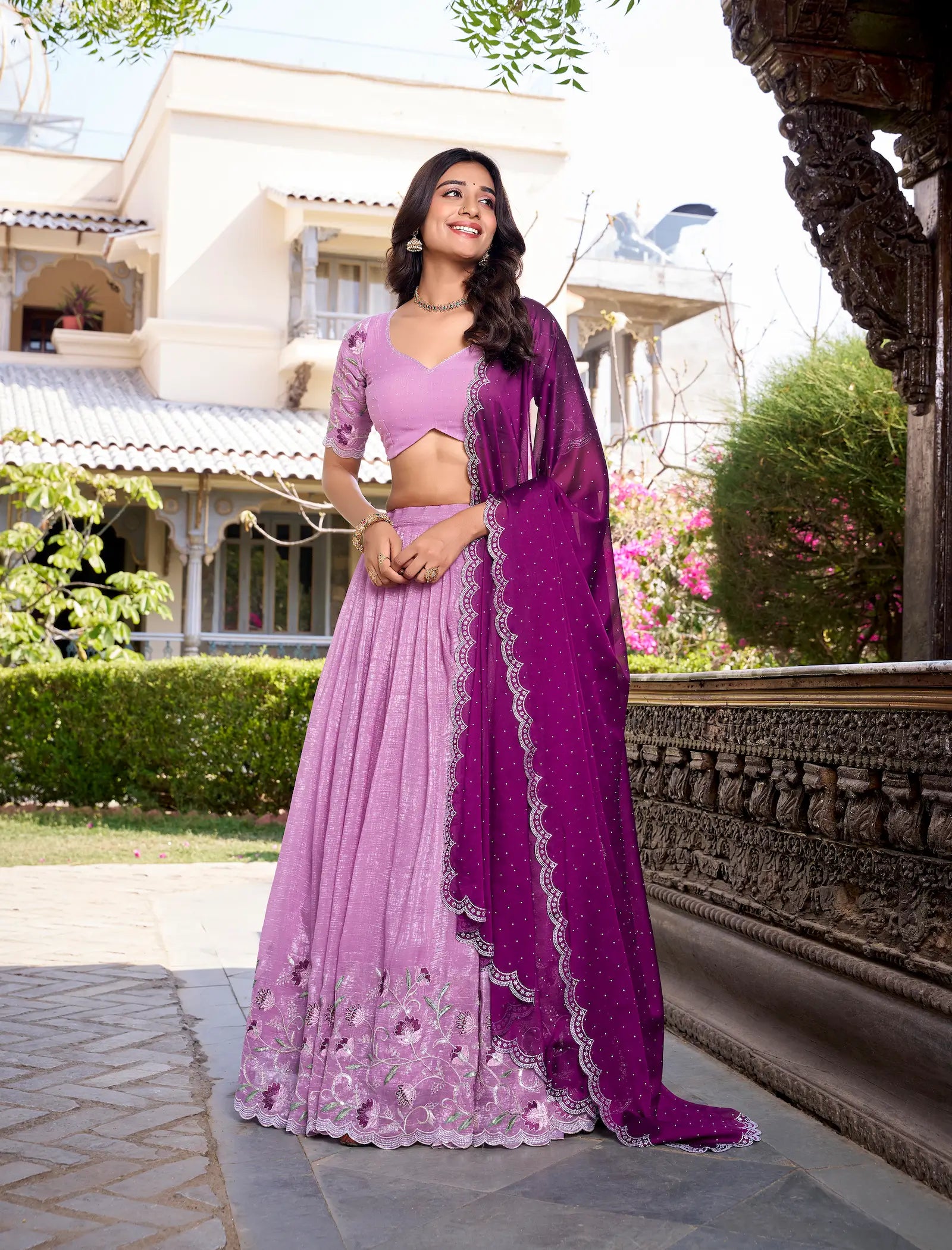 Lehenga Choli en soie brillante violet lavande avec broderie de sequins et de fils, ornée de finitions hotfix COLLECTION AANCHAL
