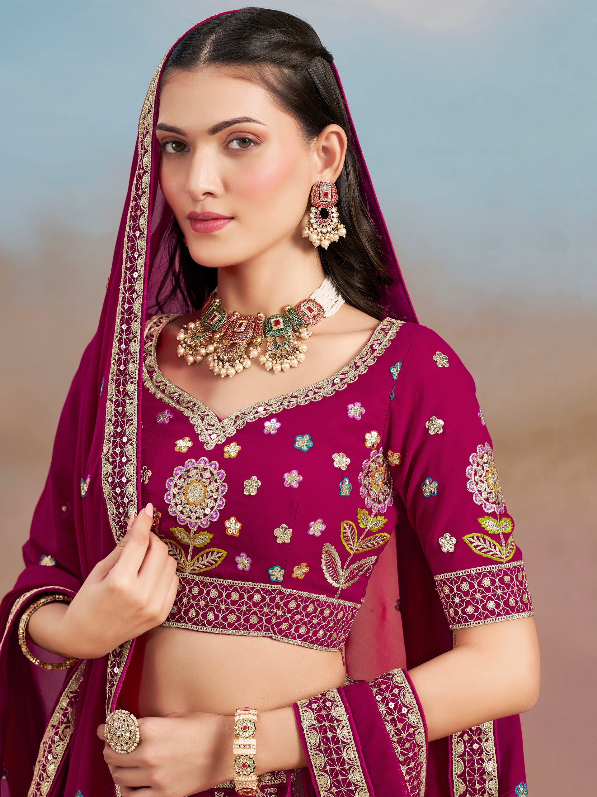 Lehenga rose foncé riche en georgette avec broderies de fleurs colorés et sequins COLLECTION SIMRAN