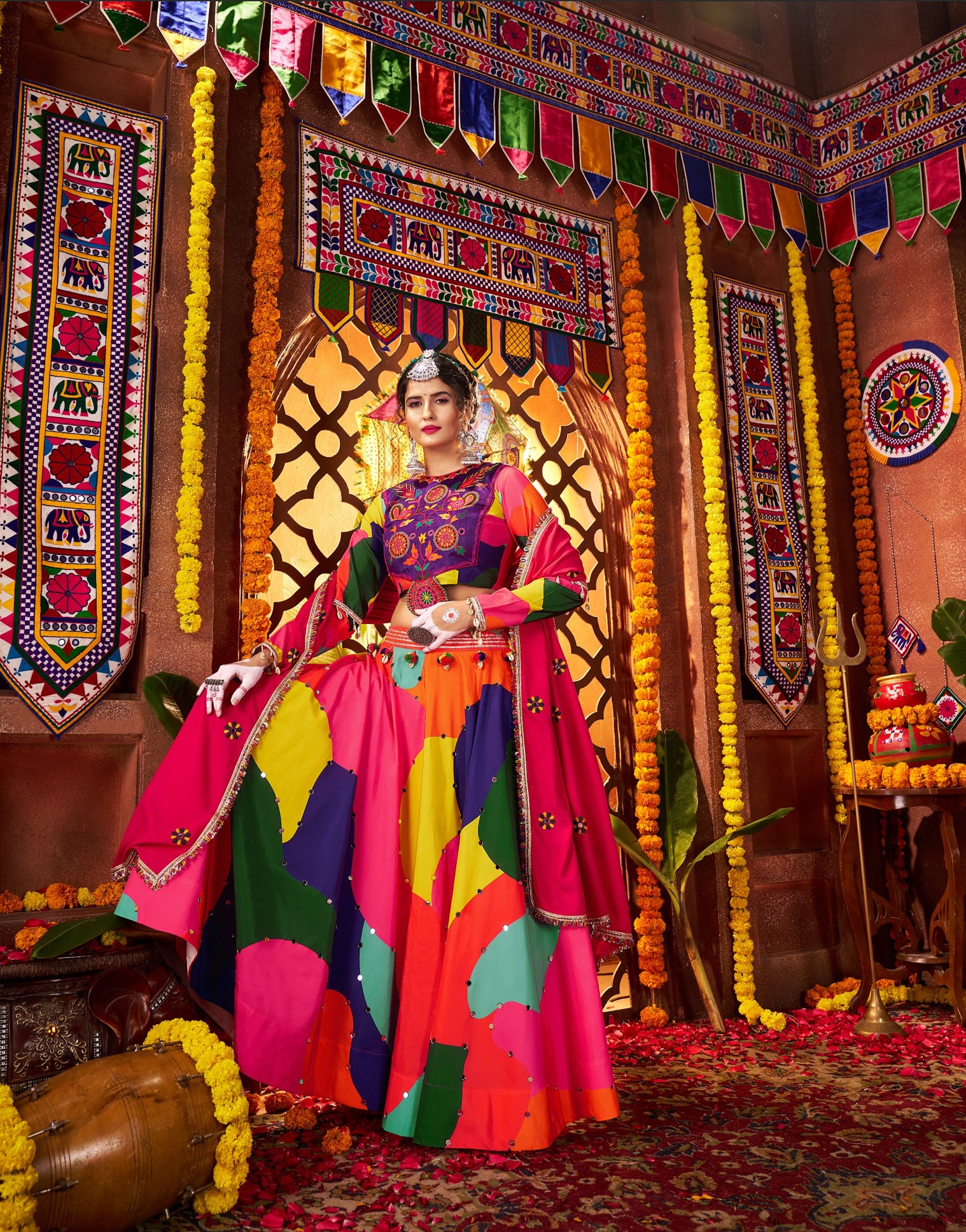Lehenga de célébration Navratri rose fuchsia multicolore avec broderies et travail de miroirs en maslin
