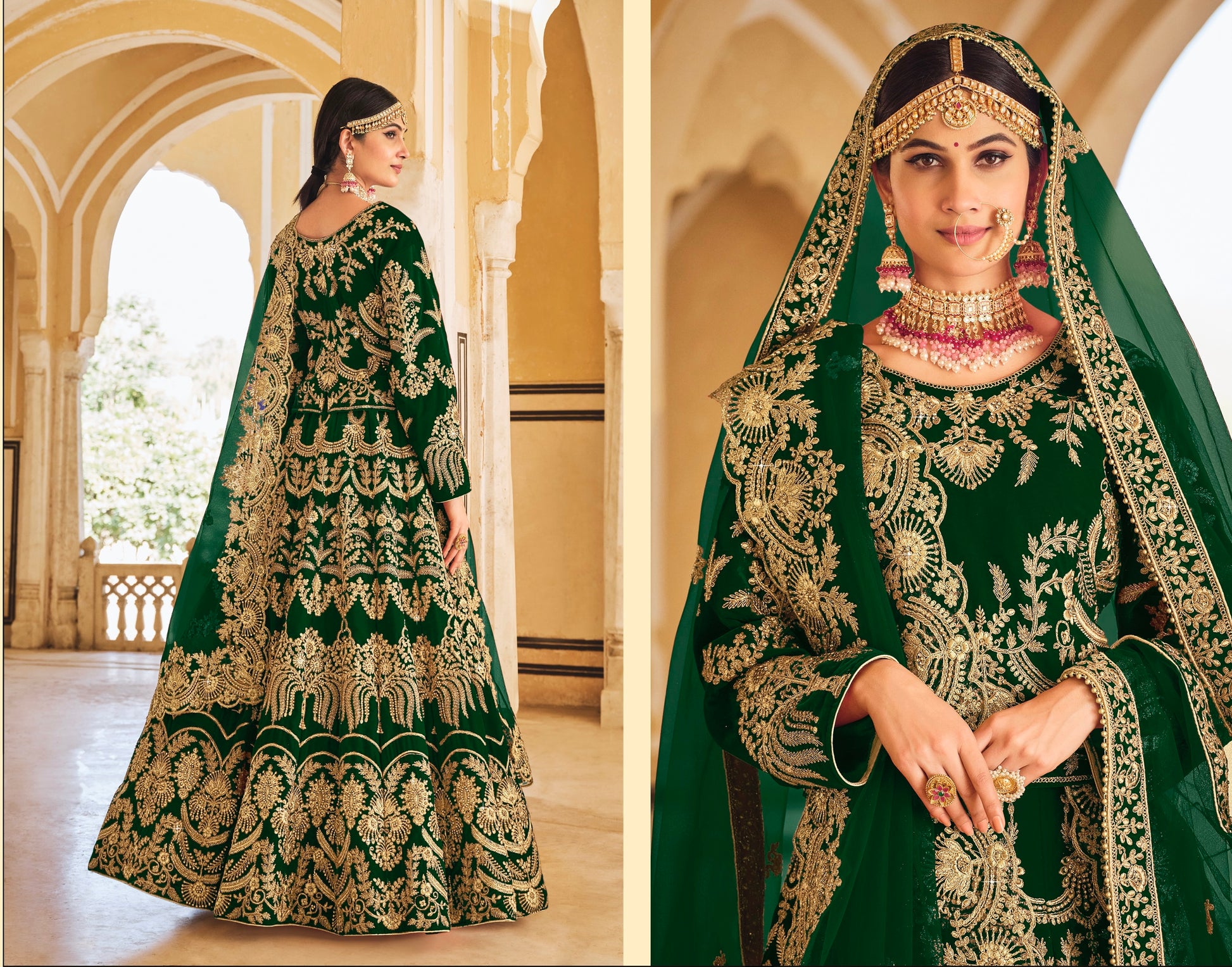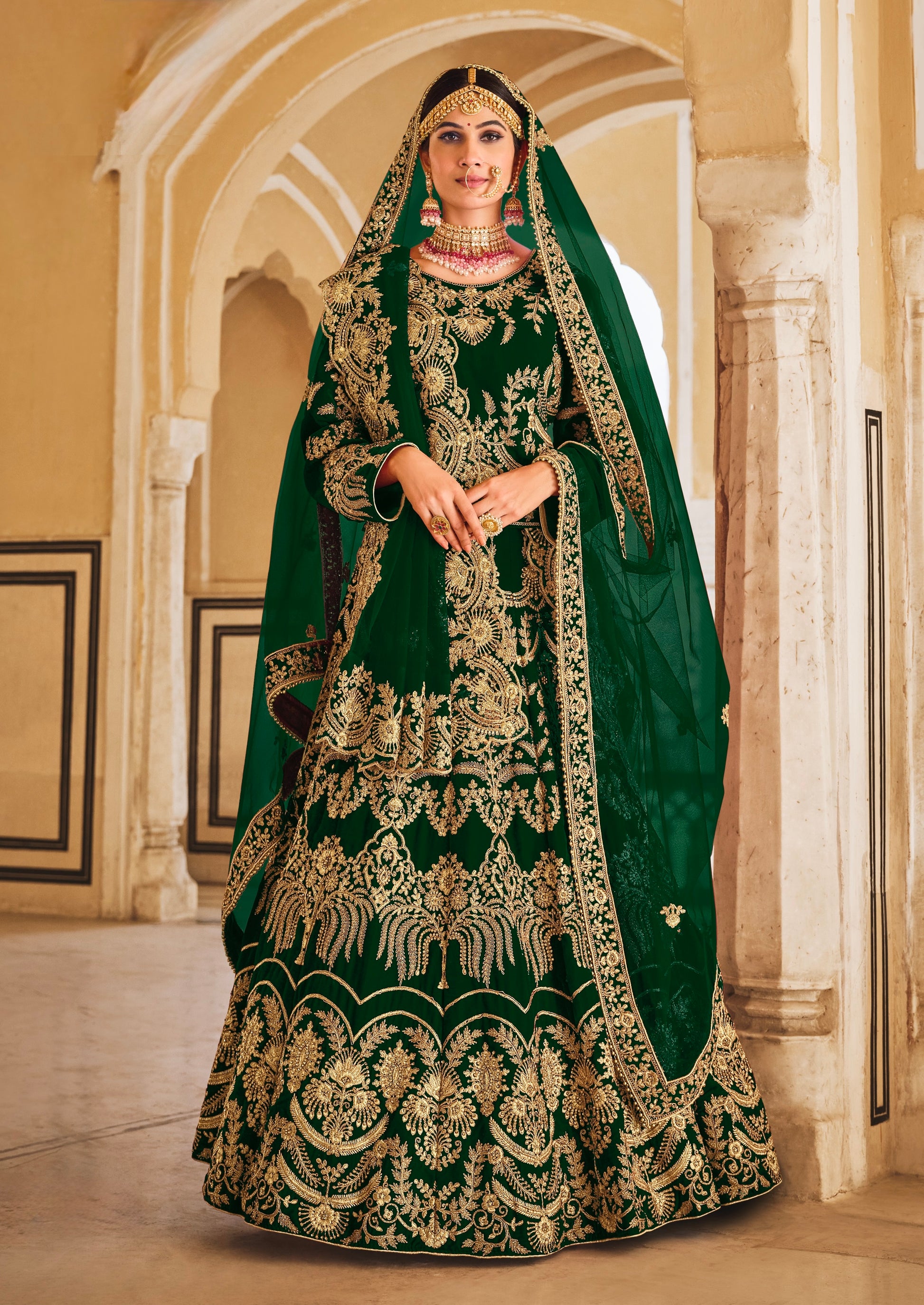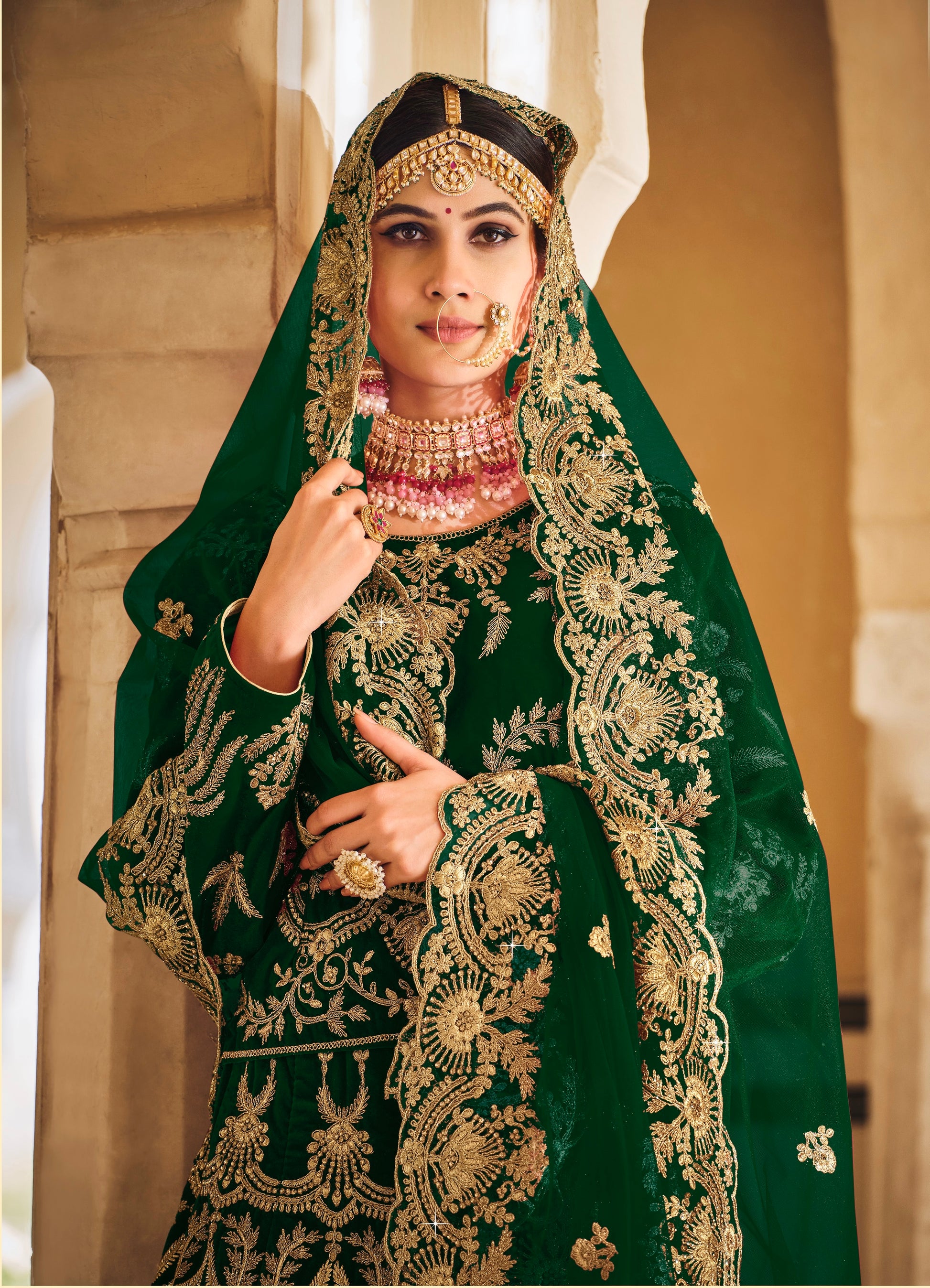 Lehenga de Mariée Vert en Velours de qualité supérieure et Double dupatta avec Broderies et Zarkan