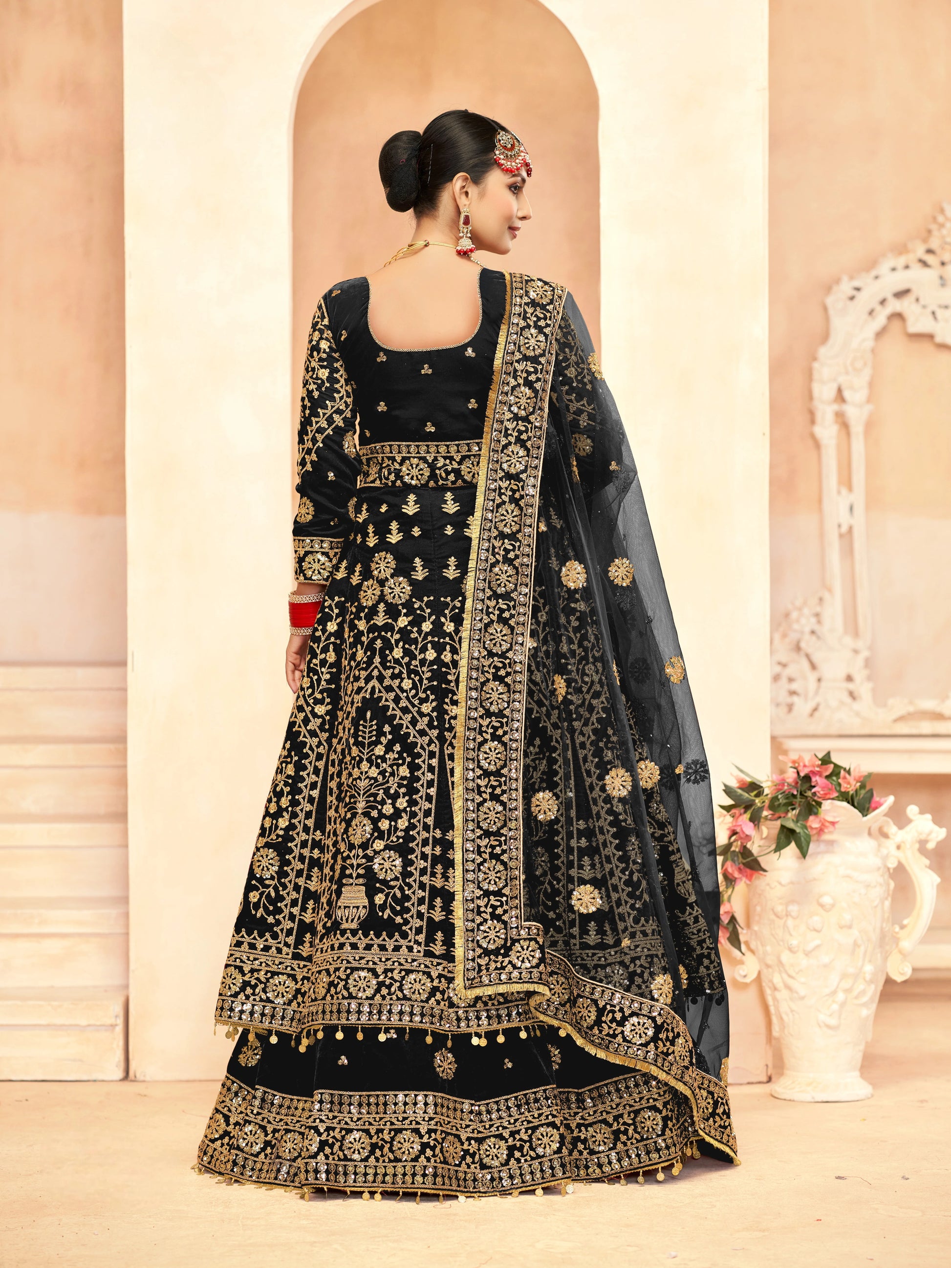 Lehenga de Mariée Noir traditionnel en velours haut de gamme et broderies sequins, pierres et fils fantaisie