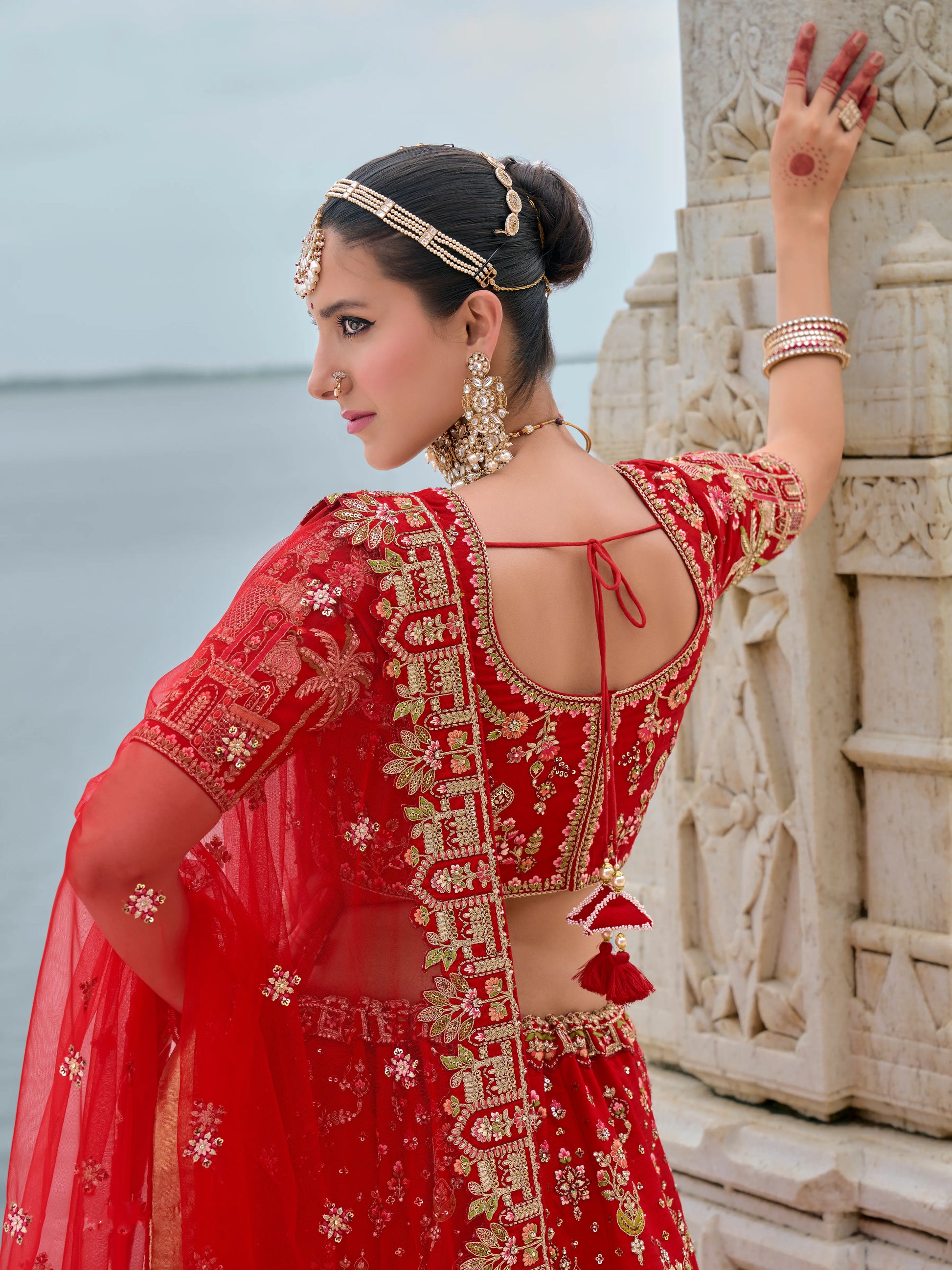 Tissu du lehenga : Soie de mariée de haute qualité, broderies khatli et travail artisanal détaillé