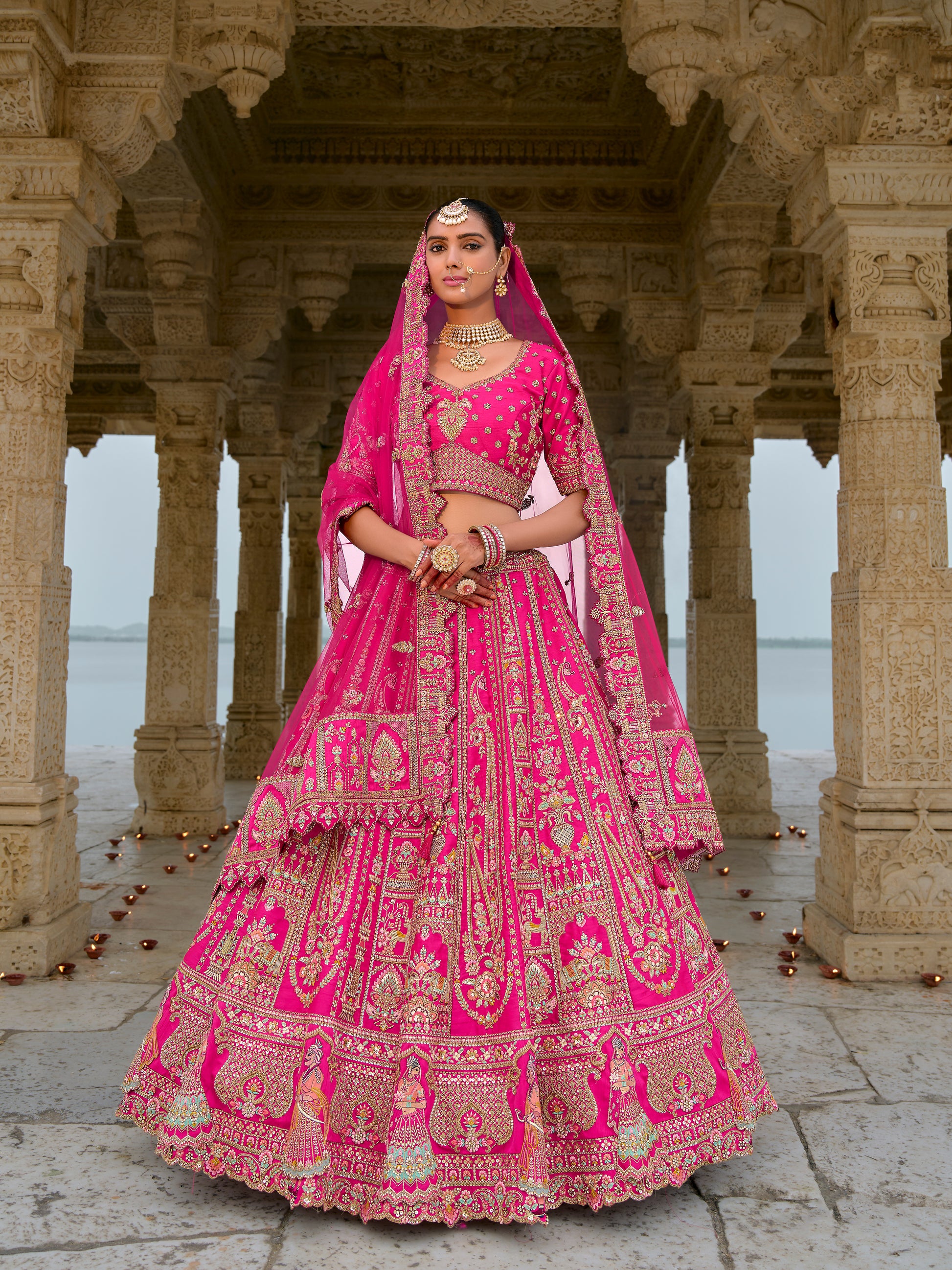 Lehenga de mariée en soie et broderies khatli rose fuchsia traditionnel avec double dupatta rose et bleu turquoise et détails colorés et détails colorés