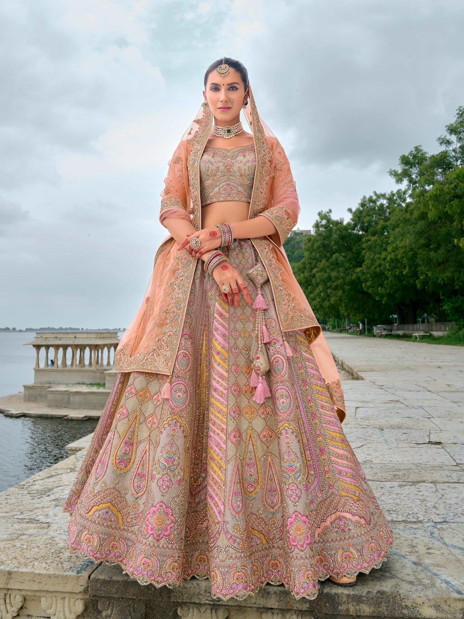 Lehenga de mariée en soie et broderies khatli beige foncé avec double dupatta rose et pêche et détails couleurs pastels