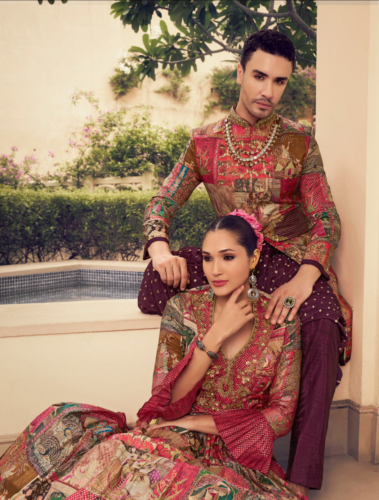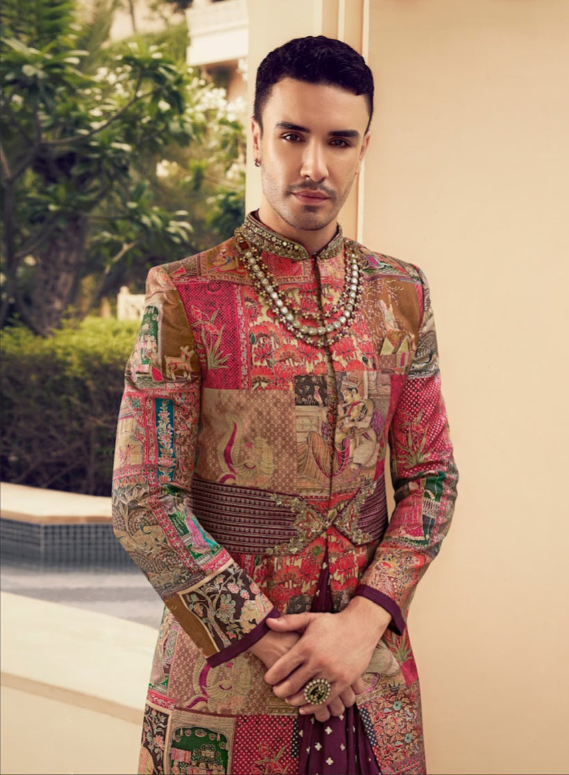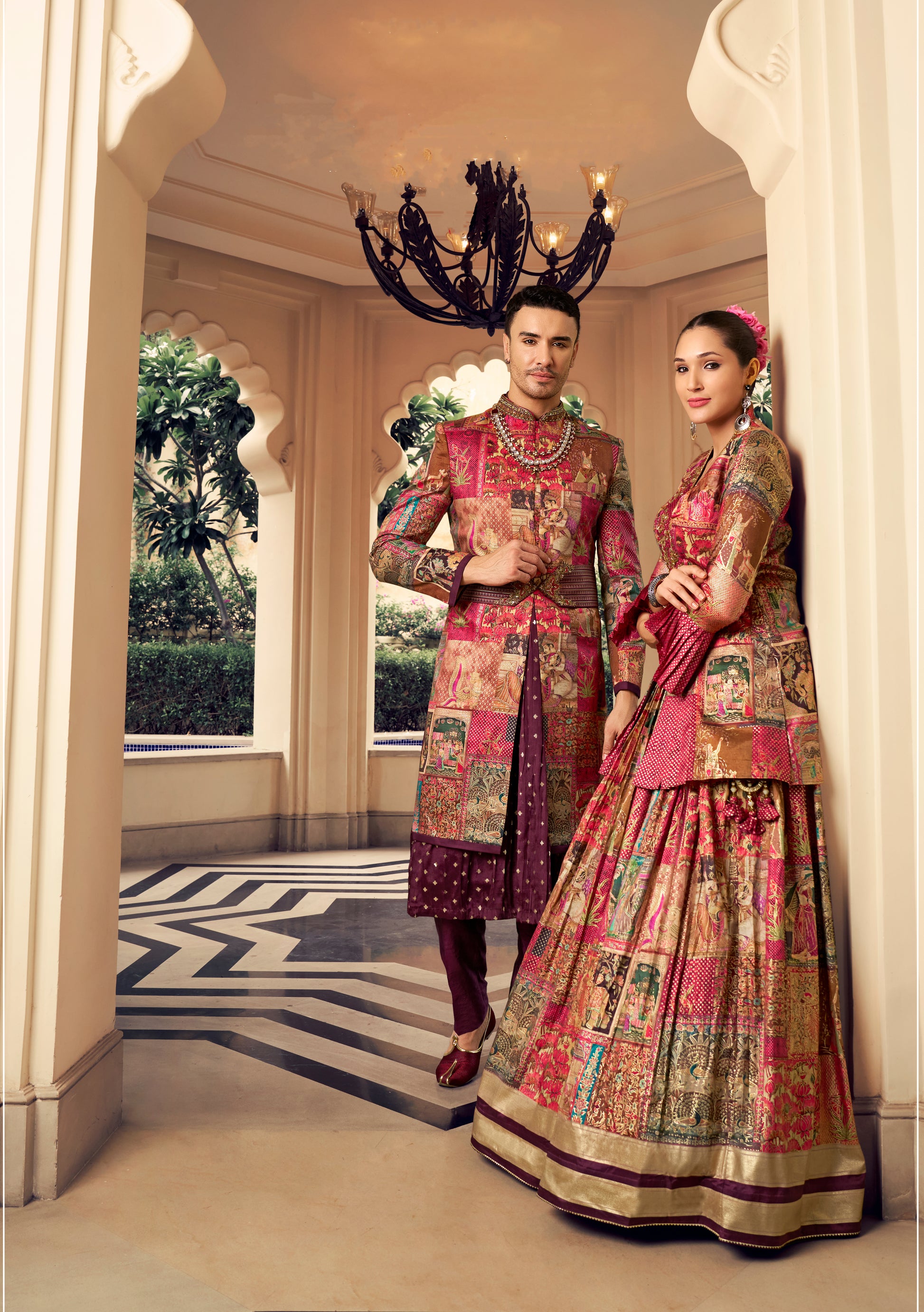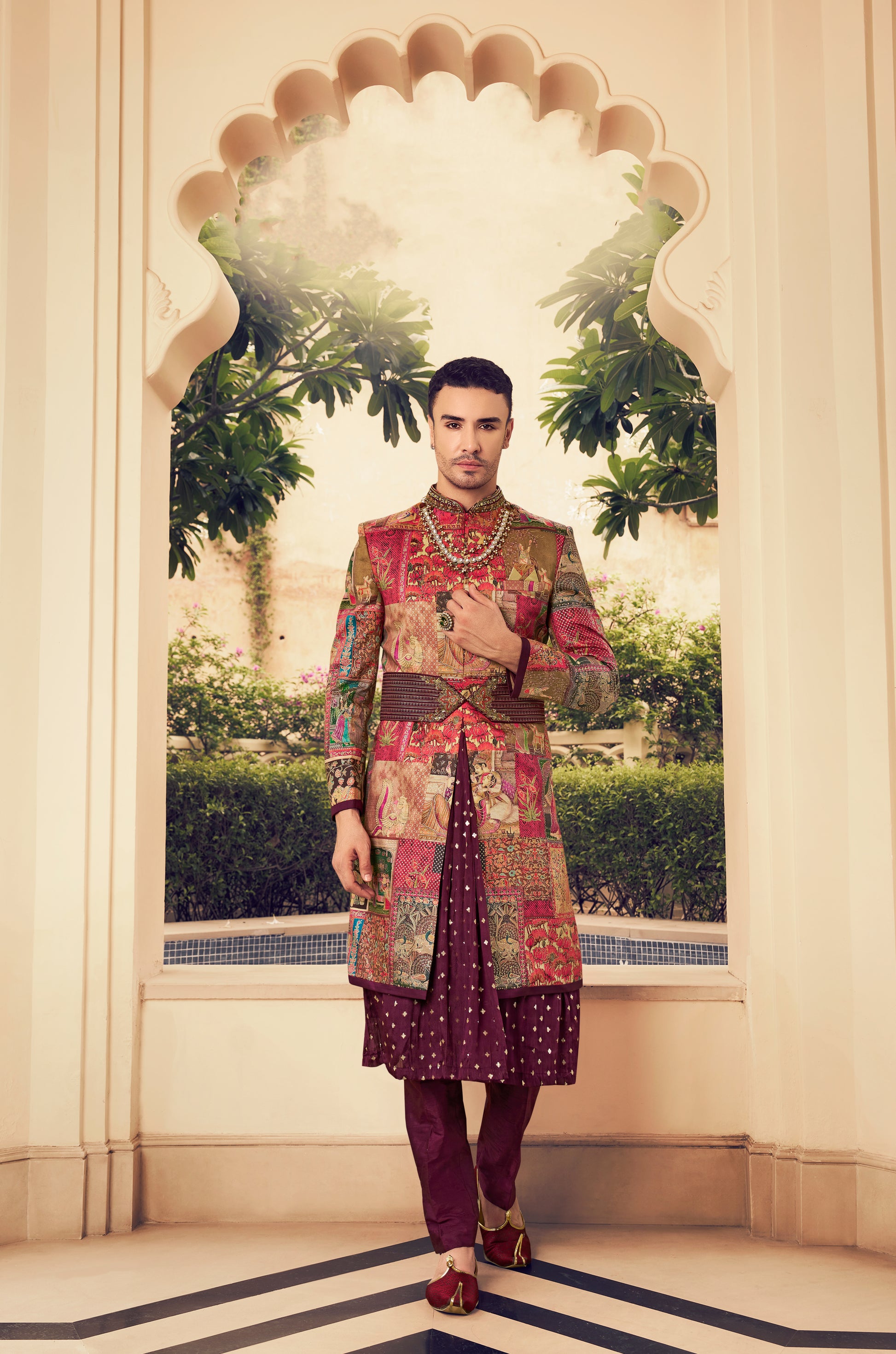 COLLECTION JODI - Tenue Sherwani 3 pièces Rouge Bordeaux et Violet en soie et broderie artisanale