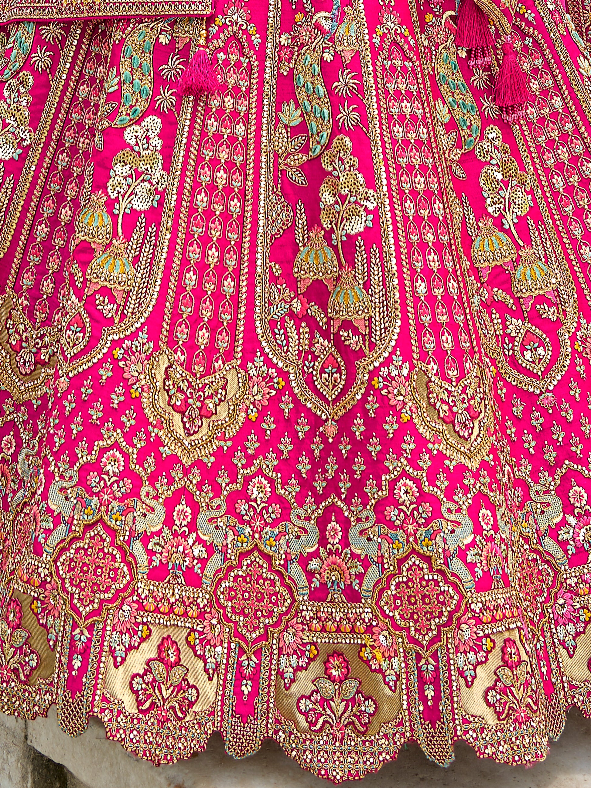 Lehenga de mariée en soie et broderies khatli rose fushcia vif traditionnel avec double dupatta rose