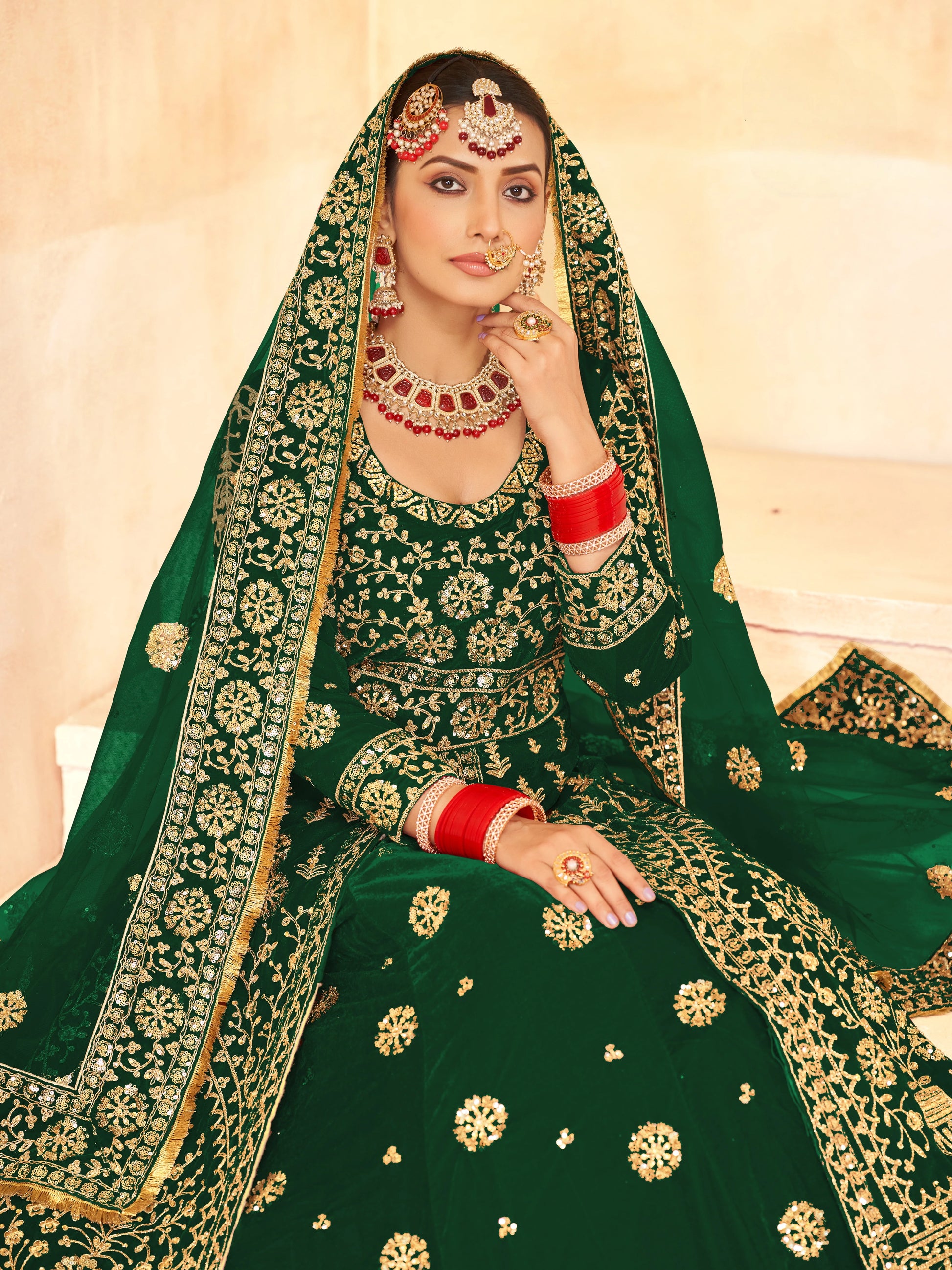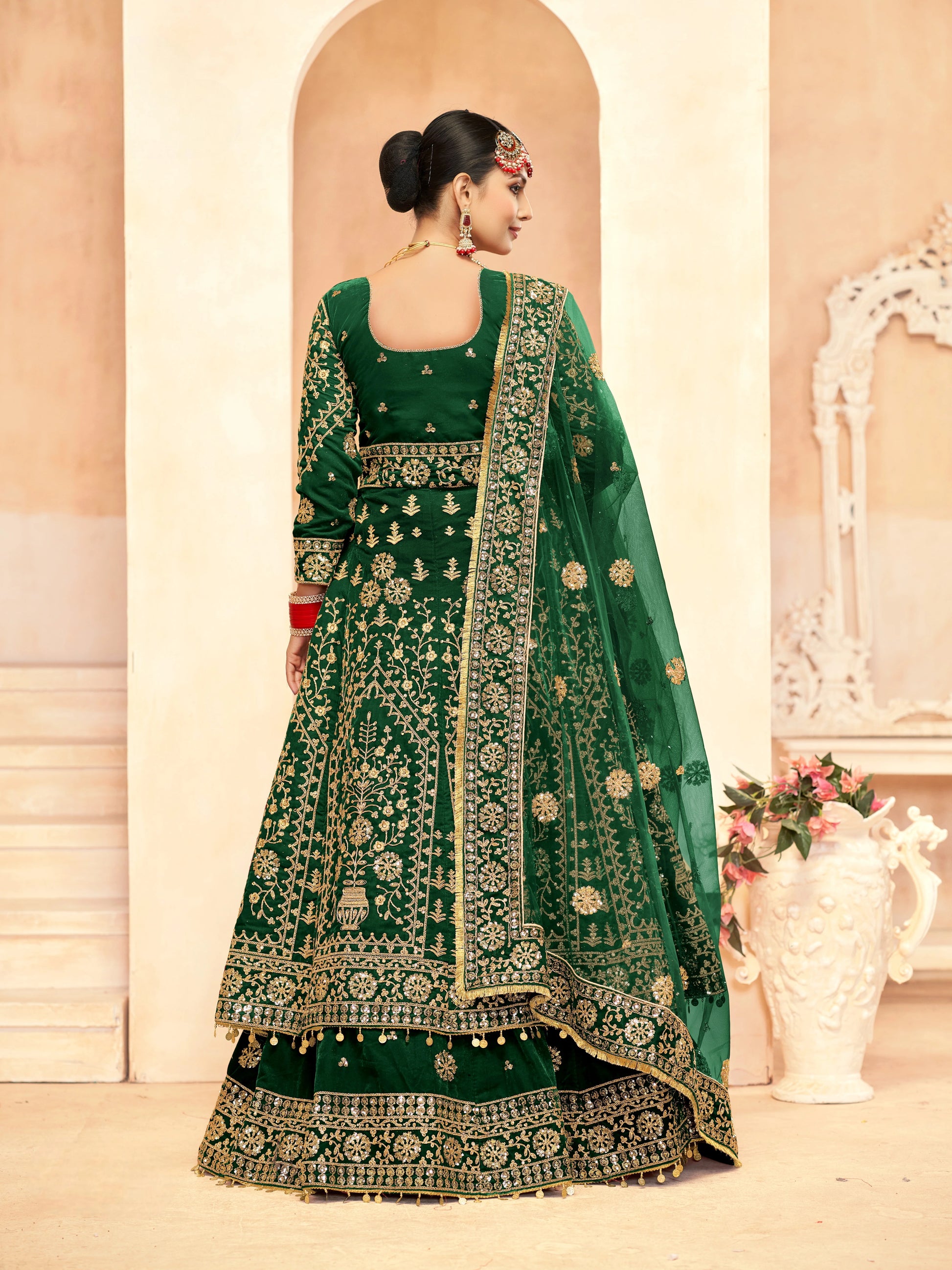 Lehenga de Mariée Vert traditionnel en velours haut de gamme et broderies sequins, pierres et fils fantaisie