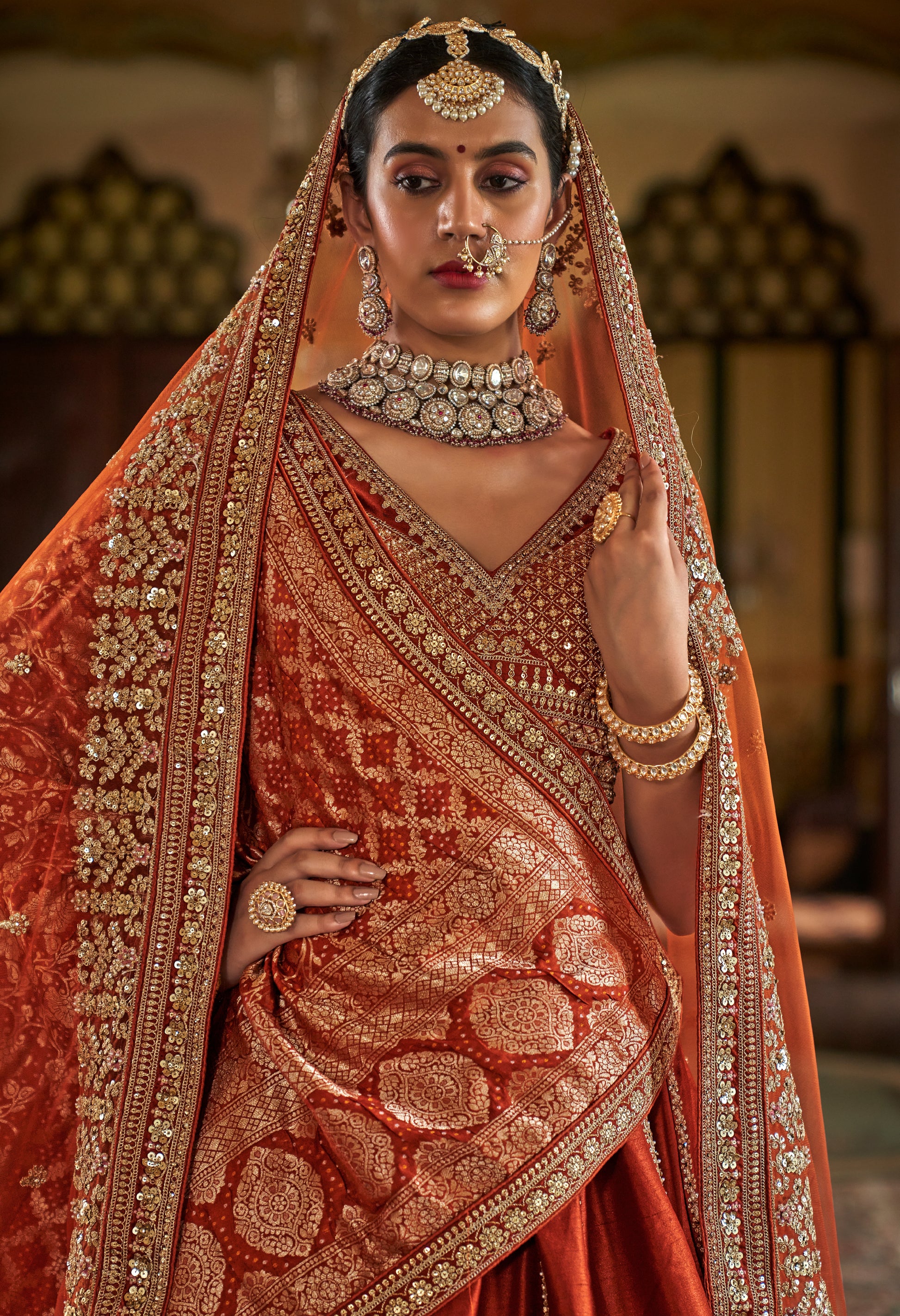 Lehenga de mariée orange foncé riche inspiration de créateur COLLECTION SAJYA