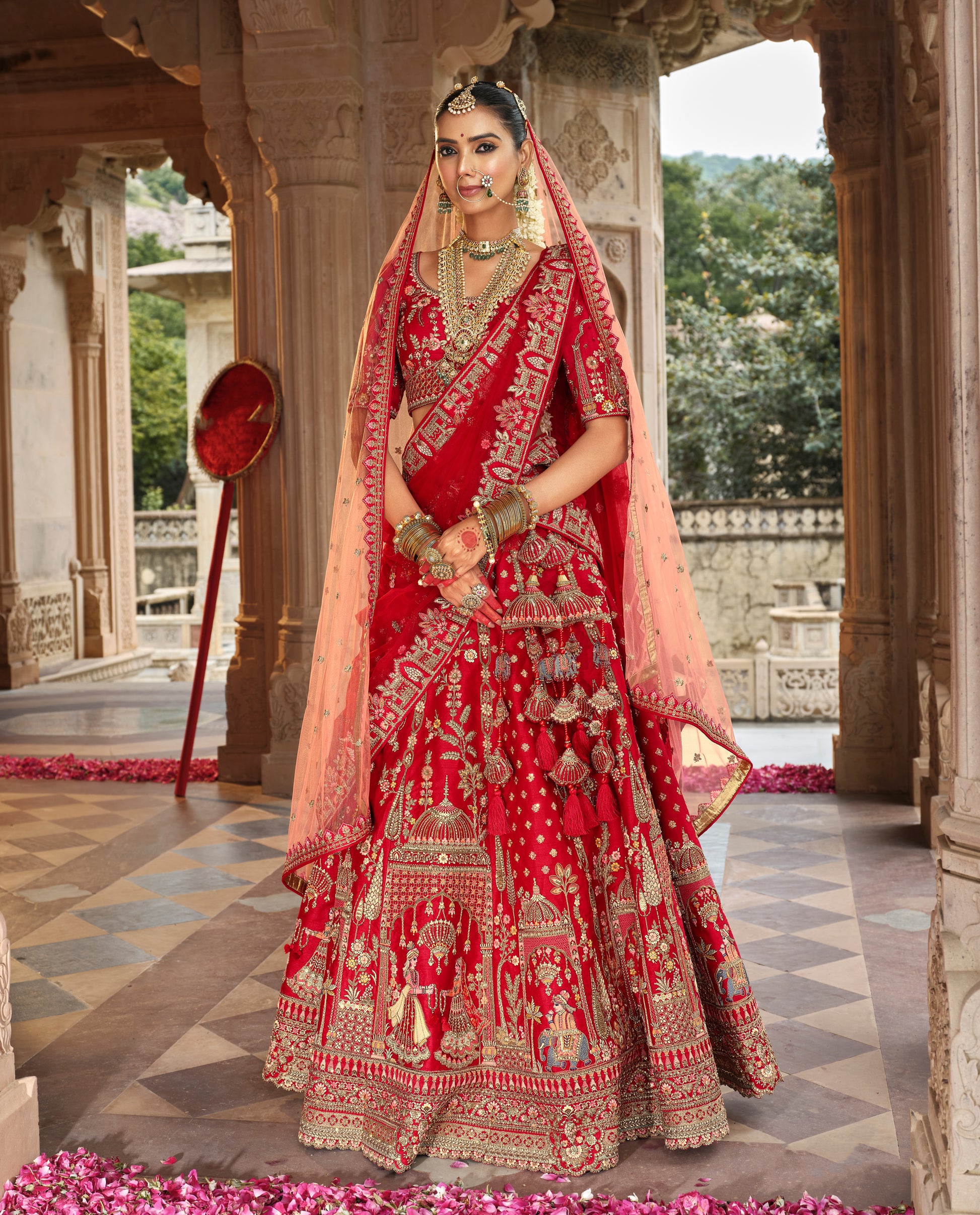 Lehenga de mariée rouge avec détails de broderies dorées COLLECTION MAHIYA