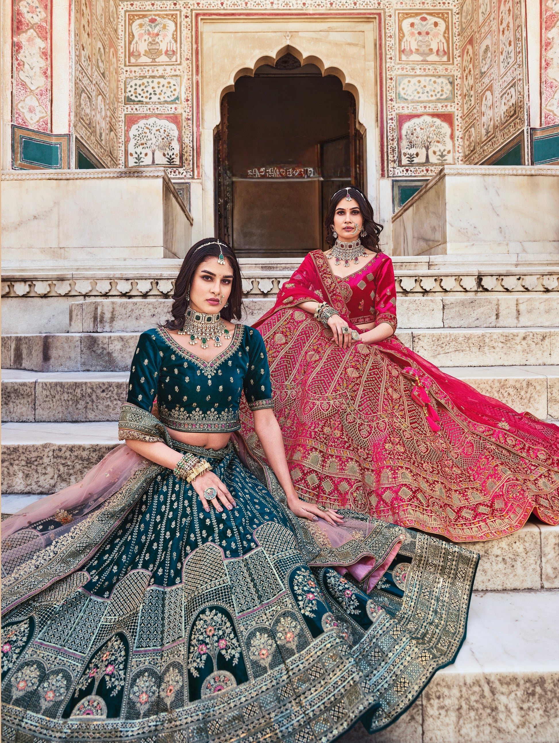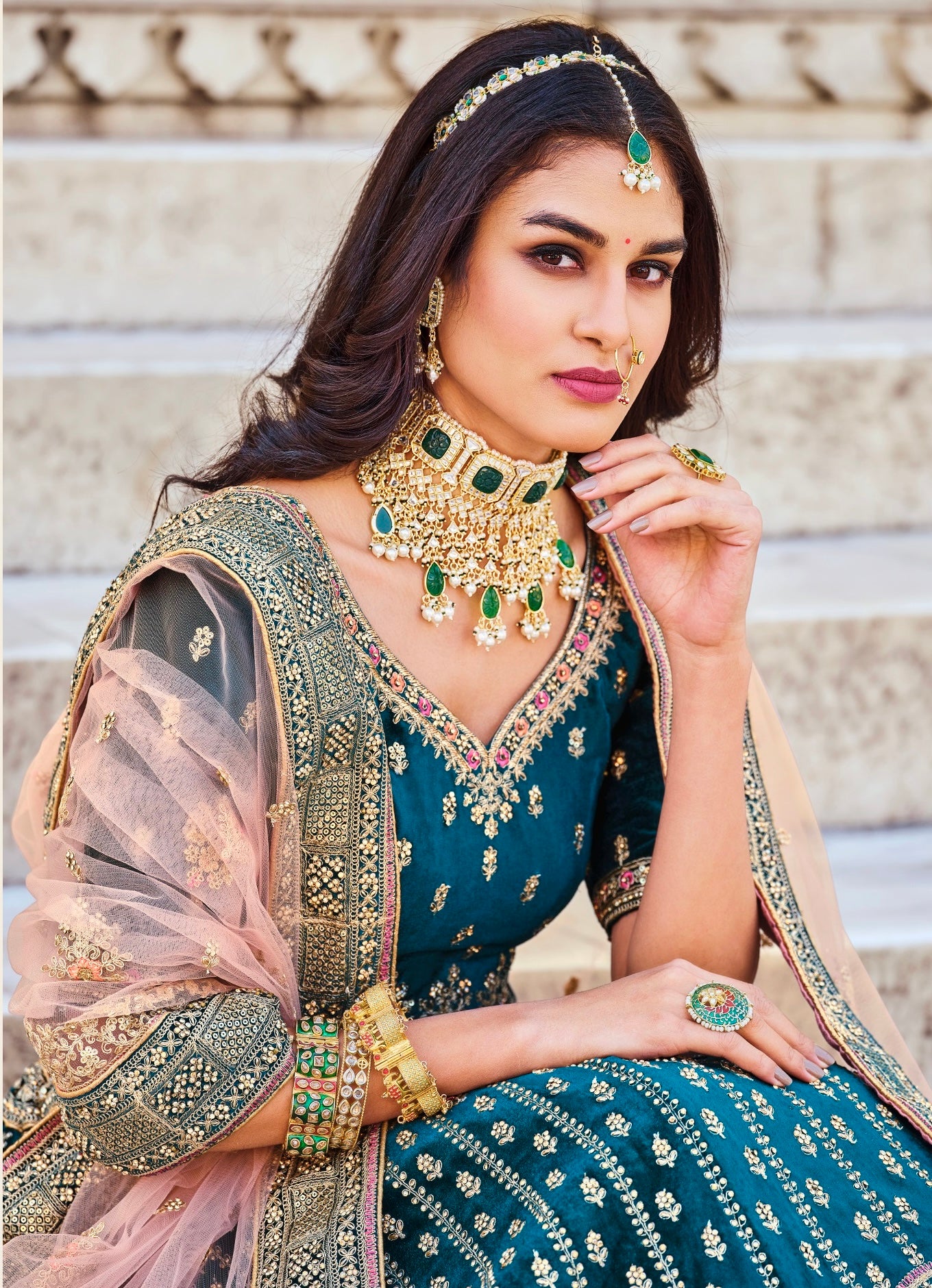 Laissez-vous sublimer par la grâce royale de nos lehengas en velours, magnifiés par des broderies raffinées et un travail de pierres étincelant. Chaque pièce est un hommage à la beauté intemporelle de la mariée indienne.