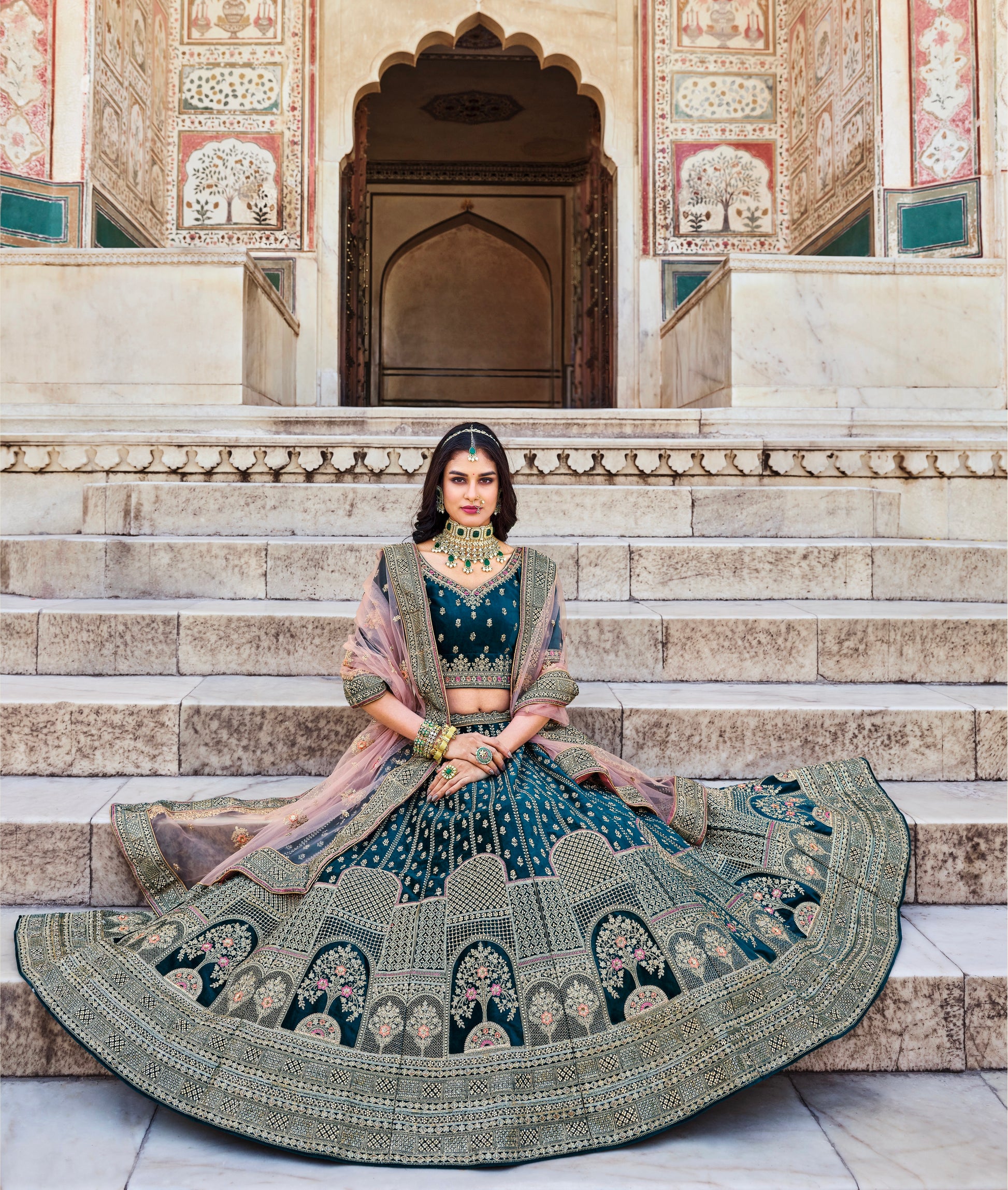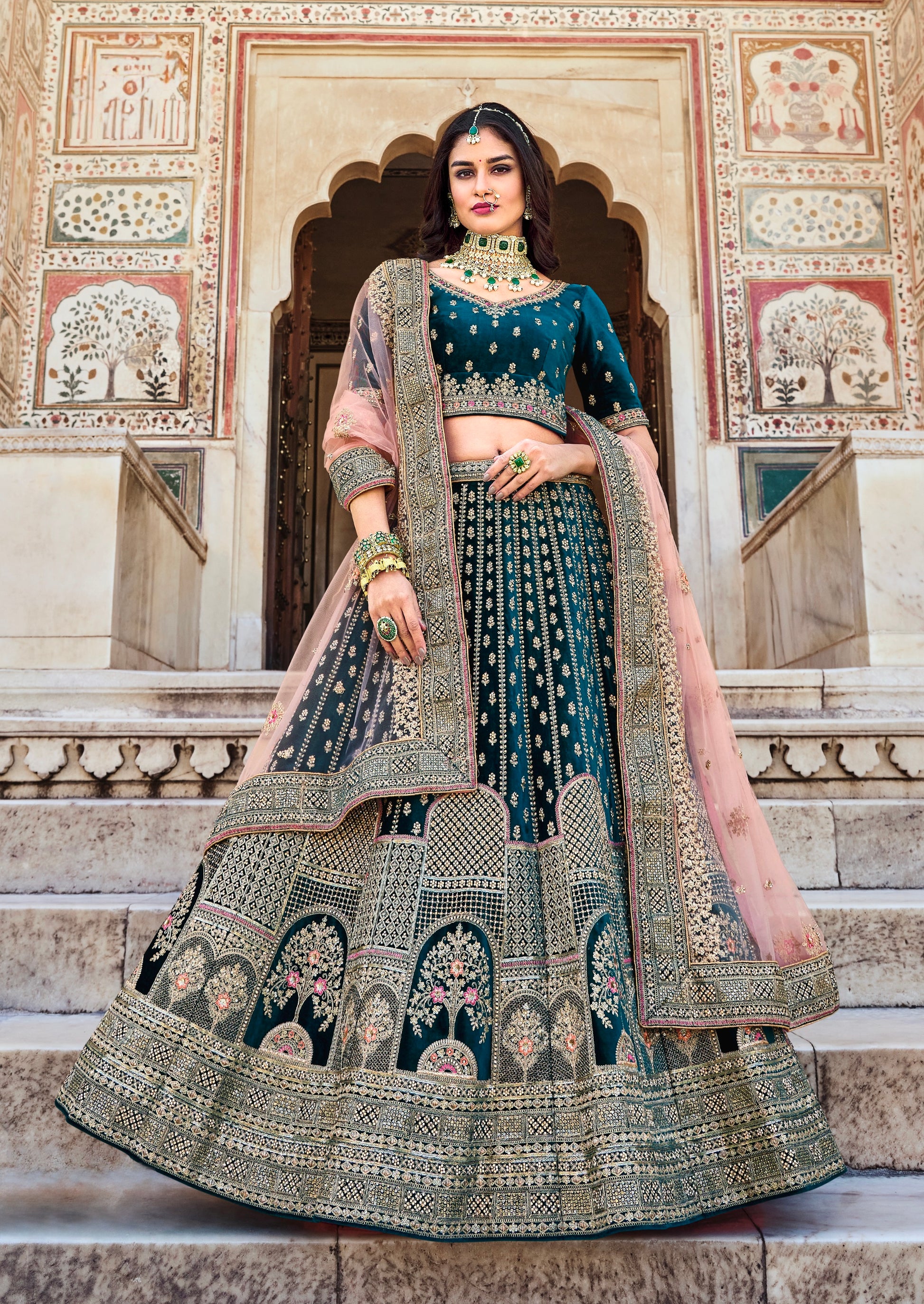 Lehenga de Mariée Bleu Sarcelle en Velours Premium et Broderies avec Incrustation de pierres et Zarkan