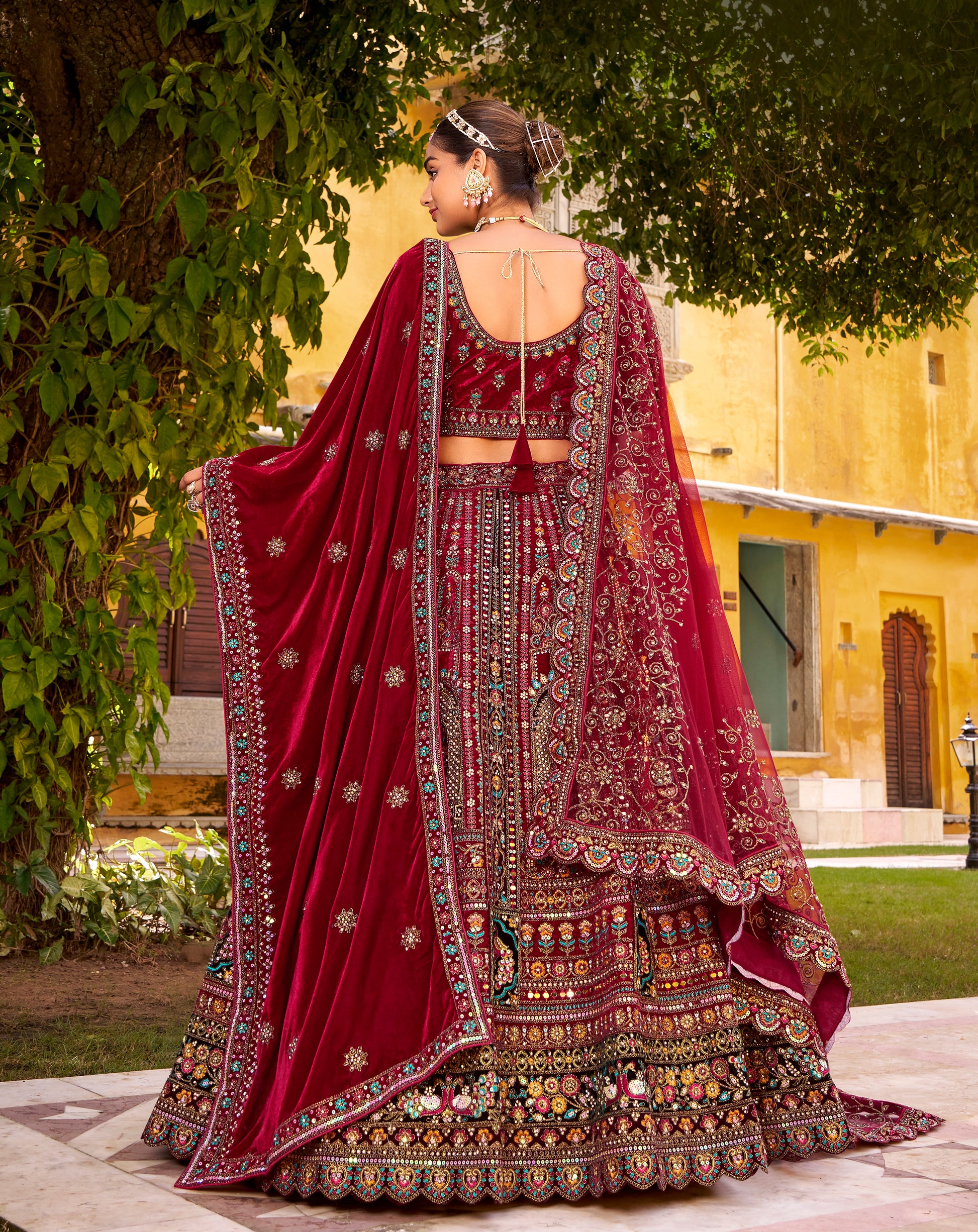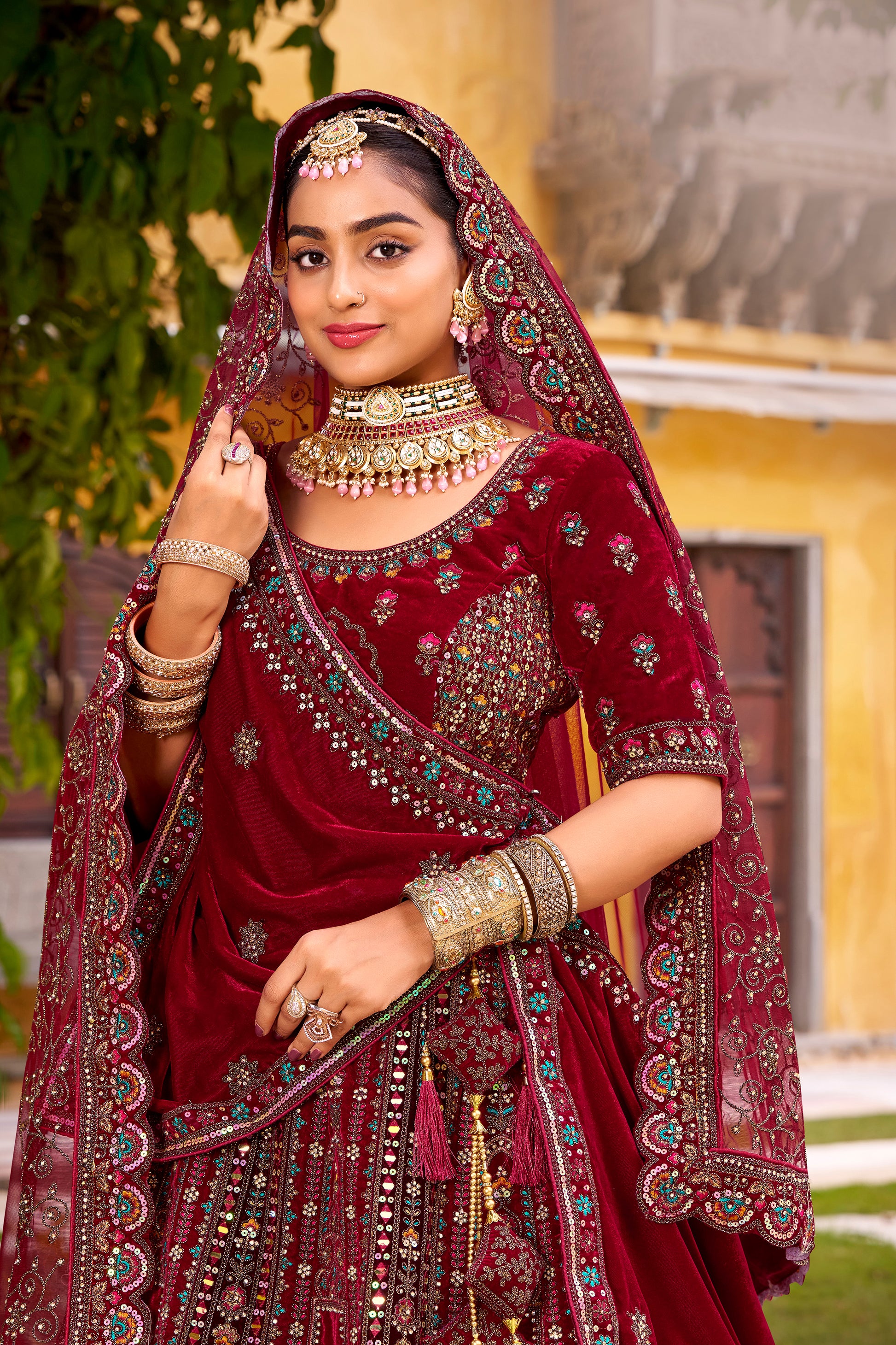 Lehenga de mariée rouge bordeaux foncé traditionnel en velours premium inspiration de créateur COLLECTION SAHIBA