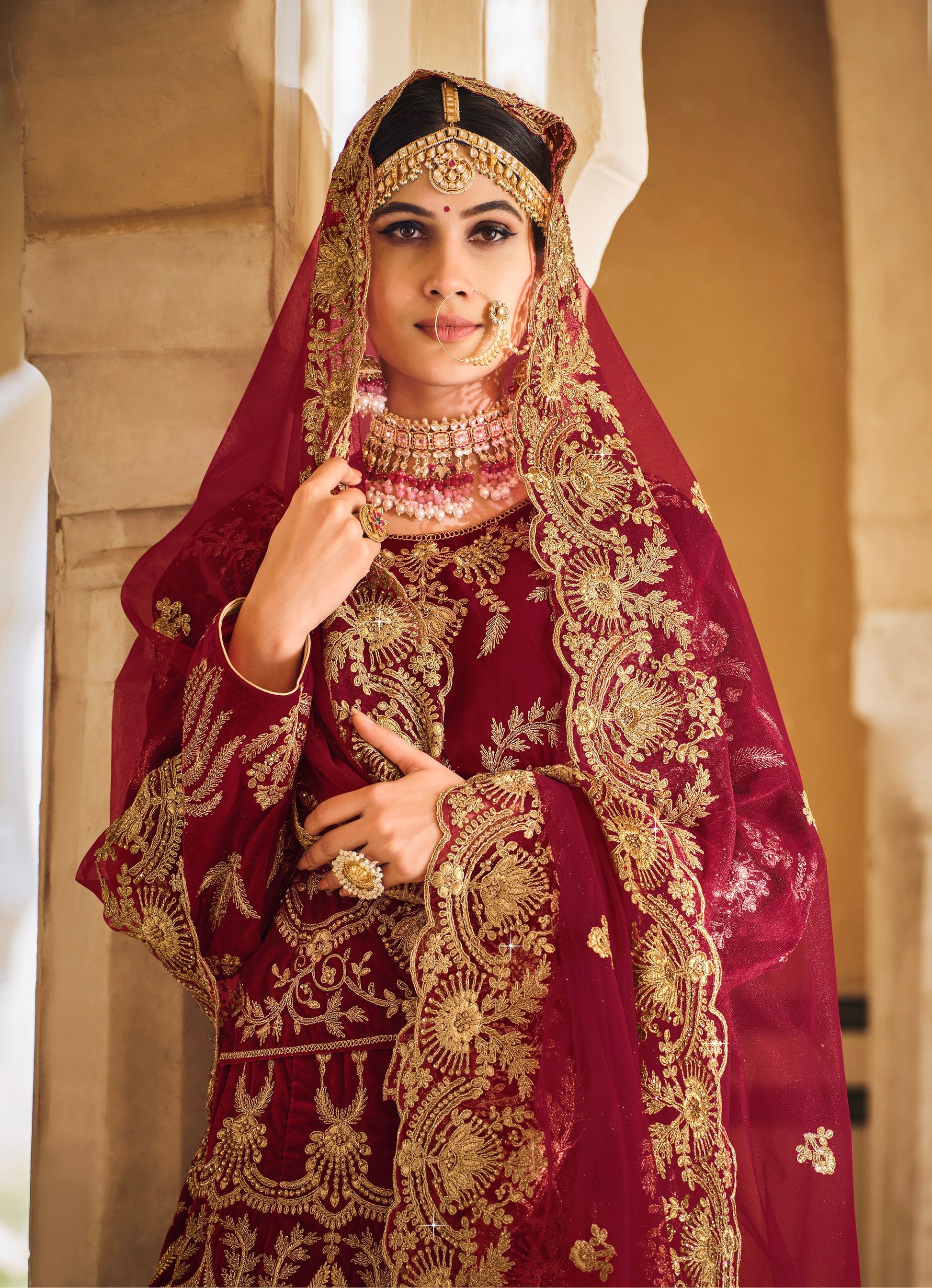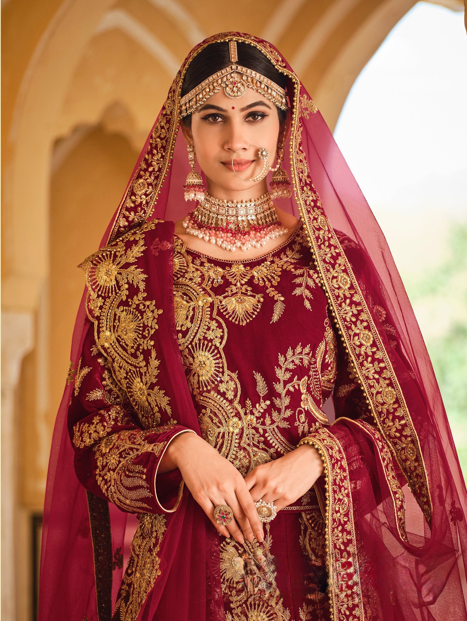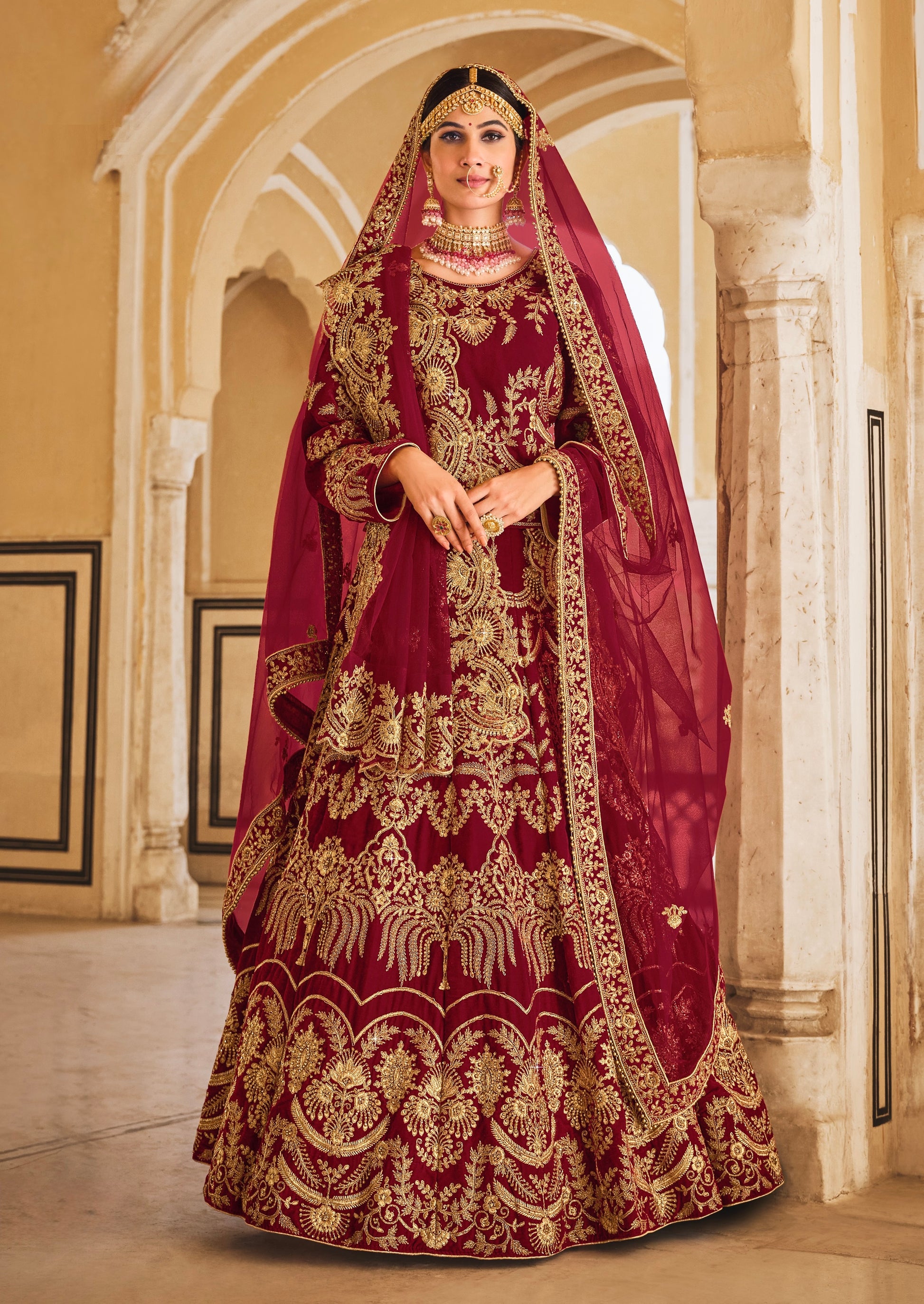 Lehenga de Mariée Rouge en Velours de qualité supérieure et Double dupatta avec Broderies et Zarkan