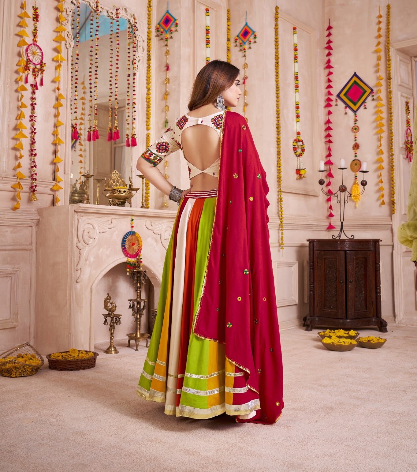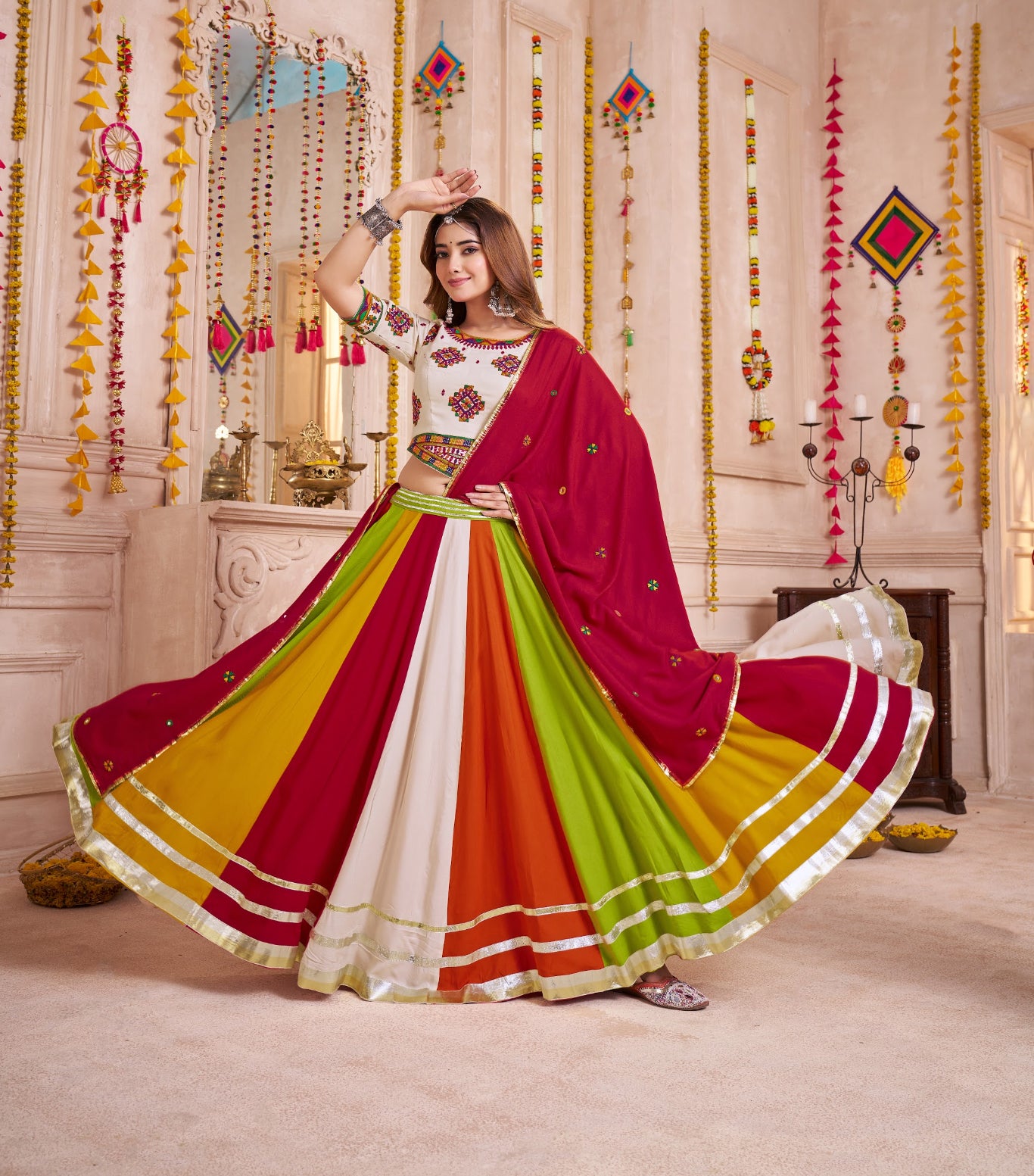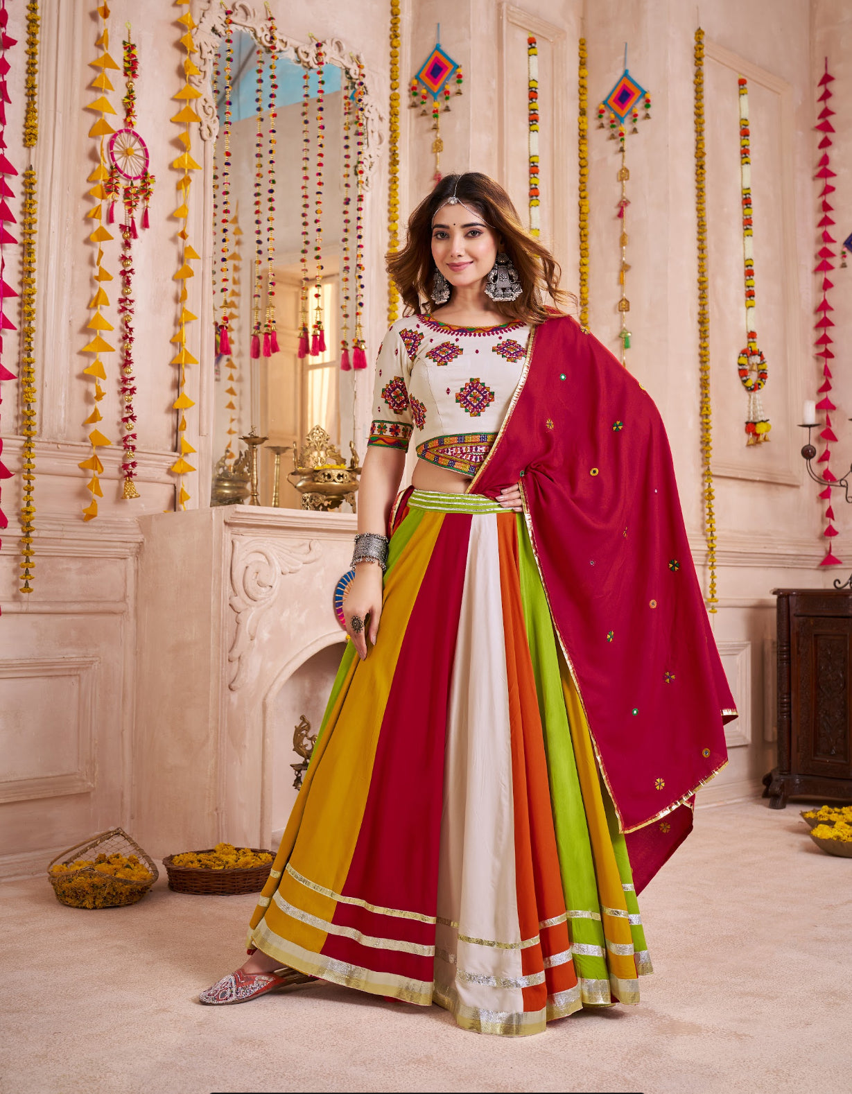 Lehenga de Navratri blanc rouge et vert multicolore en viscose coton avec broderies et bordure lampi