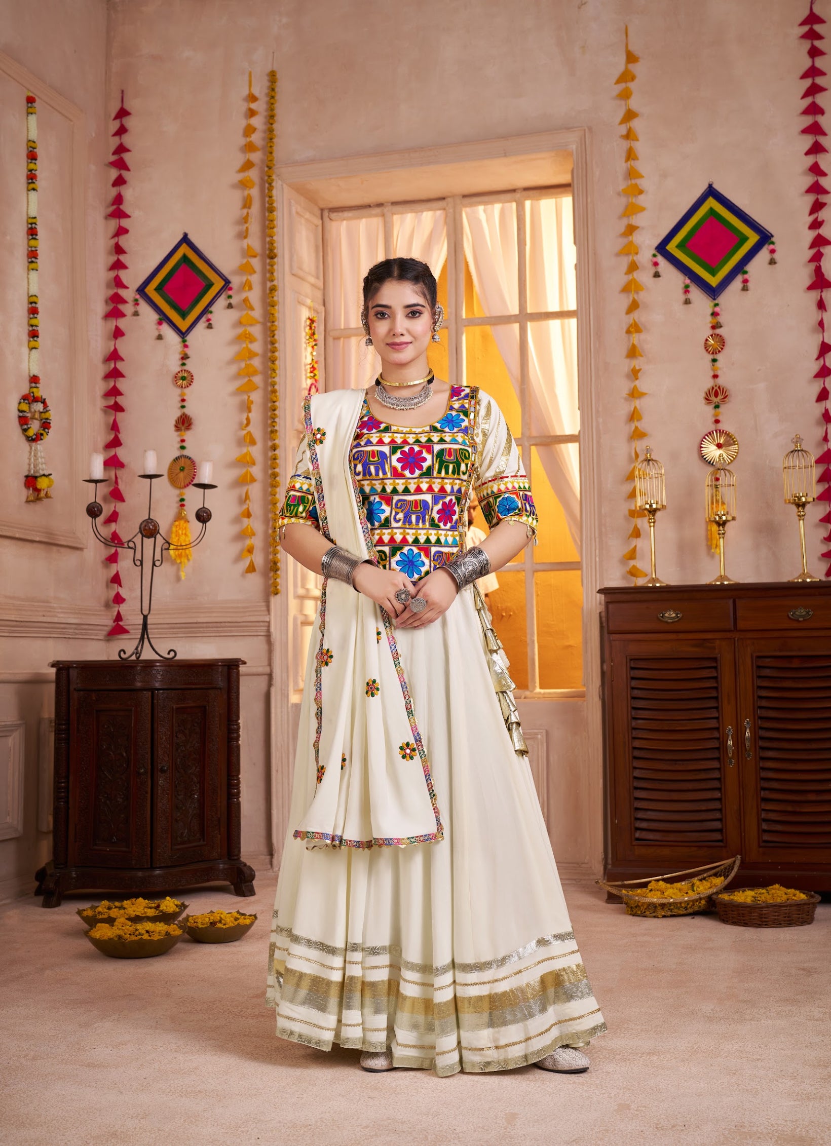 Lehenga de Navratri blanc crème multicolore en viscose coton avec travail kutchi