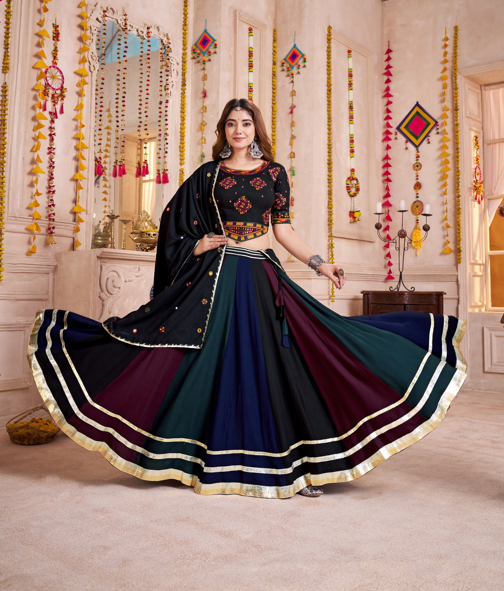 Lehenga de Navratri noir et bleu marine multicolore en viscose coton avec broderies et bordure lampi