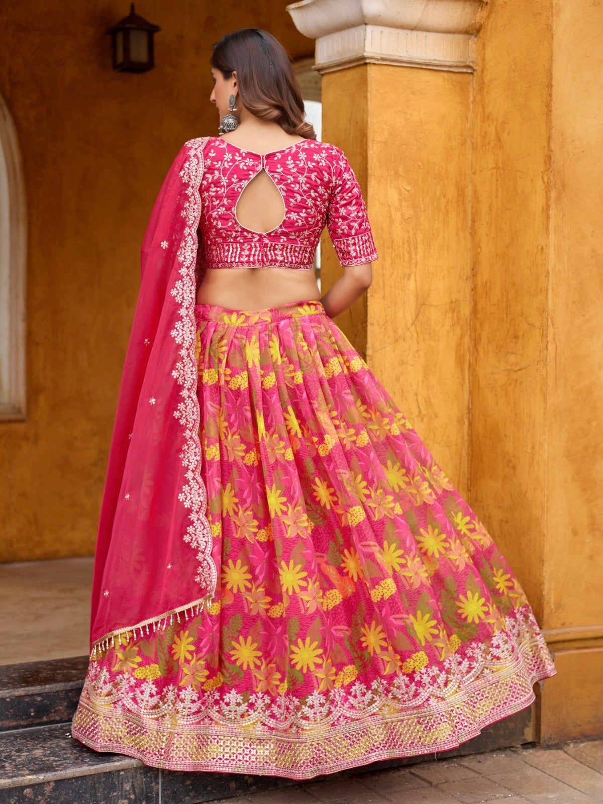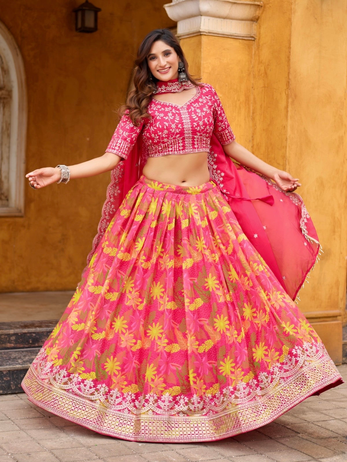 Plongez dans l’élégance avec nos lehengas colorés et vibrants en soie Taby avec imprimé, légers et raffinés, sublimés par un can-can qui leur confère un tombé parfait. Vous prendrez plaisir à les porter pour vos plus beaux événements, c’est certain !