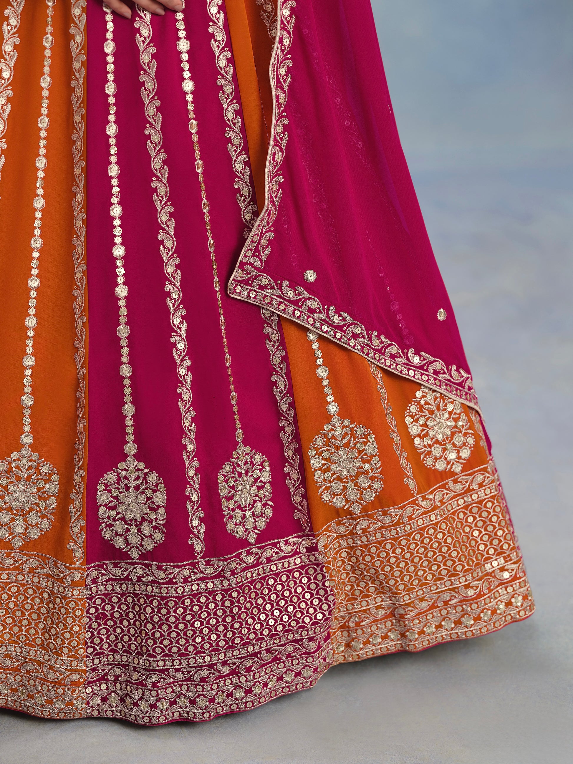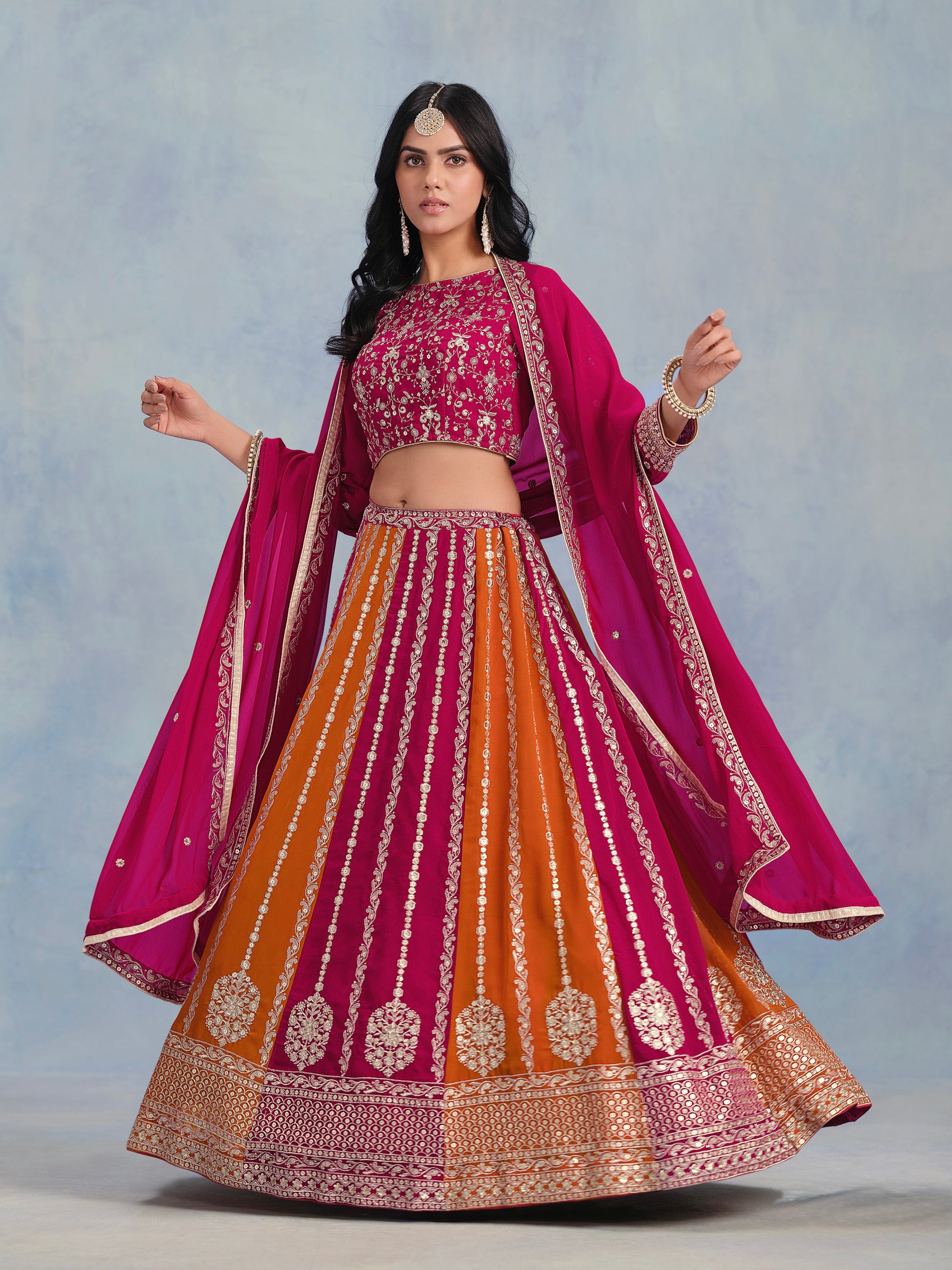 Lehenga rose fuchsia multicolore en faux georgette avec broderies travaillées
