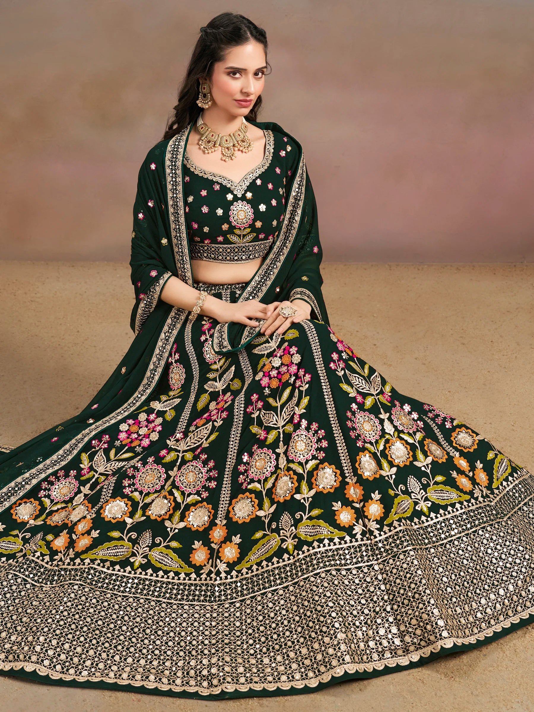 Lehenga vert foncé riche en georgette avec broderies de fleurs colorés et sequins COLLECTION SIMRAN