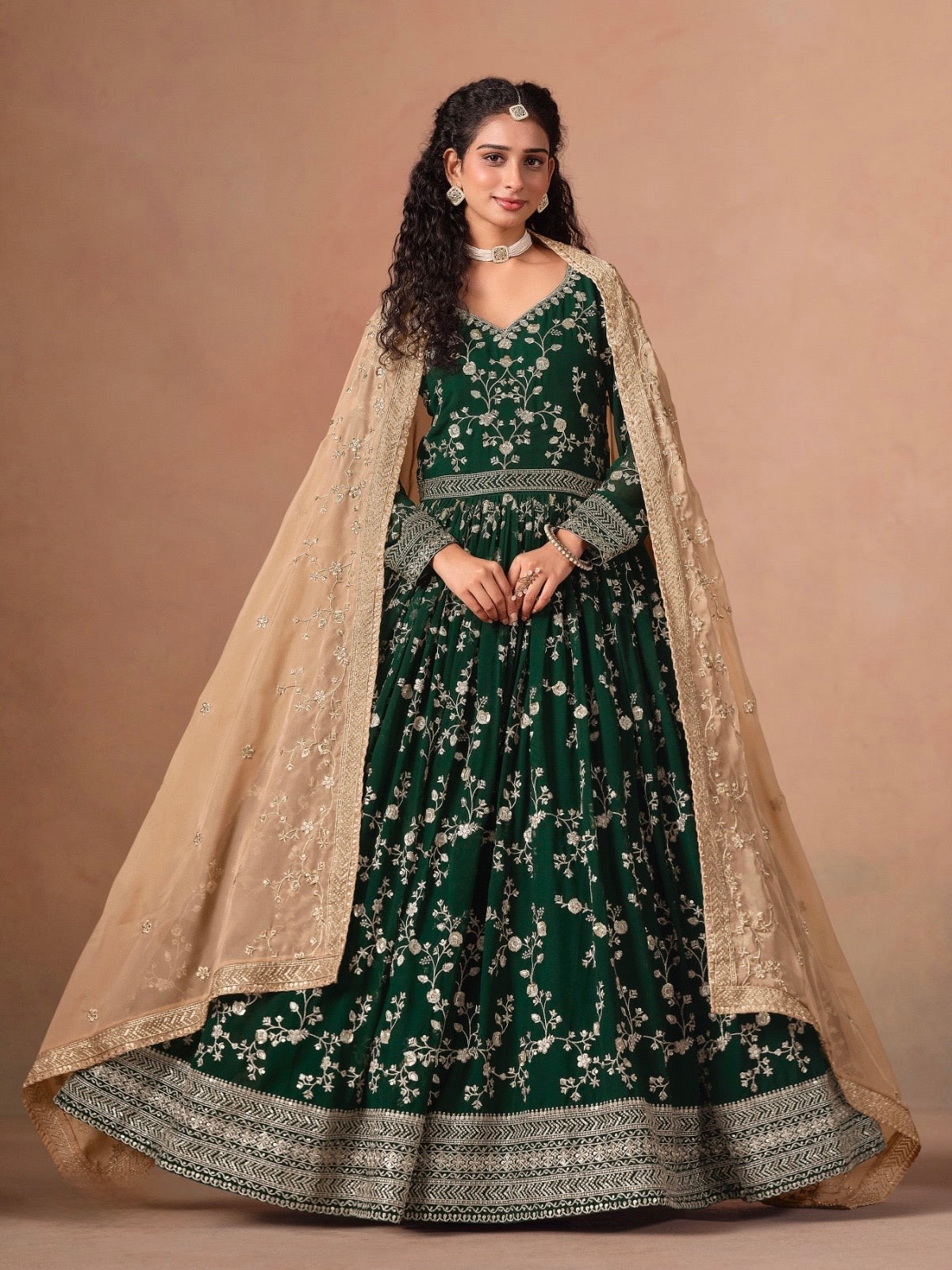 Lehenga en faux georgette vert sapin au choli mi-long COLLECTION MINA