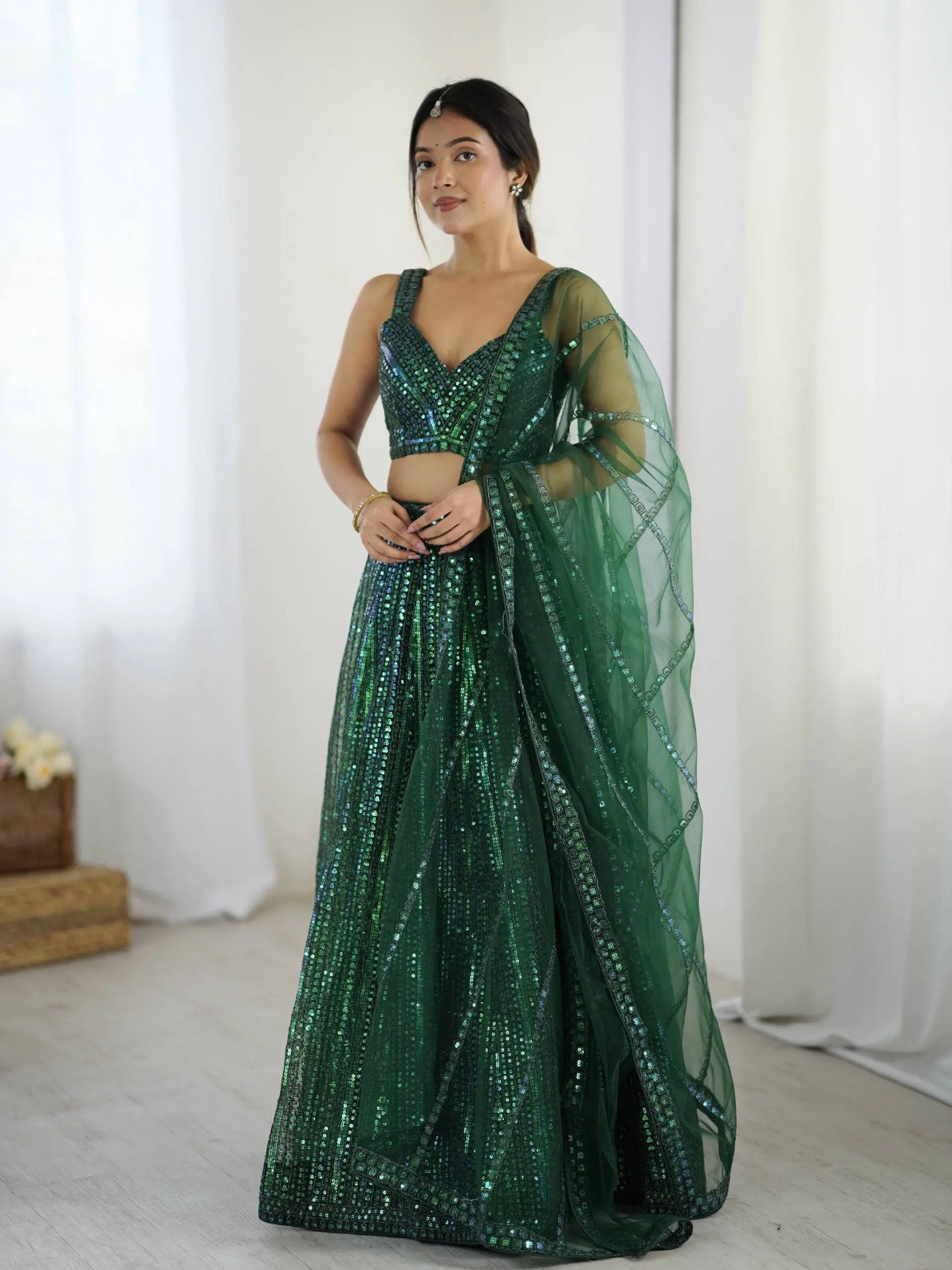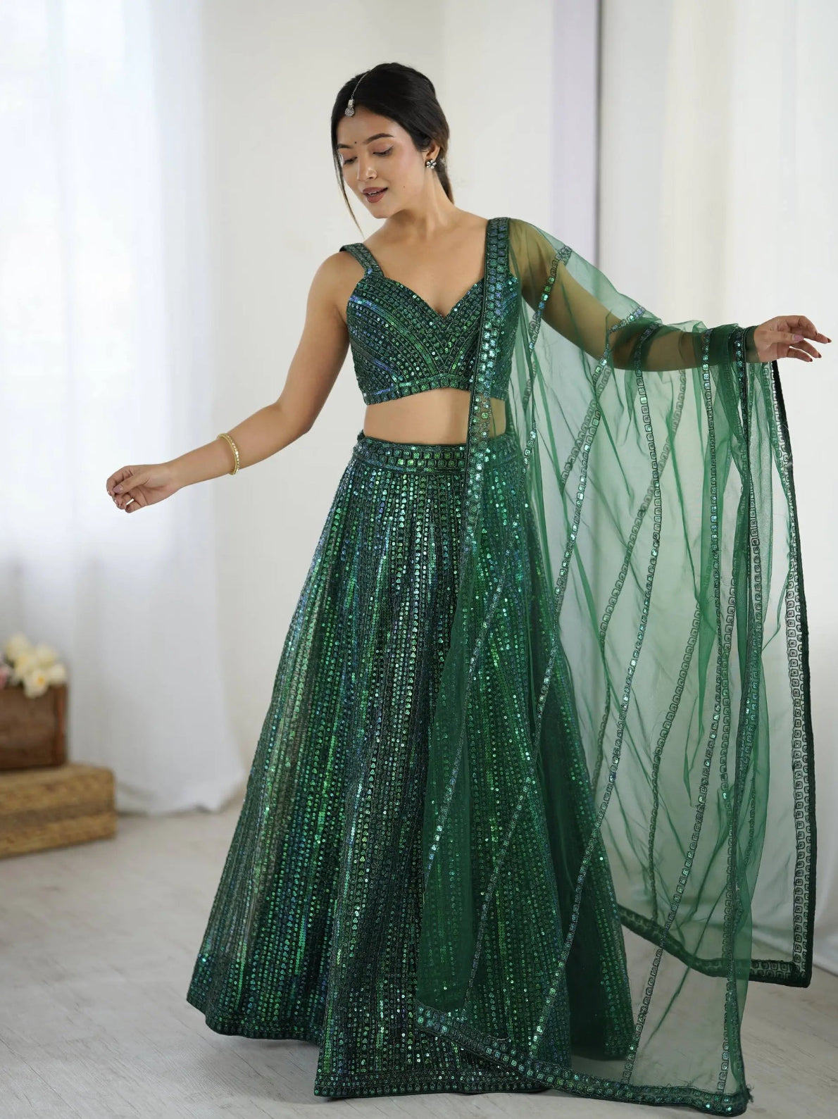 Lehenga Vert Émeraude en tulle orné de sequins brillants spécial fête