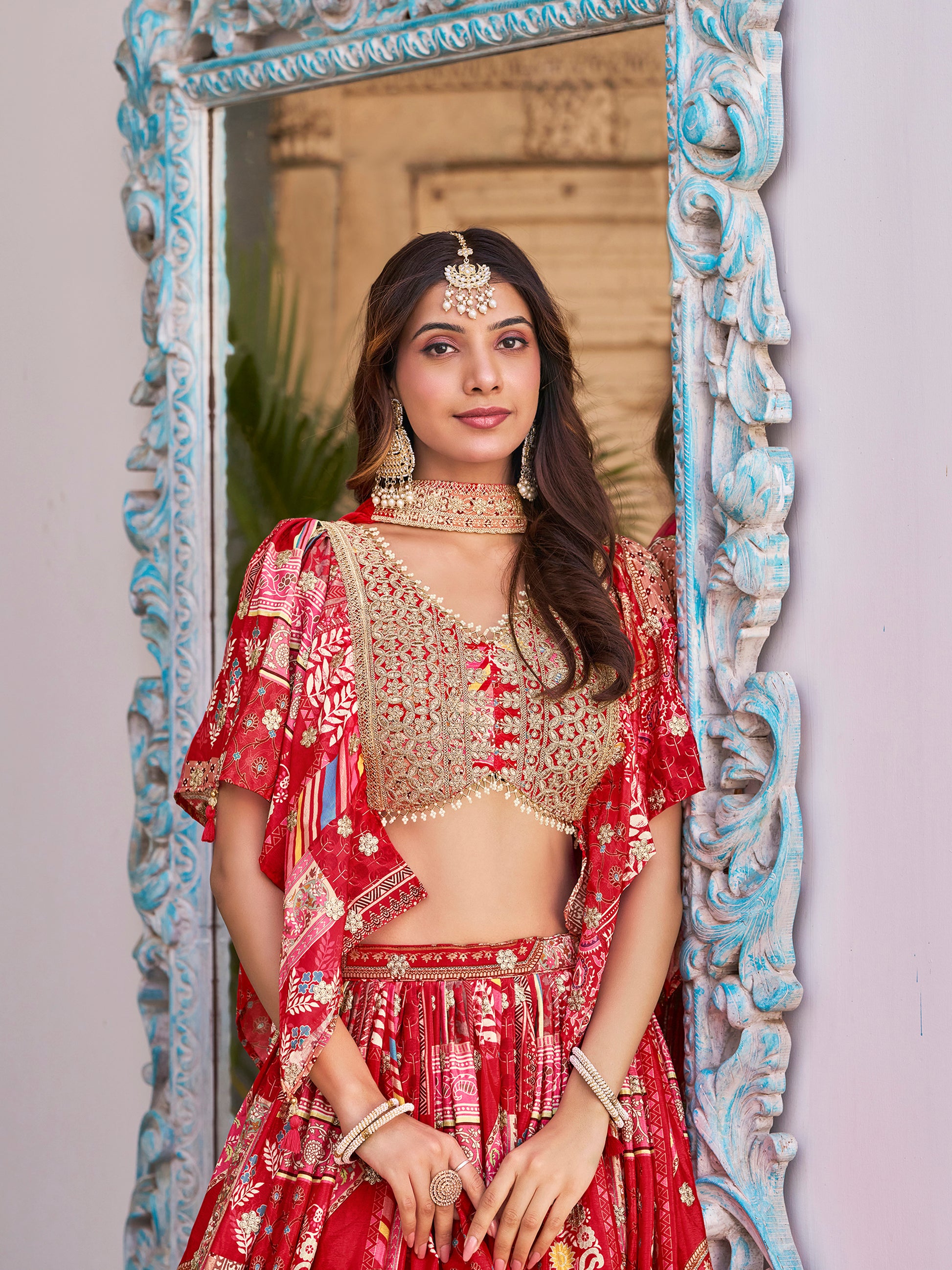 Lehenga rouge carmin et doré en soie chinon avec dupatta style choker et manches courtes stylisées COLLECTION MEGHNA