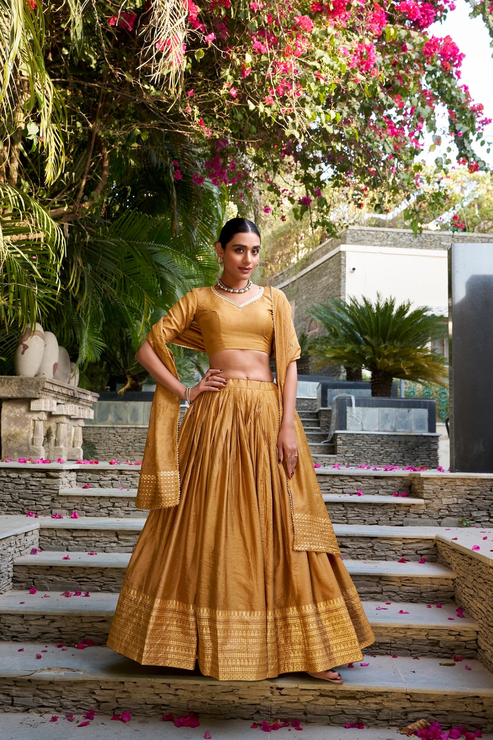 Lehenga Choli en soie Chanderi moutarde clair avec travail de tissage en zari