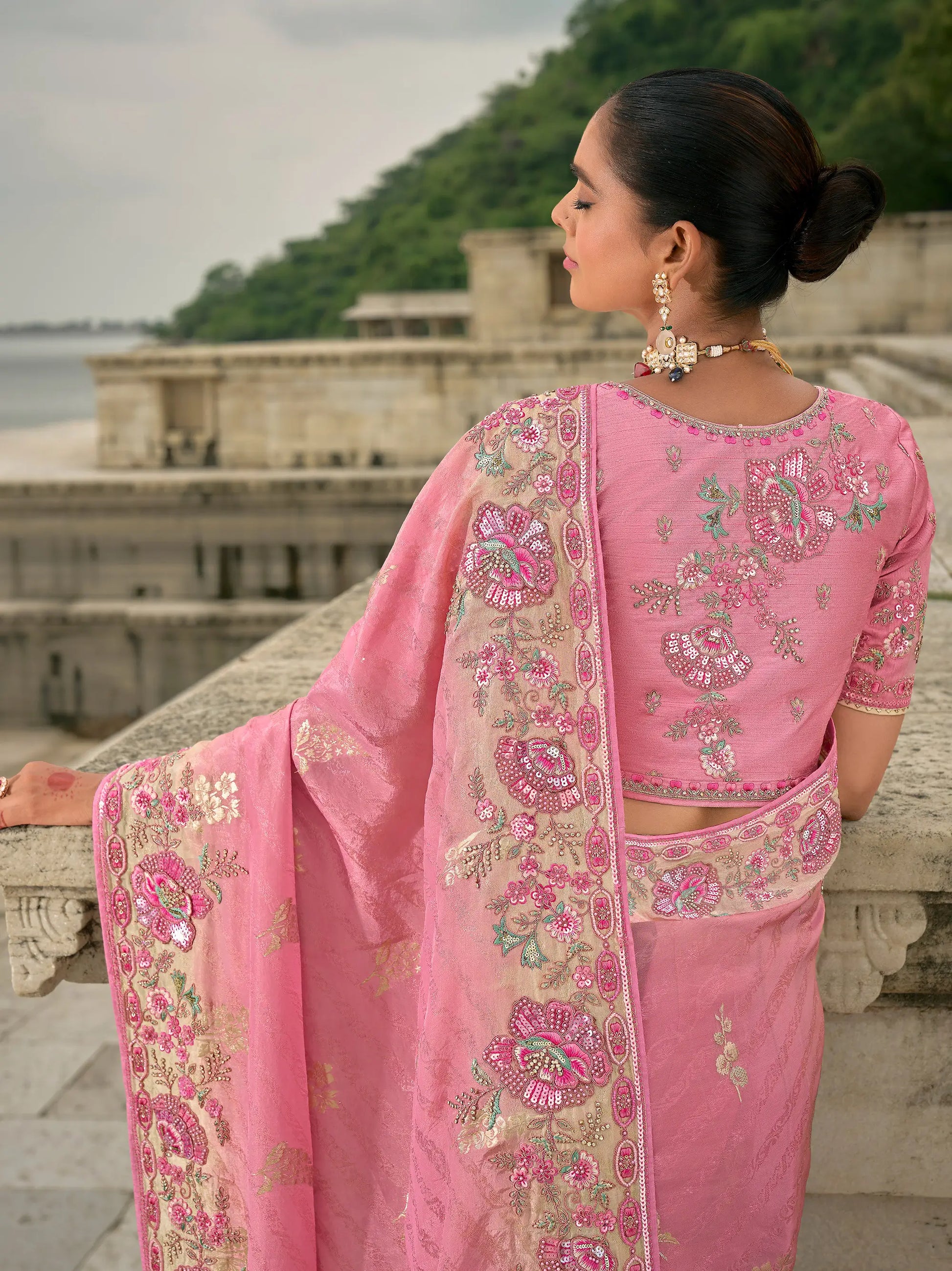 Sari Rose en jacquard de viscose avec broderie, perles, khatli et travail de tissage zari
