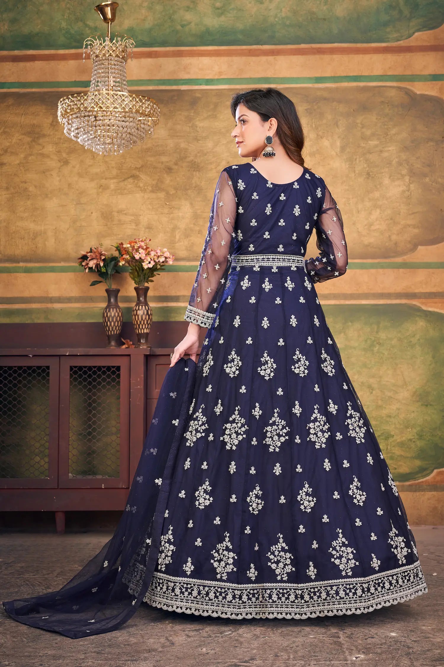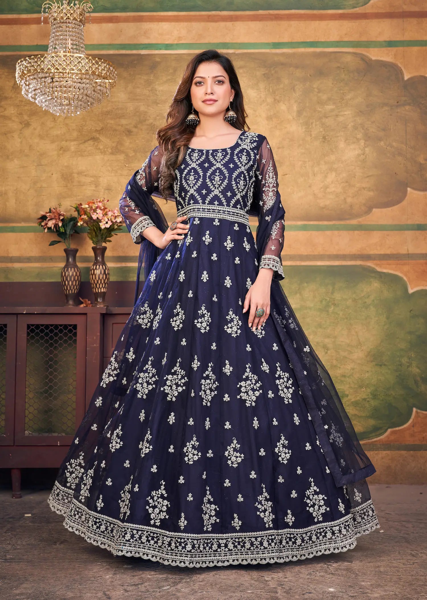 Robe bleu marine en tissu net avec broderie en zari et au fil