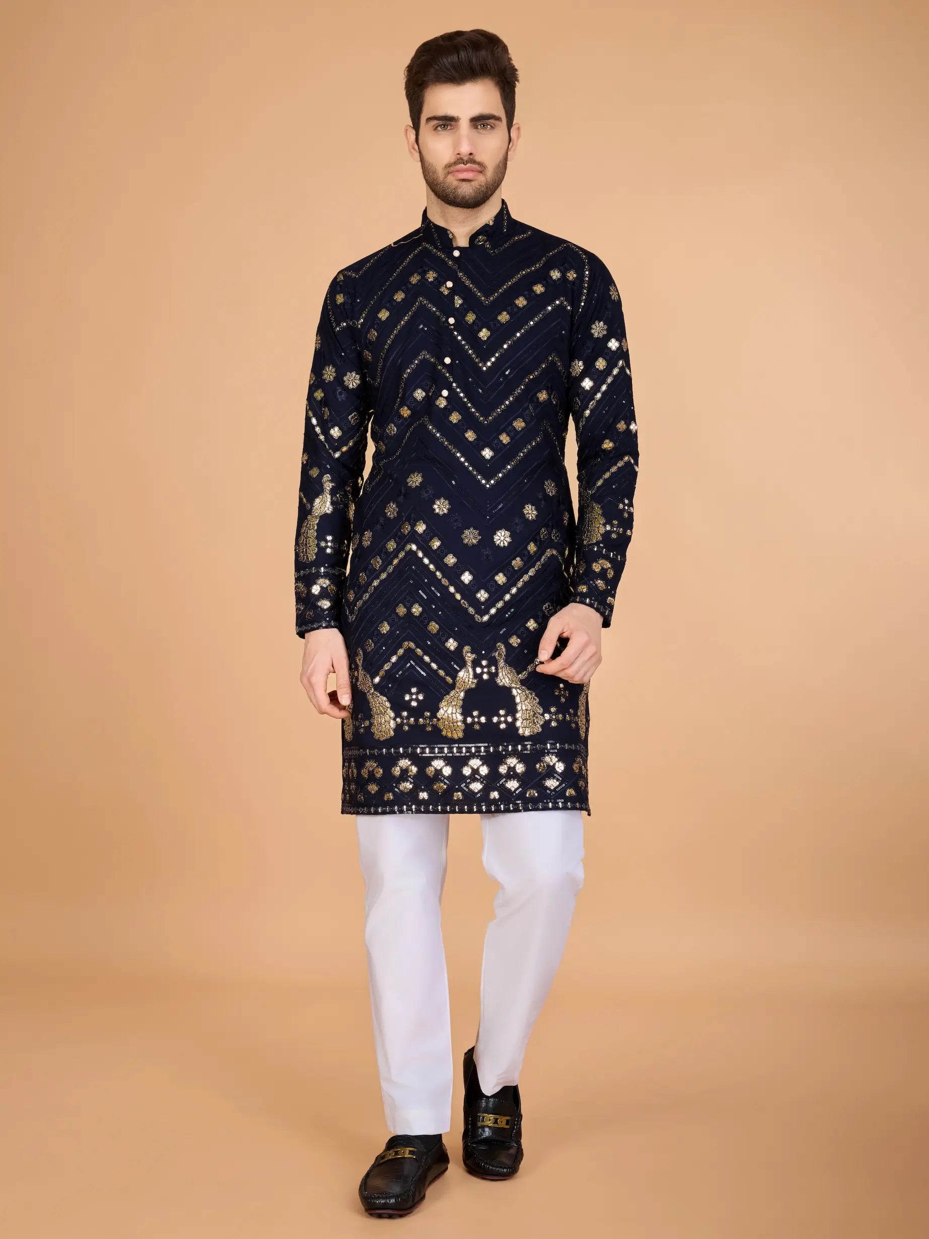 Kurta en Rayon Pur Bleu Marine avec Broderie au Fil et Sequins