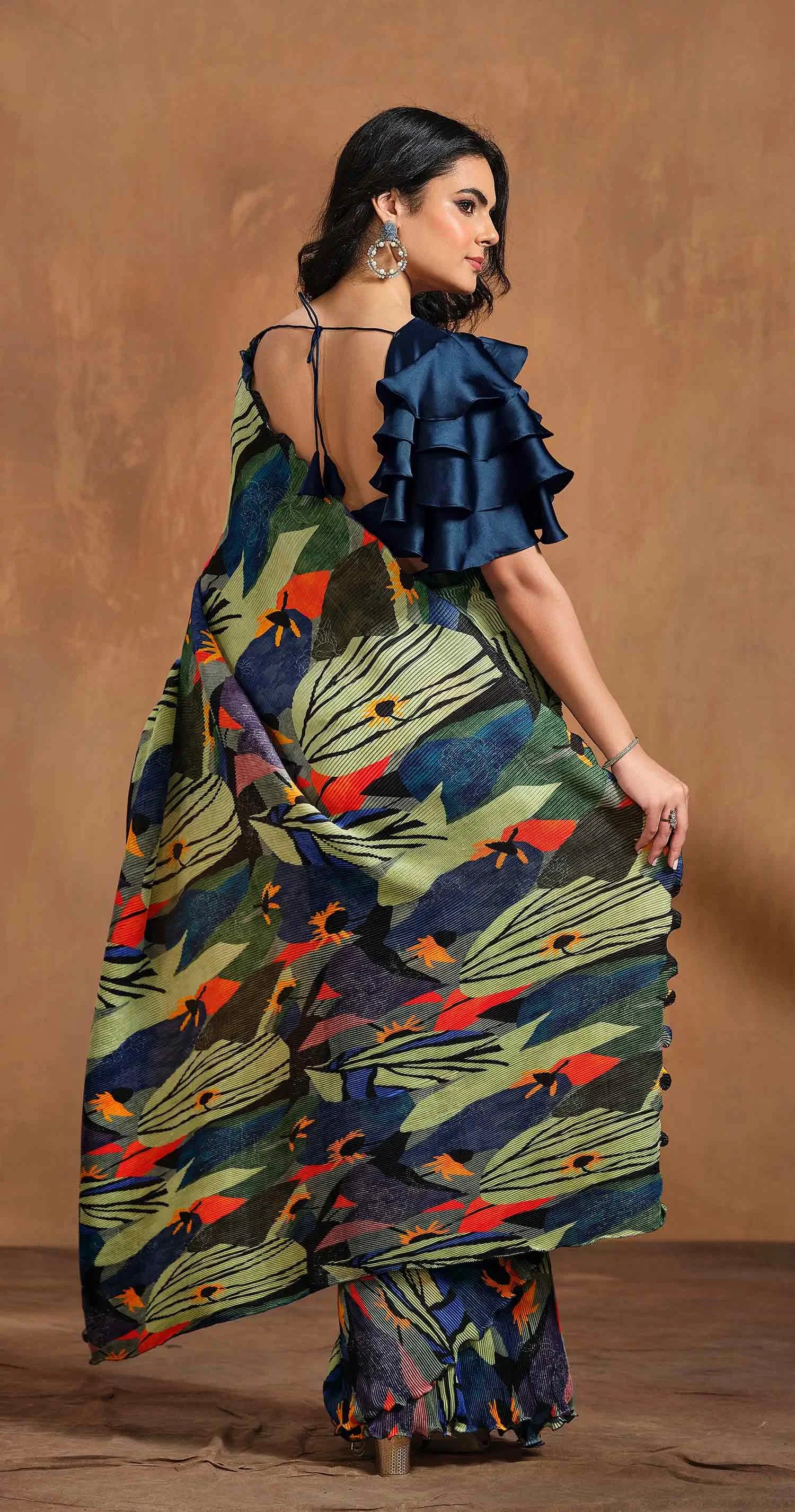Découvrez notre Sari Prêt-à-Porter Une Minute, conçu pour une élégance instantanée. Confectionné en pure soie satinée avec d'élégants imprimés numériques, il est accompagné d'un corsage travaillé à la main et d'une ceinture ornée artisanalement pour une finition stylée. Parfait pour les mariages, les soirées ou les événements mondains—soyez éblouissante en une minute.
