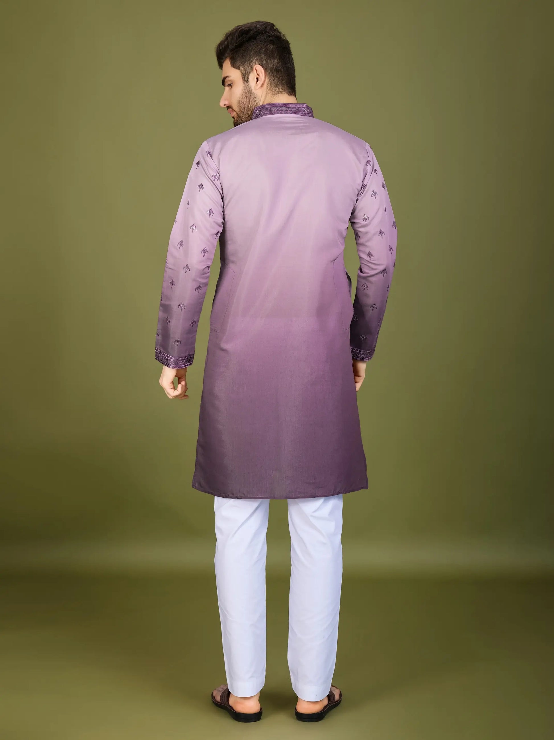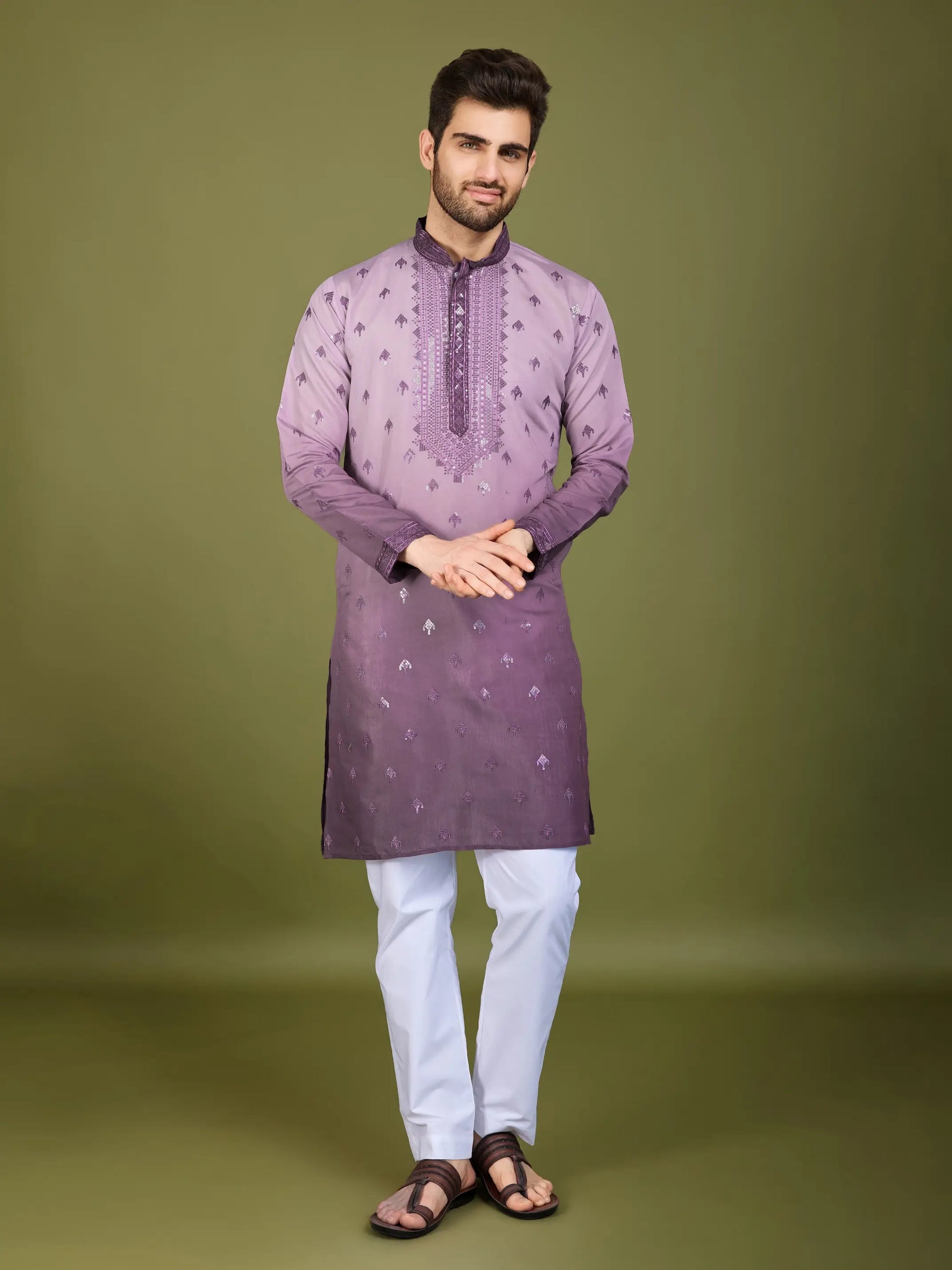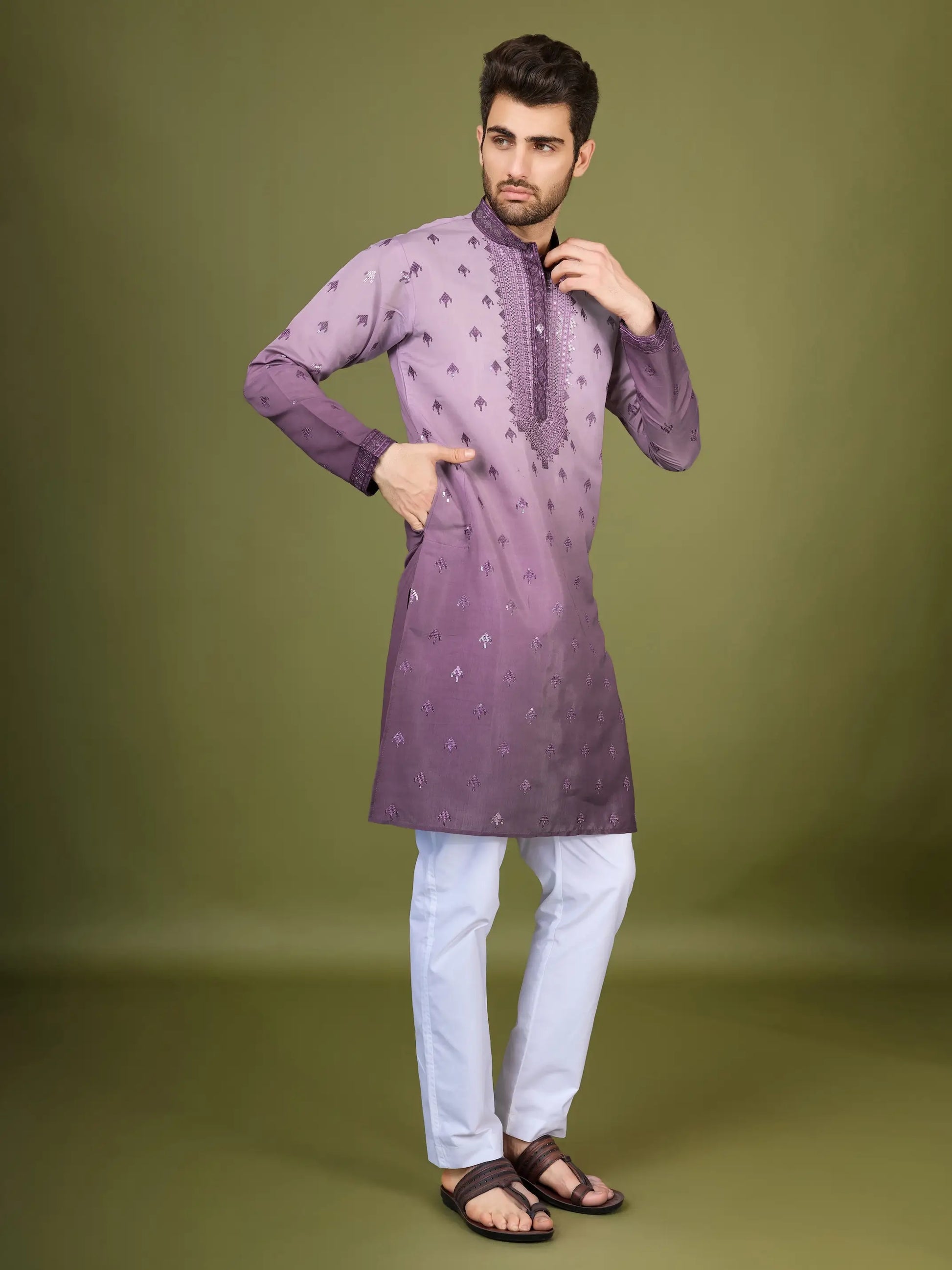 Kurta violet ombré en soie, orné de broderies au fil de soie et de sequins, avec pantalon assorti