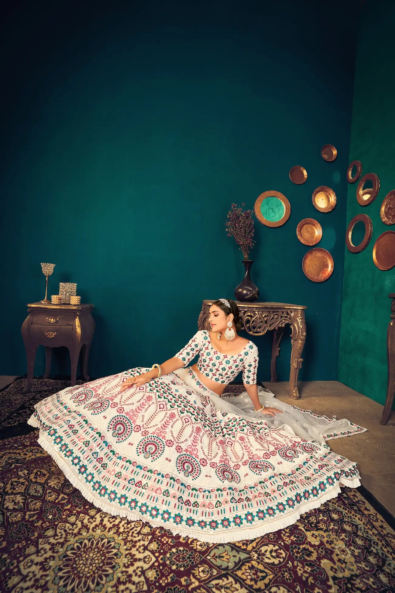 Lehenga Choli en Georgette Blanc Perle avec Broderie en Fil, Sequins et Gota Patti