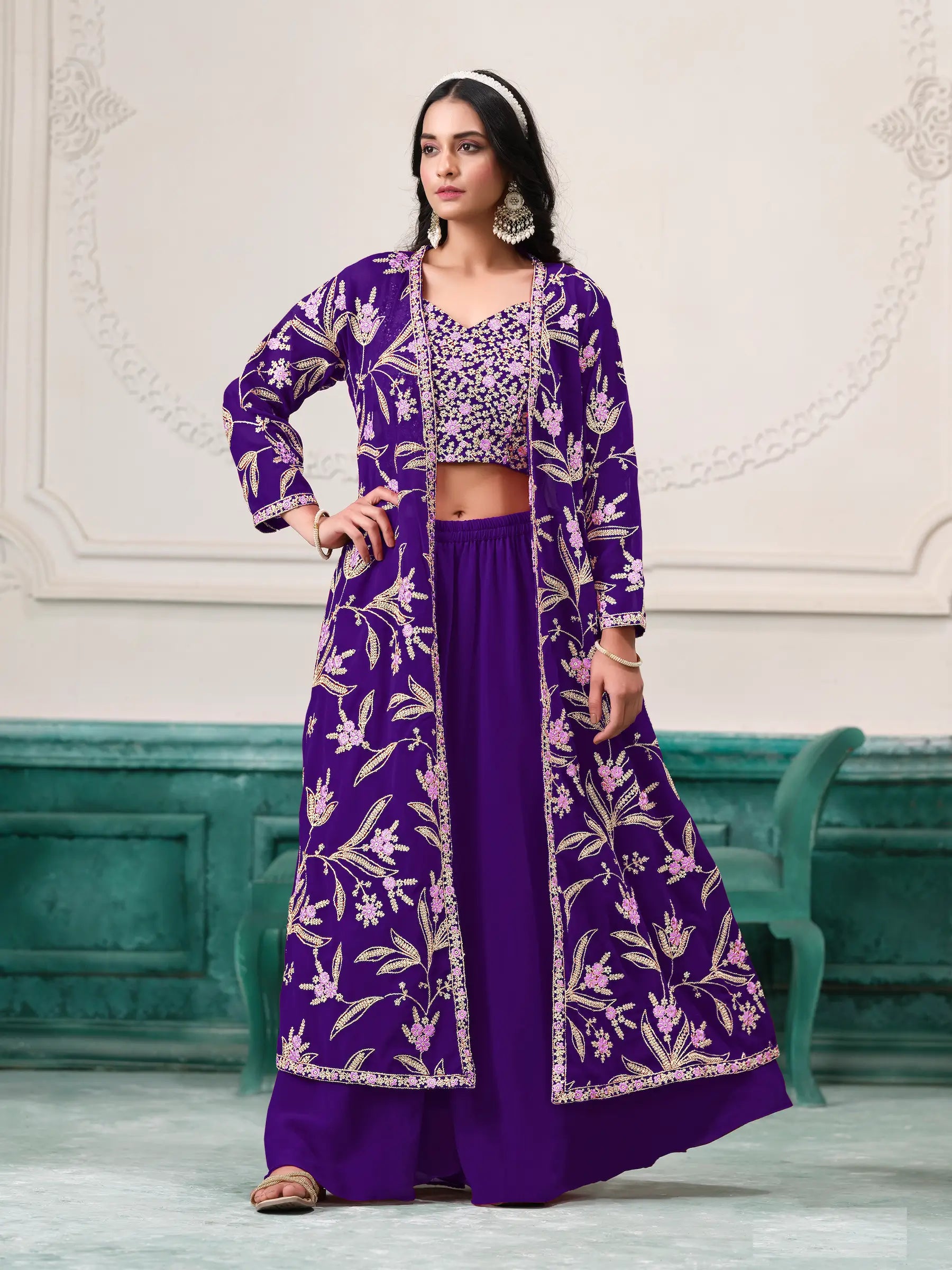 Ensemble Sharara indo-occidental violet en georgette avec broderie en fil et sequins