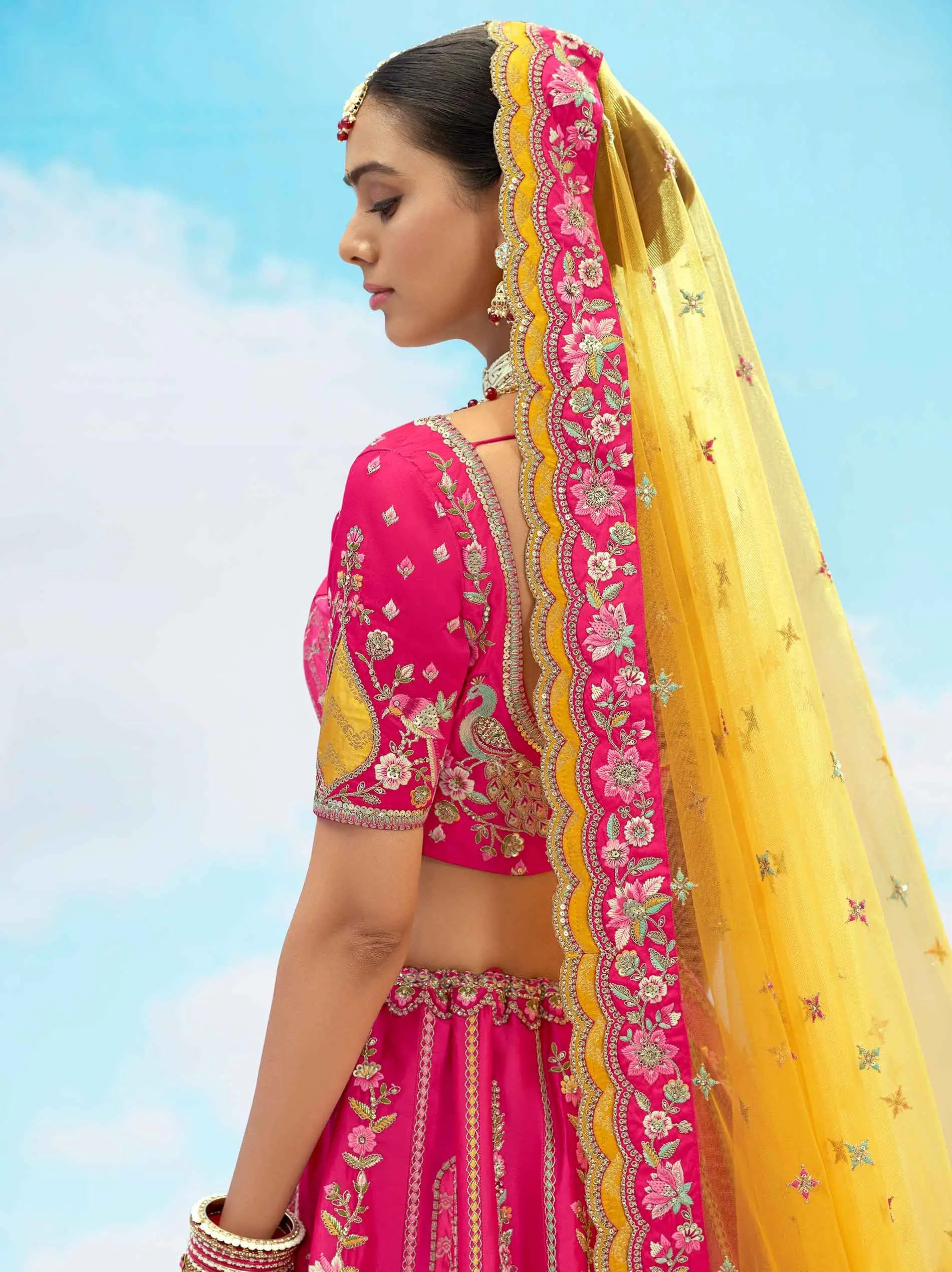 Lehenga de mariée exclusif Designer rose fuchsia avec broderies et appliques travaillées COLLECTION NAVYA 2025