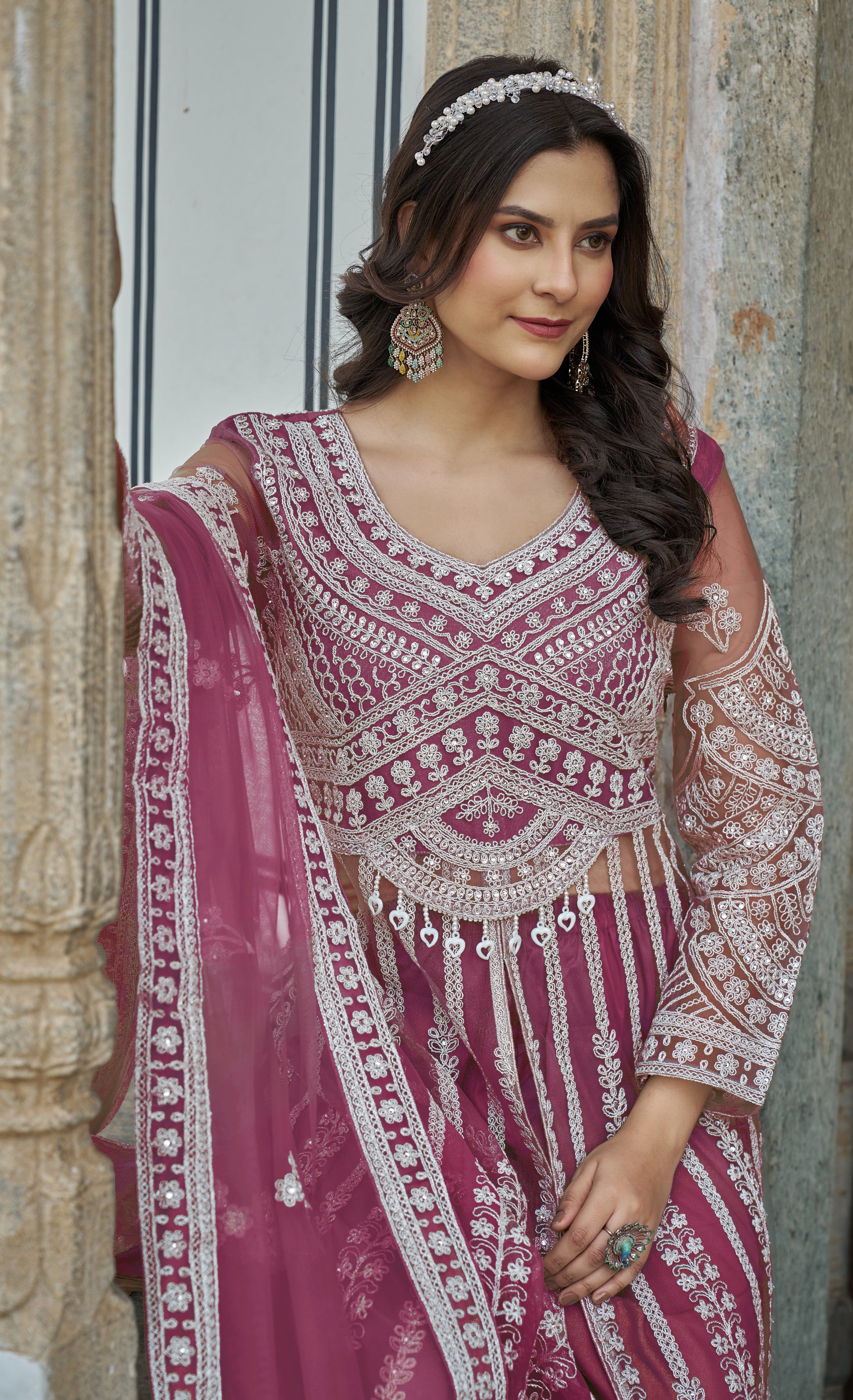 Préparez-vous à sublimer vos fêtes avec notre nouvelle tenue Anarkali ! Cet ensemble moderne marie raffinement et confort, avec son haut en Butterfly Net richement brodé à l’avant comme à l’arrière, rehaussé de délicates pierres scintillantes.