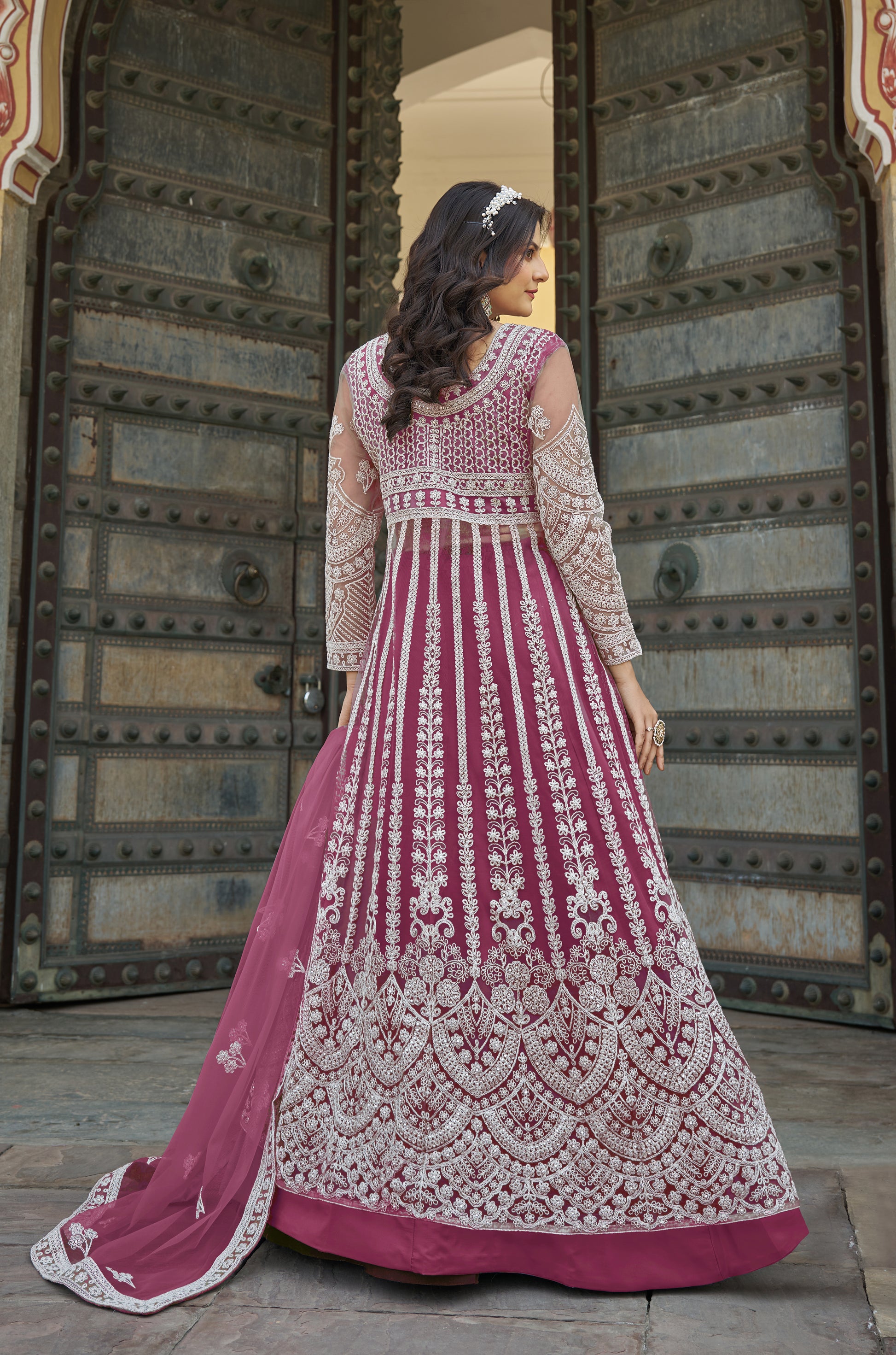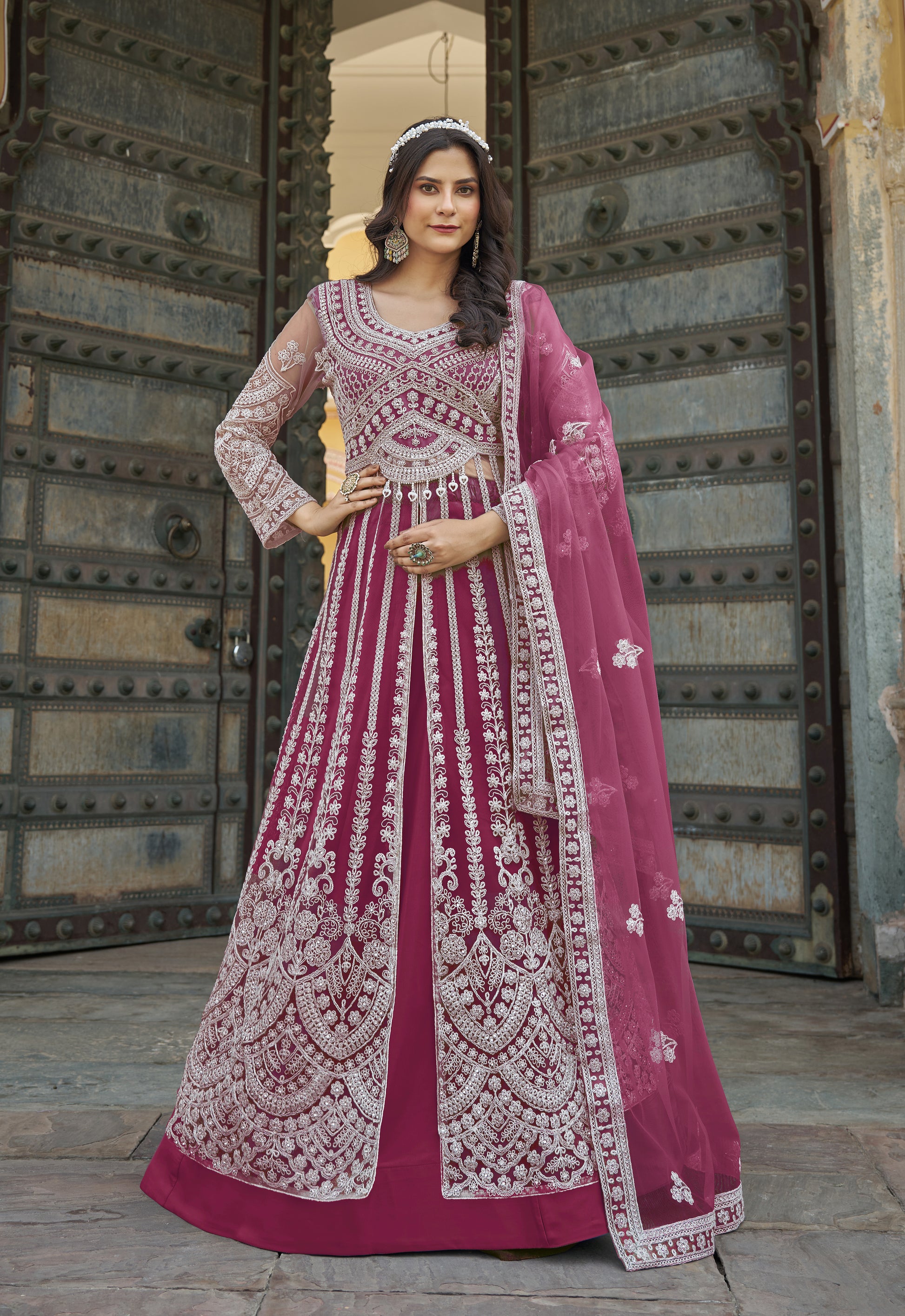 Robe Anarkali rose fuchsia en santoon avec pierres brillantes avec bas jupe