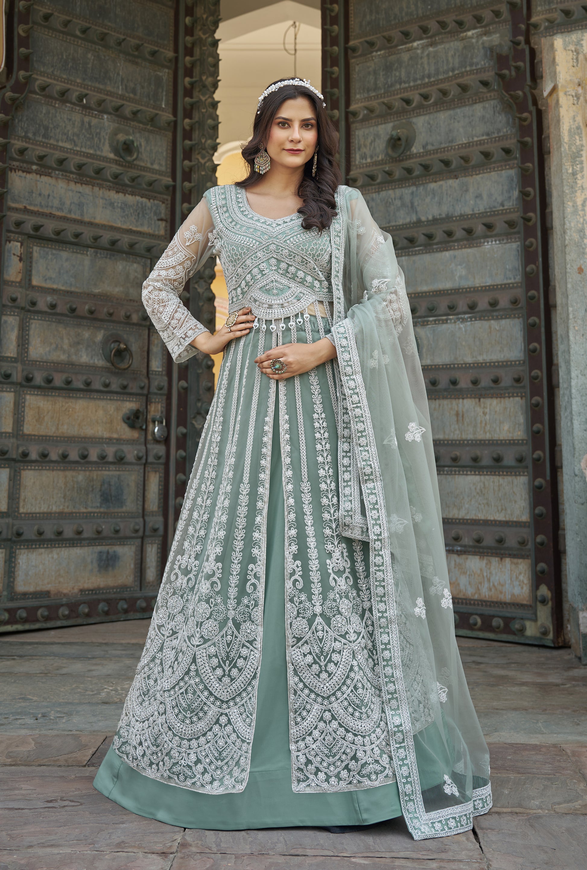 Robe Anarkali verte sauge en santoon avec pierres brillantes avec bas jupe