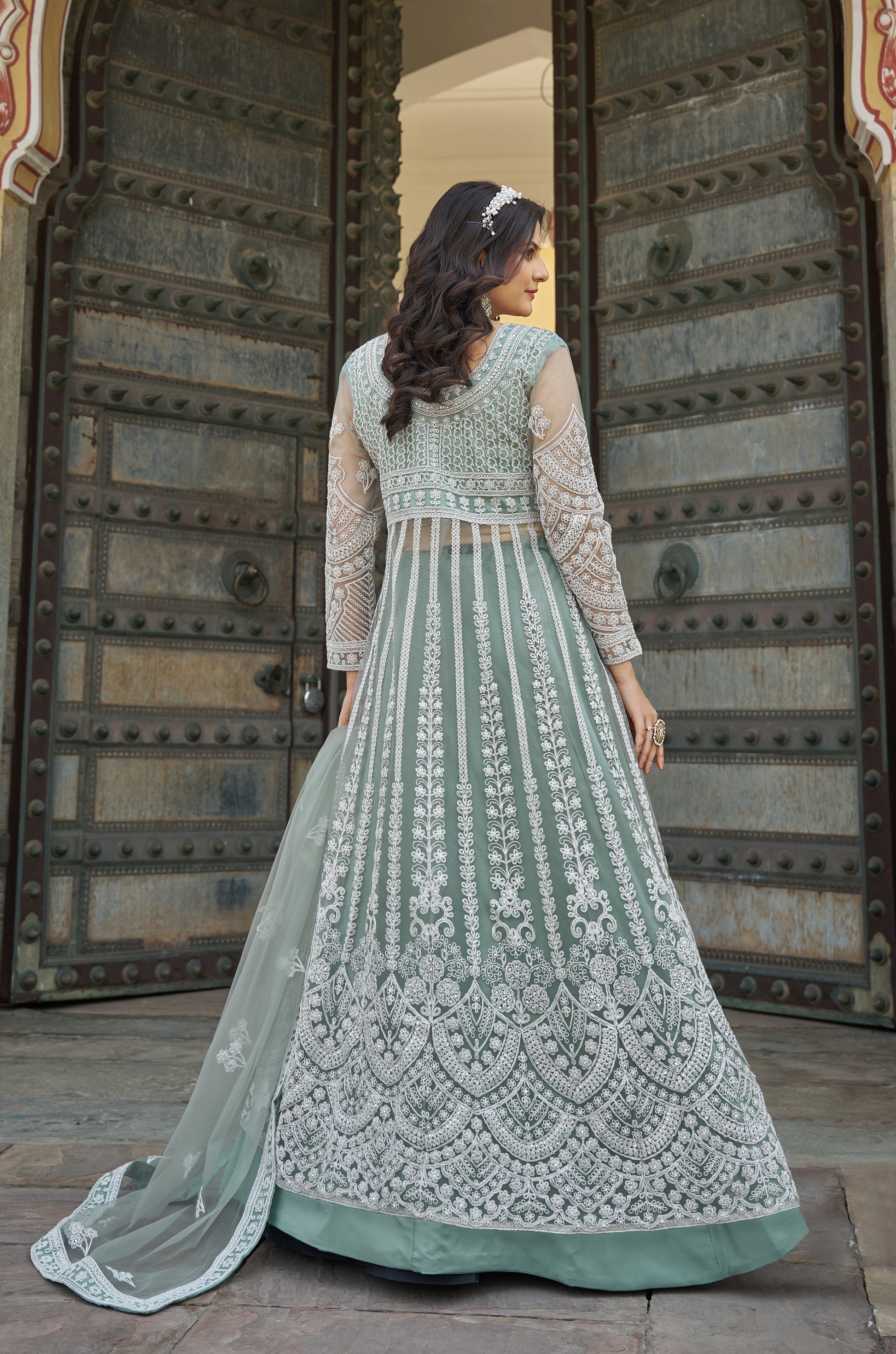 Préparez-vous à sublimer vos fêtes avec notre nouvelle tenue Anarkali ! Cet ensemble moderne marie raffinement et confort, avec son haut en Butterfly Net richement brodé à l’avant comme à l’arrière, rehaussé de délicates pierres scintillantes.