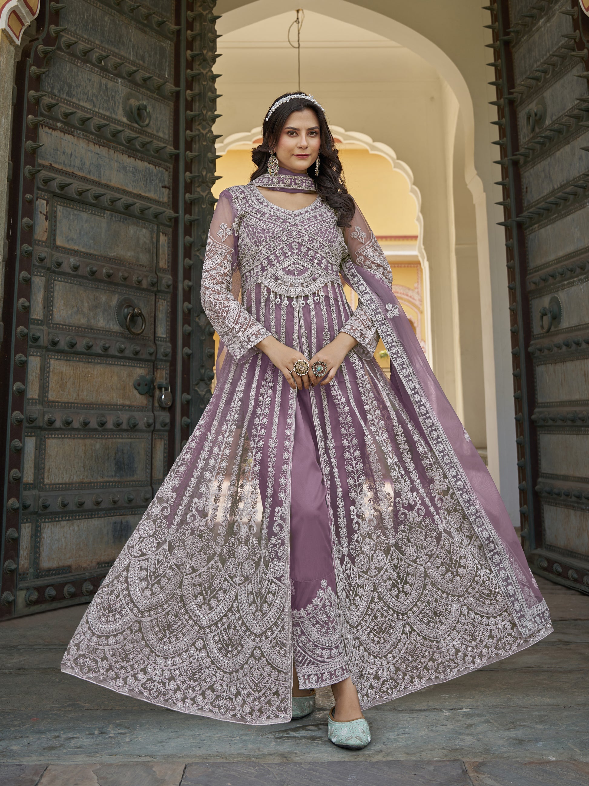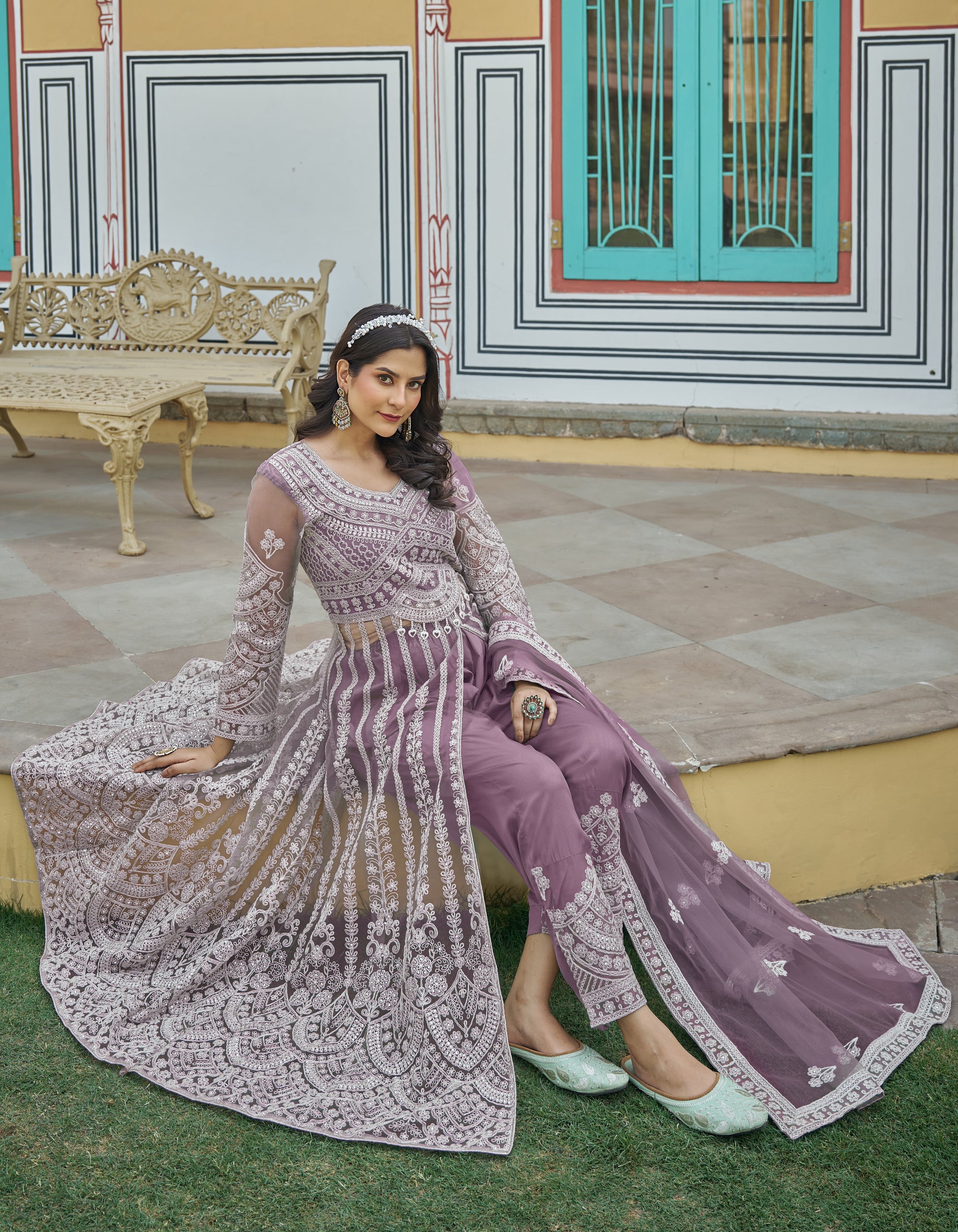 Robe Anarkali violet lilas en santoon avec pierres brillantes avec bas pantalon