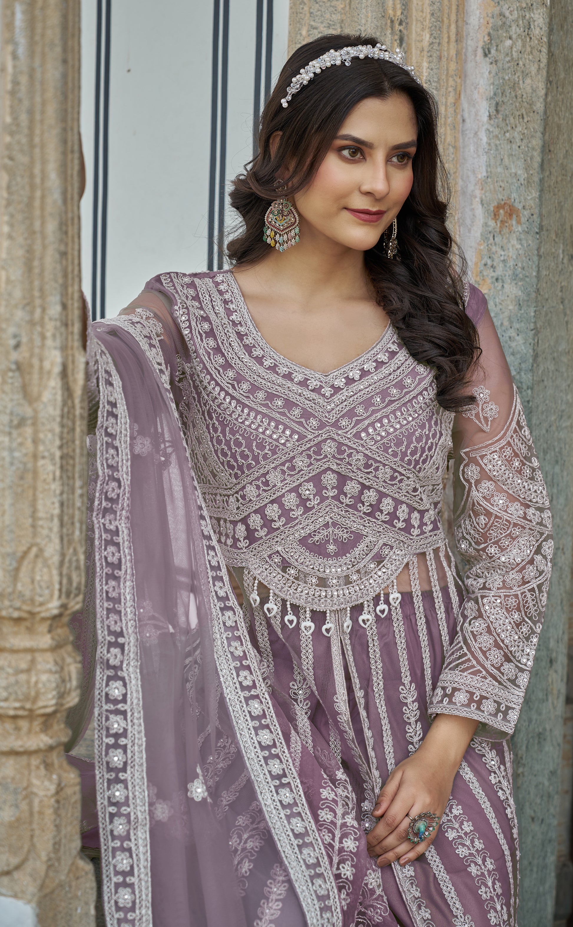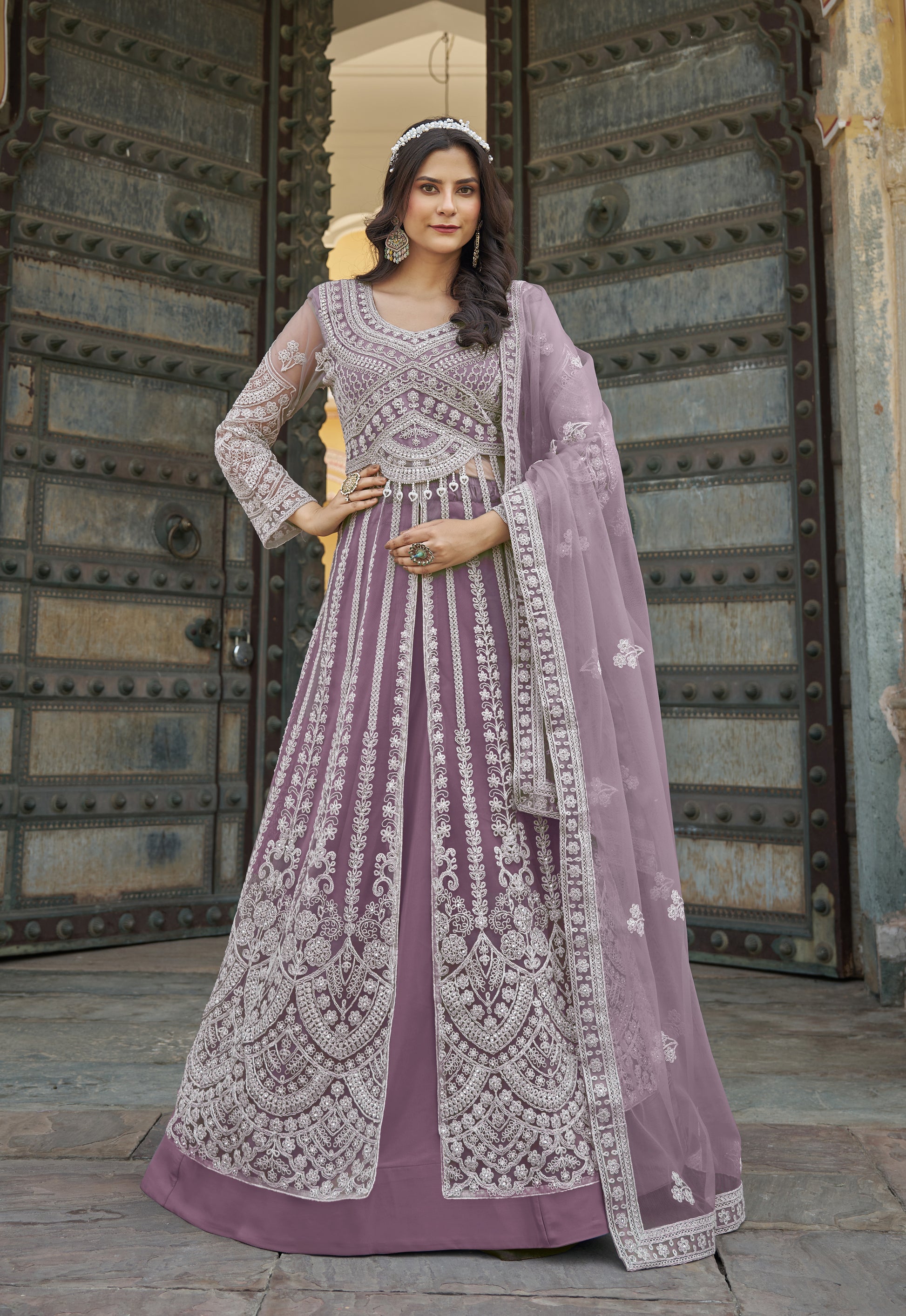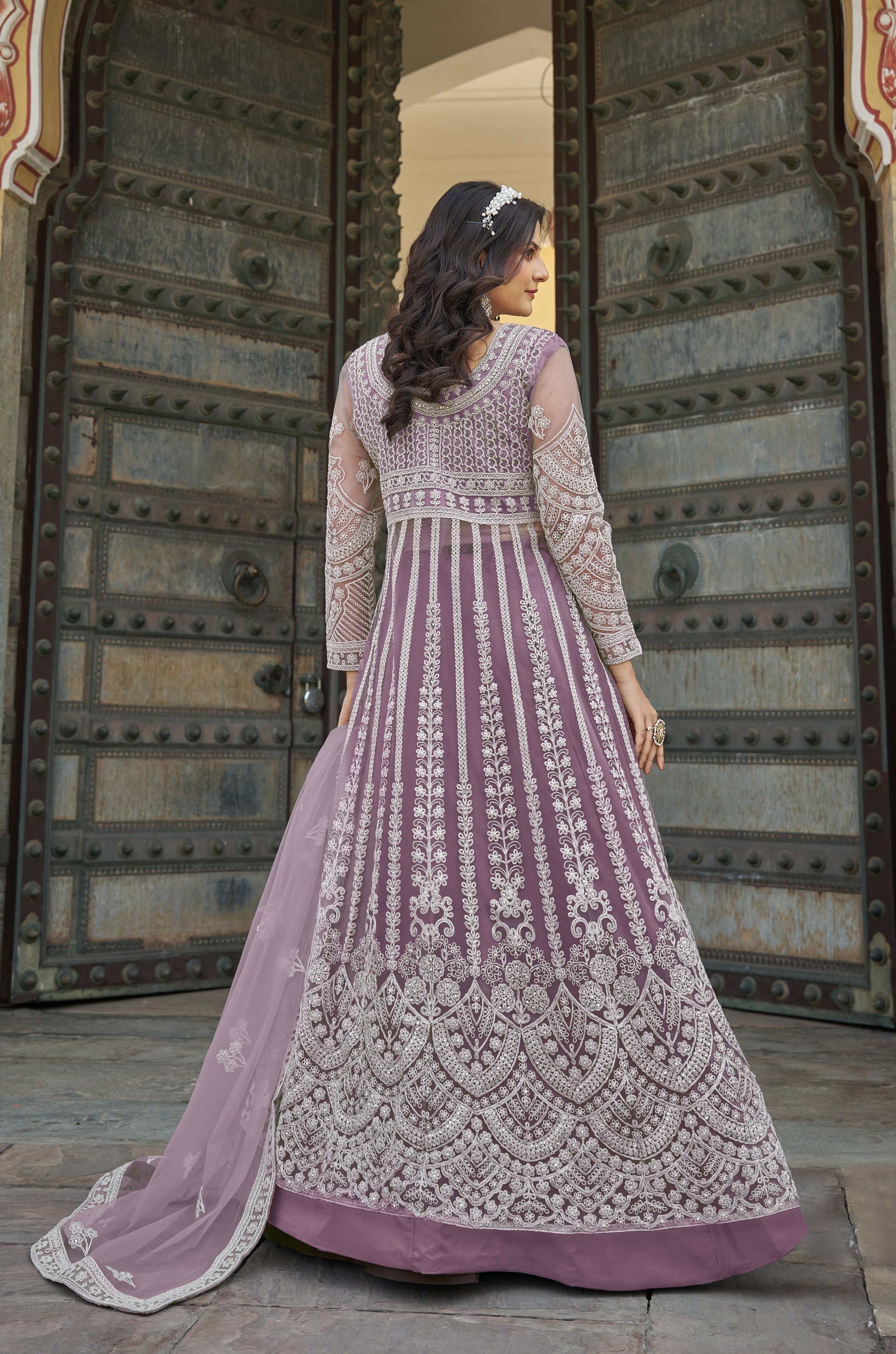 Préparez-vous à sublimer vos fêtes avec notre nouvelle tenue Anarkali ! Cet ensemble moderne marie raffinement et confort, avec son haut en Butterfly Net richement brodé à l’avant comme à l’arrière, rehaussé de délicates pierres scintillantes.