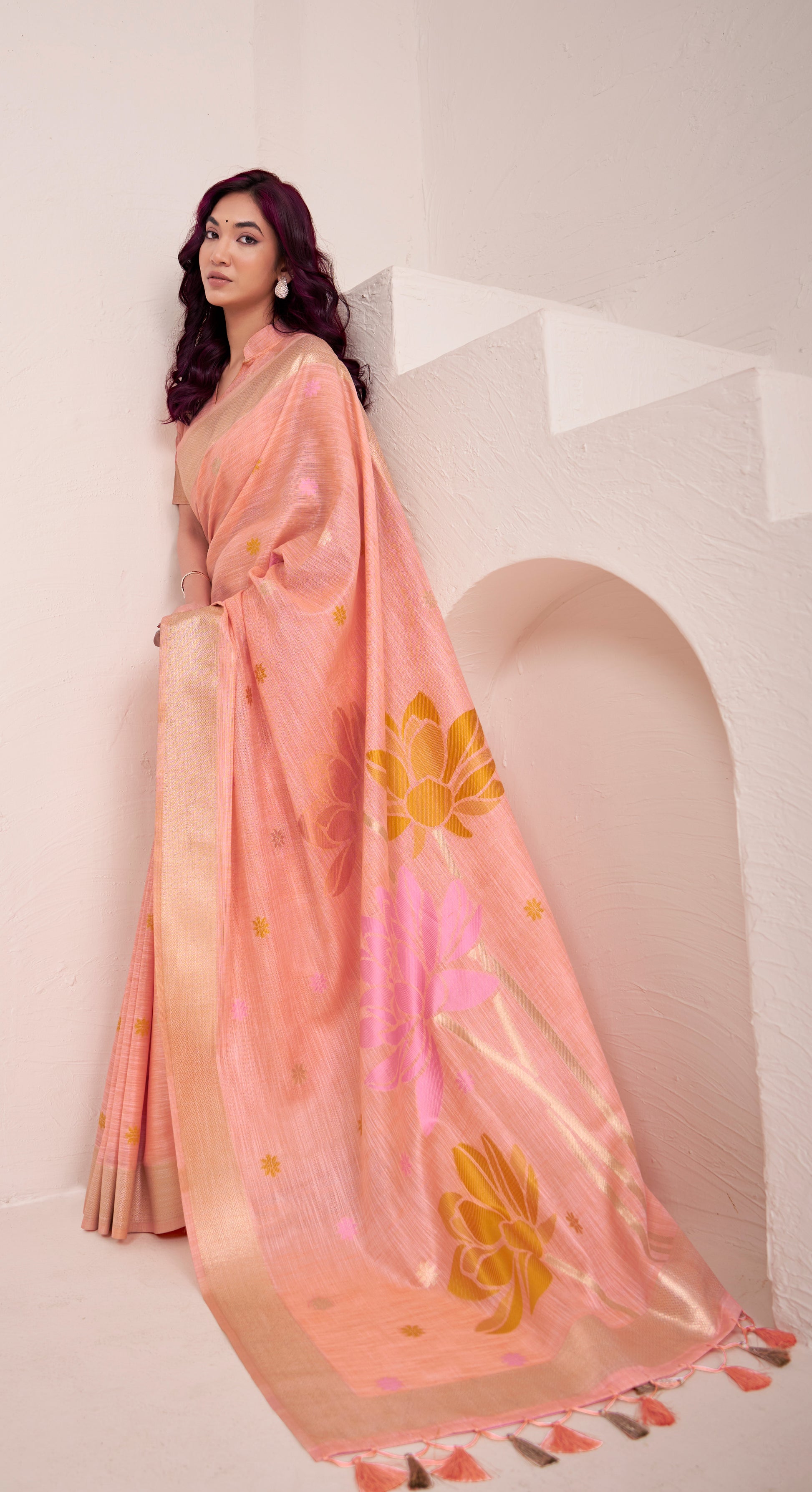 Sari rose saumon clair aux motifs romantiques de fleurs COLLECTION ISHITA