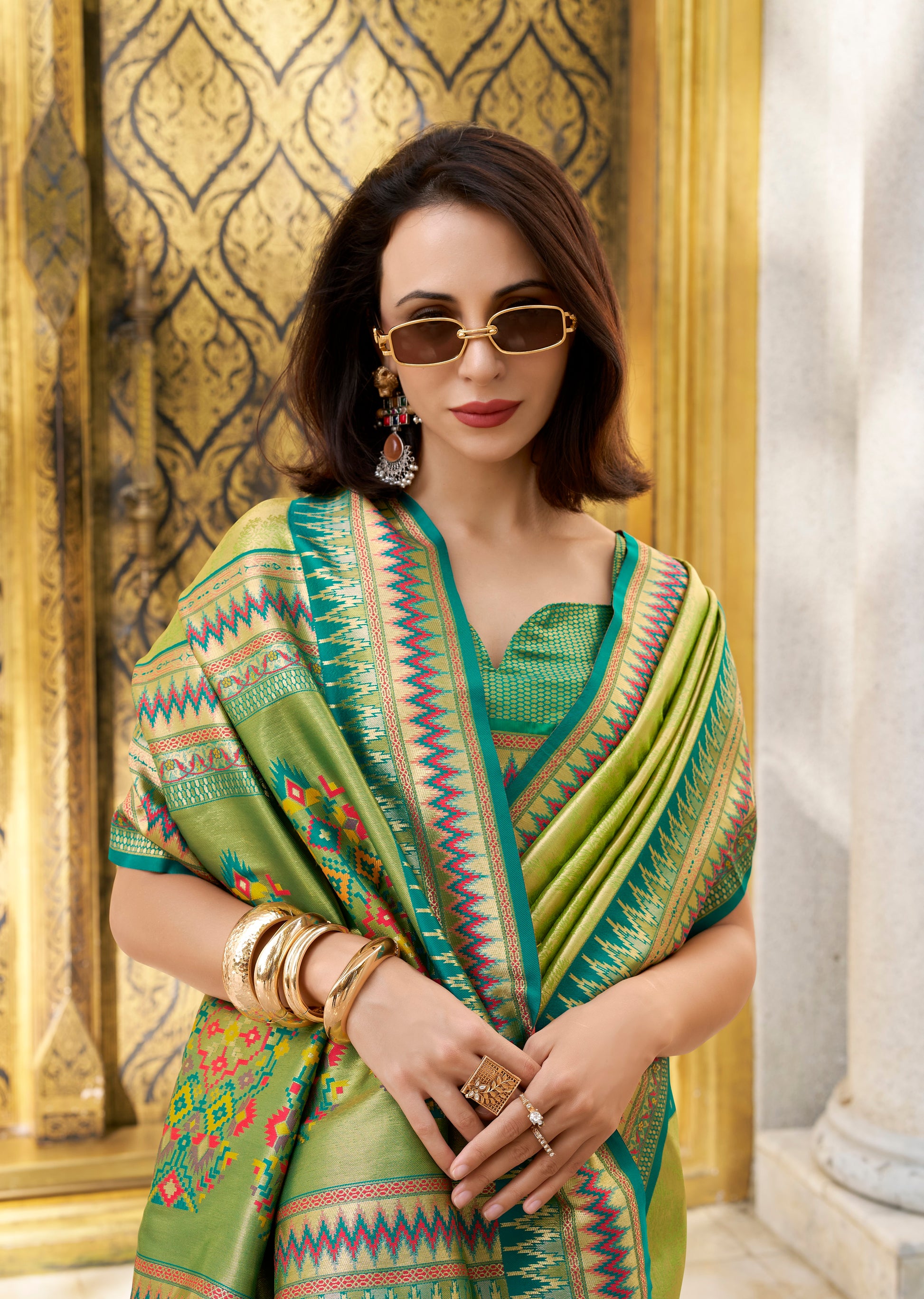 Sari en soie raffiné ethnique à bordure contrastée vert bleu multicolore Tradition COLLECTION RADHIKA
