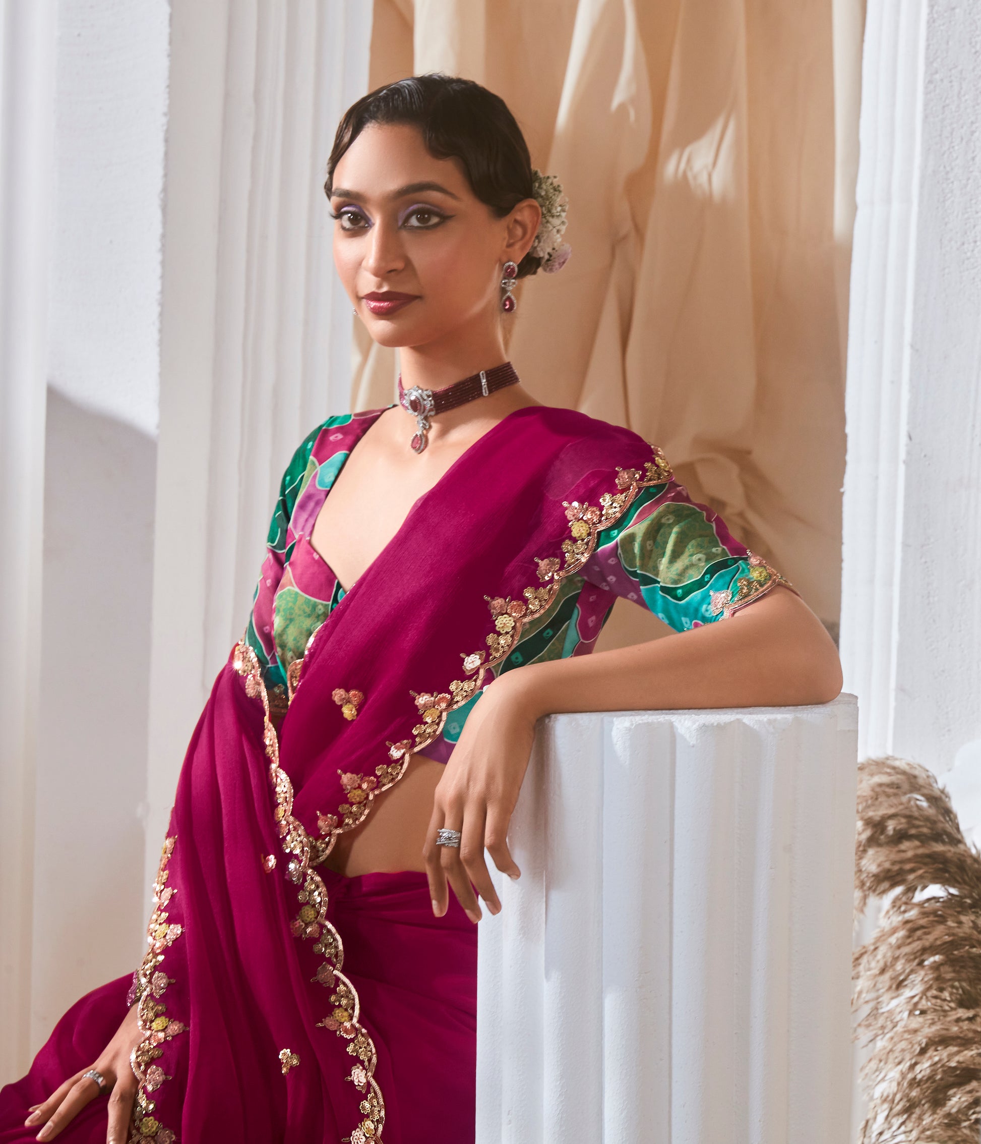 Redéfinissez votre style avec ce sari contemporain au tombé fluide, issu de la COLLECTION KANIKA. Les bordures sont sublimées par un travail de pierres et s’accompagnent d’une blouse coordonnée en impression floral, également ornée de dentelle assortie sur les manches. Entre textures royales, motifs traditionnels et silhouette qui honore la tradition tout en s’adaptant à l’air du temps, cette collection incarne l’élégance moderne.
